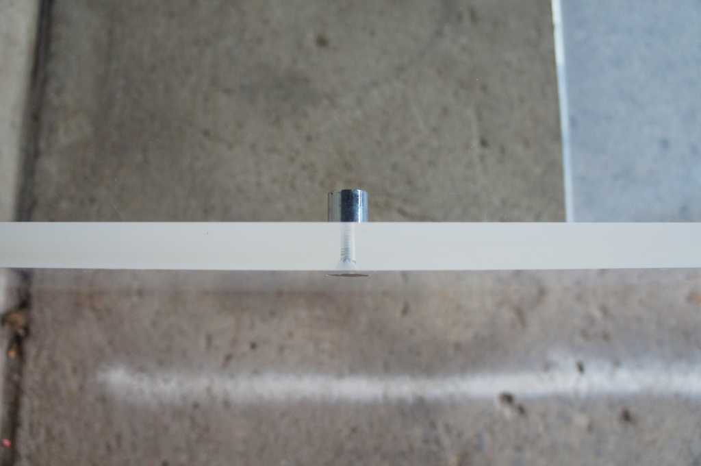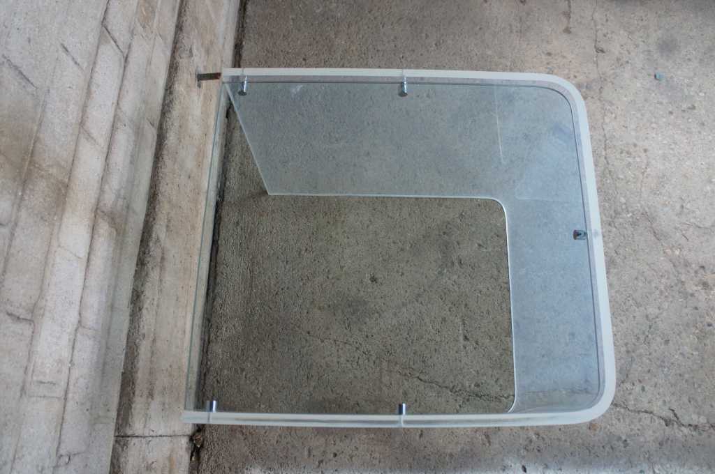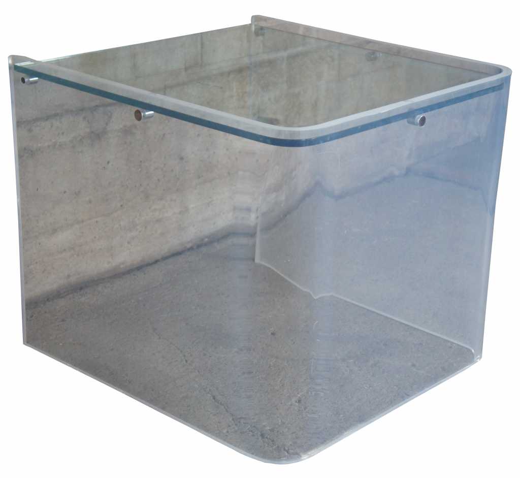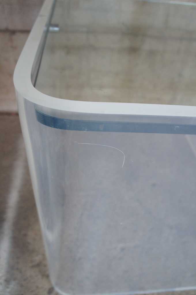 Mid century U formed acrylic or lucite side table with glass top. Glass top is supported by five chrome pins. Glass features a polished edge.
