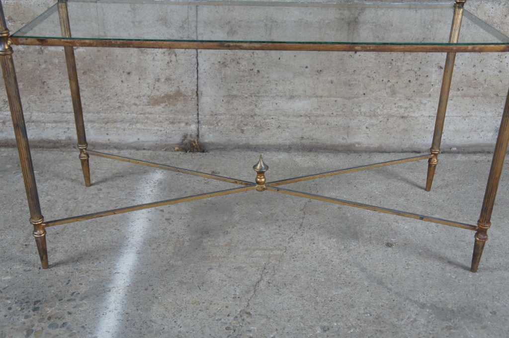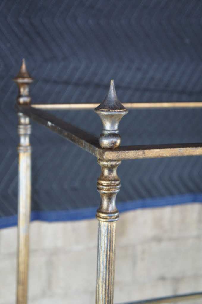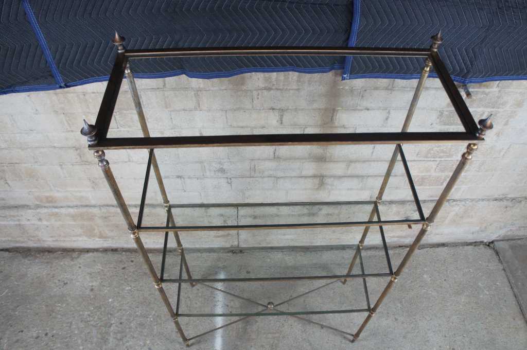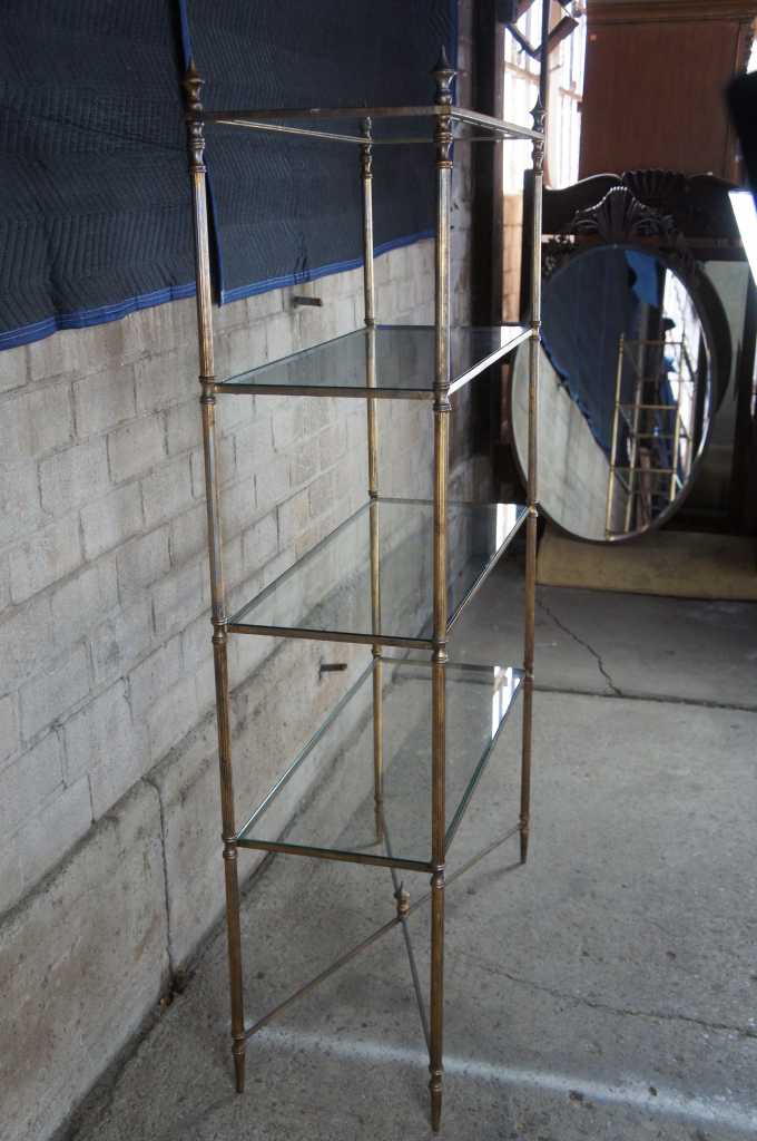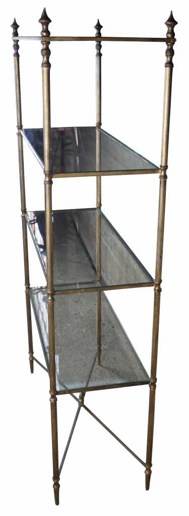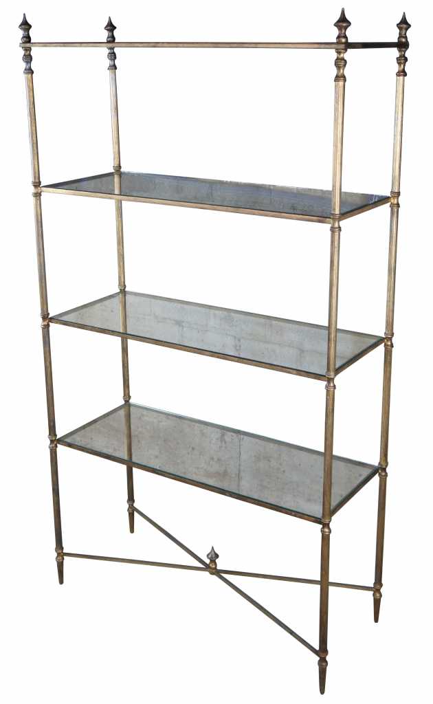 Neoclassical or Directoire inspired etagere. Made from iron with four glass shelves and finished in antique gold.