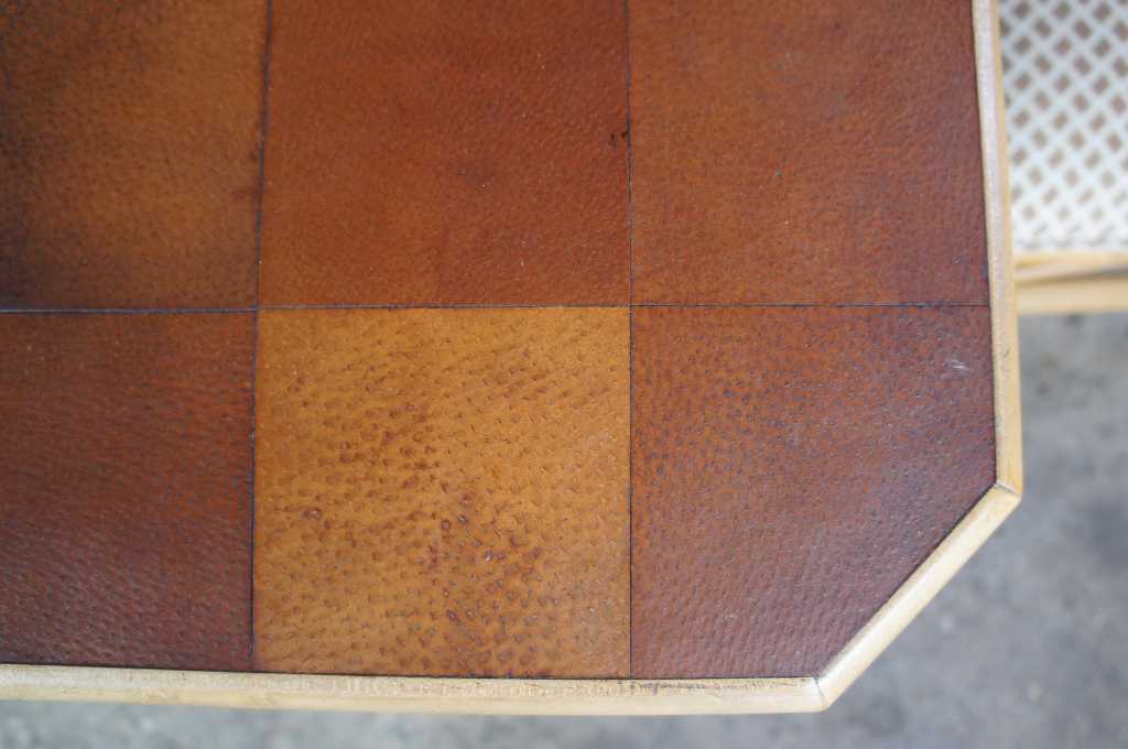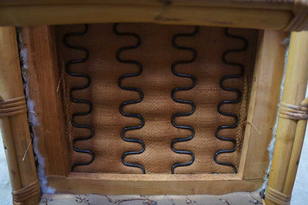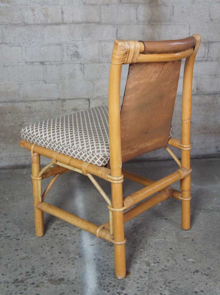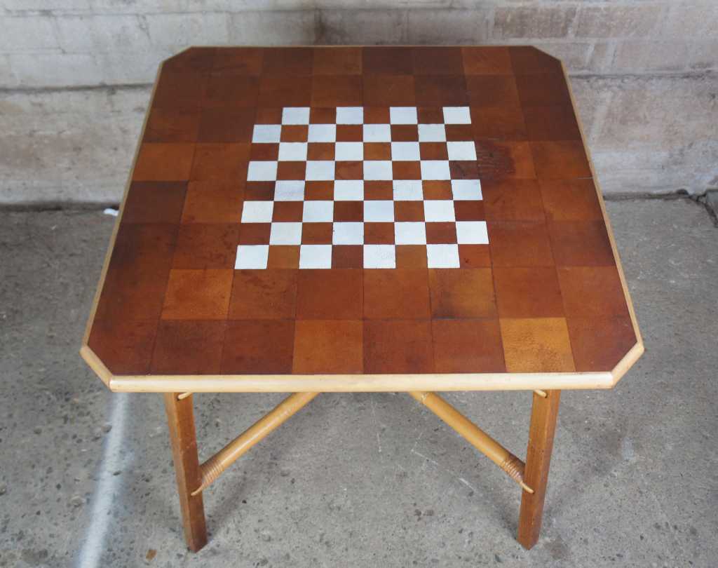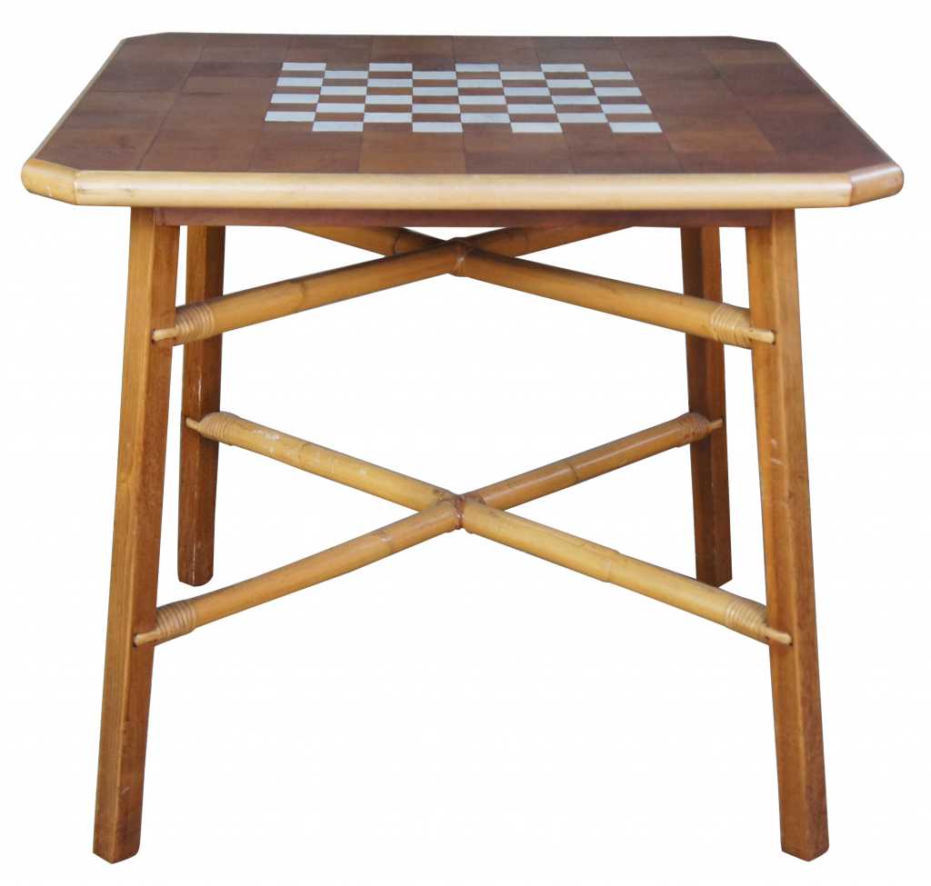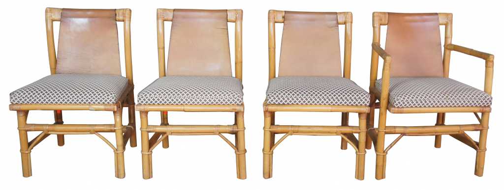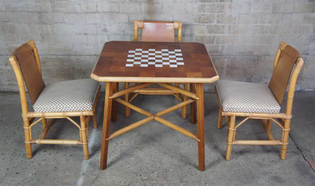 One of a kind game table, made from Bamboo, Rattan, Leather and Wood. At the center is the perfect chess table with leather top and crossform bamboo base. Chairs have a leather back with upholstered seat supported by sinuous springs.