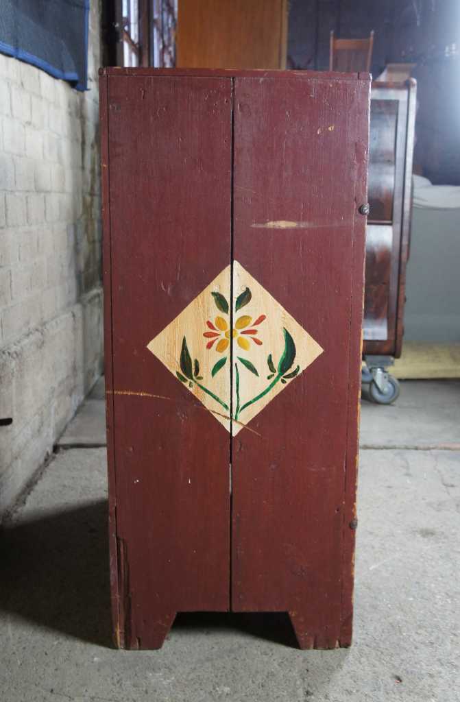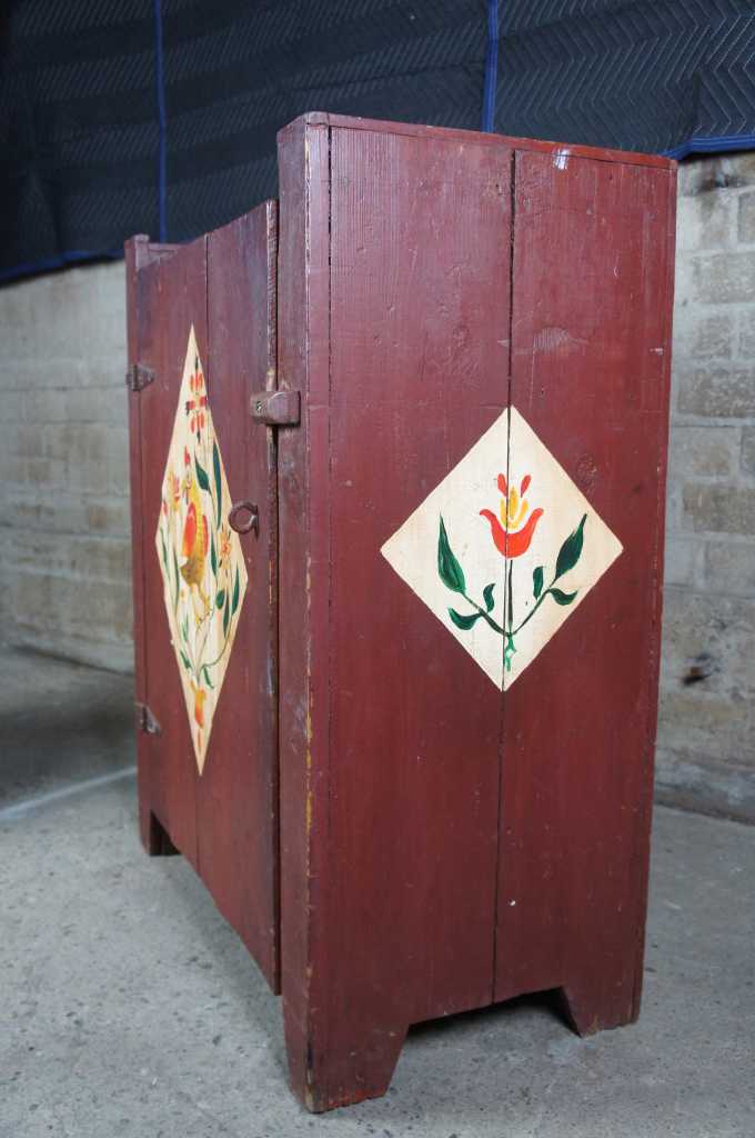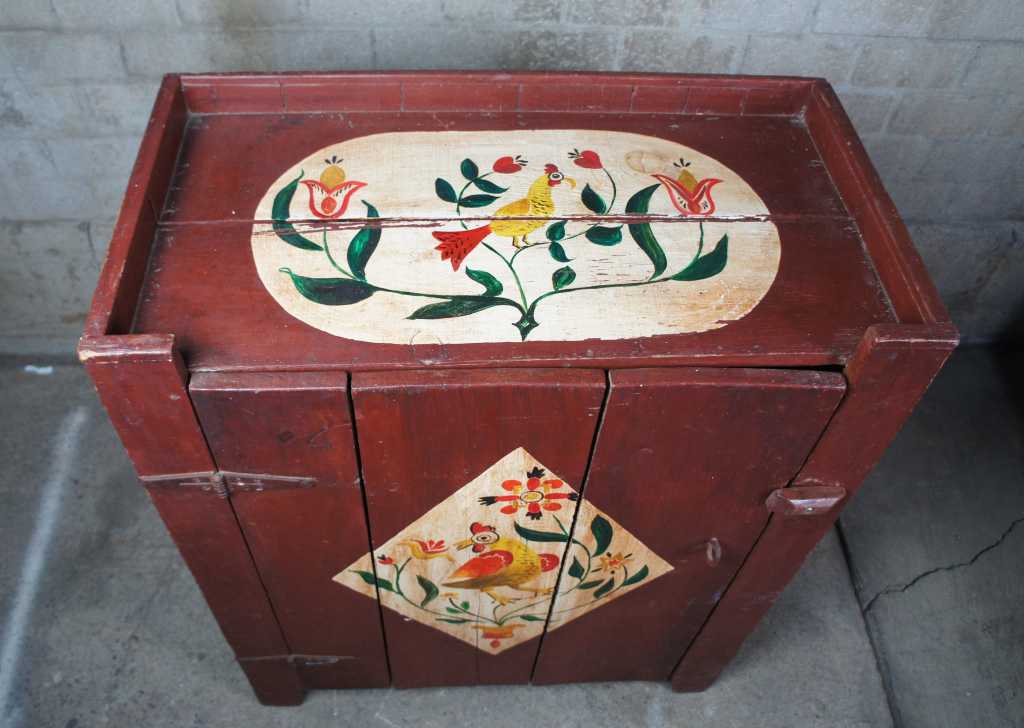 Primitive pine painted cupboard, features a cock painting along the front. Great for use in kitchen or farmhouse setting. Features inset top and hinged door, kept shut with latch, three shelves on inner.
