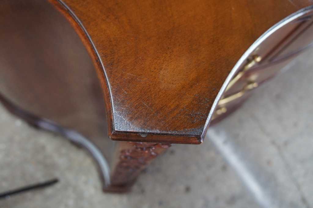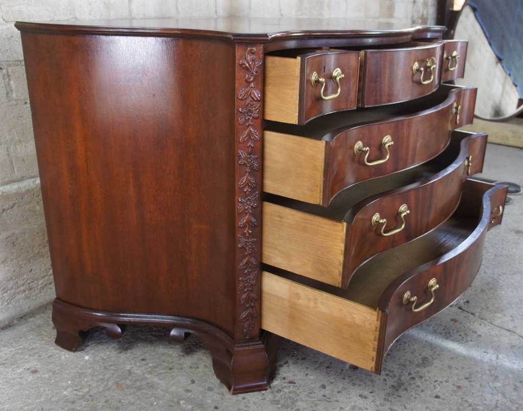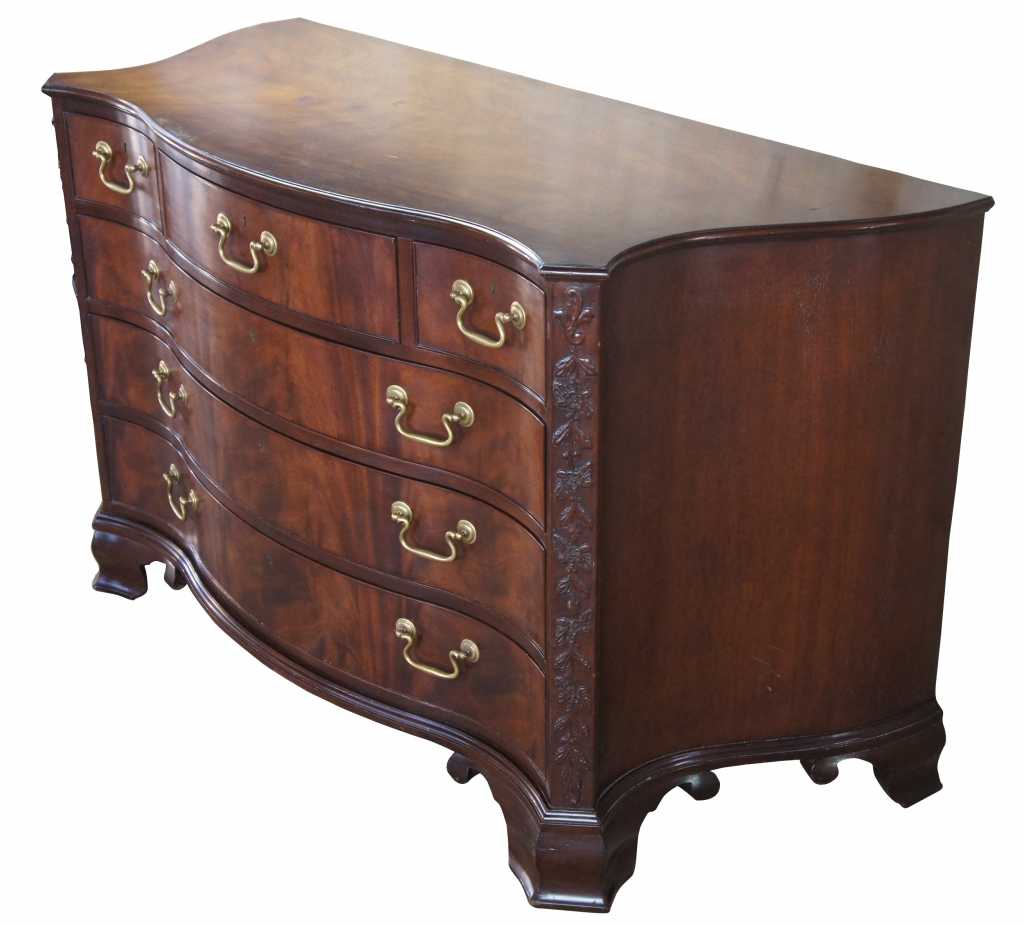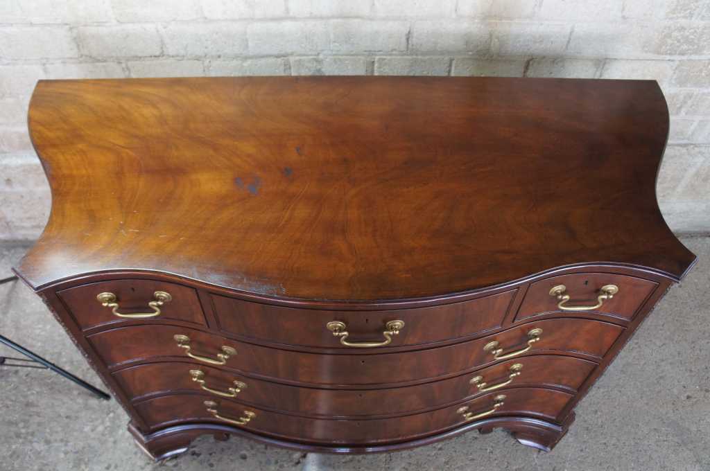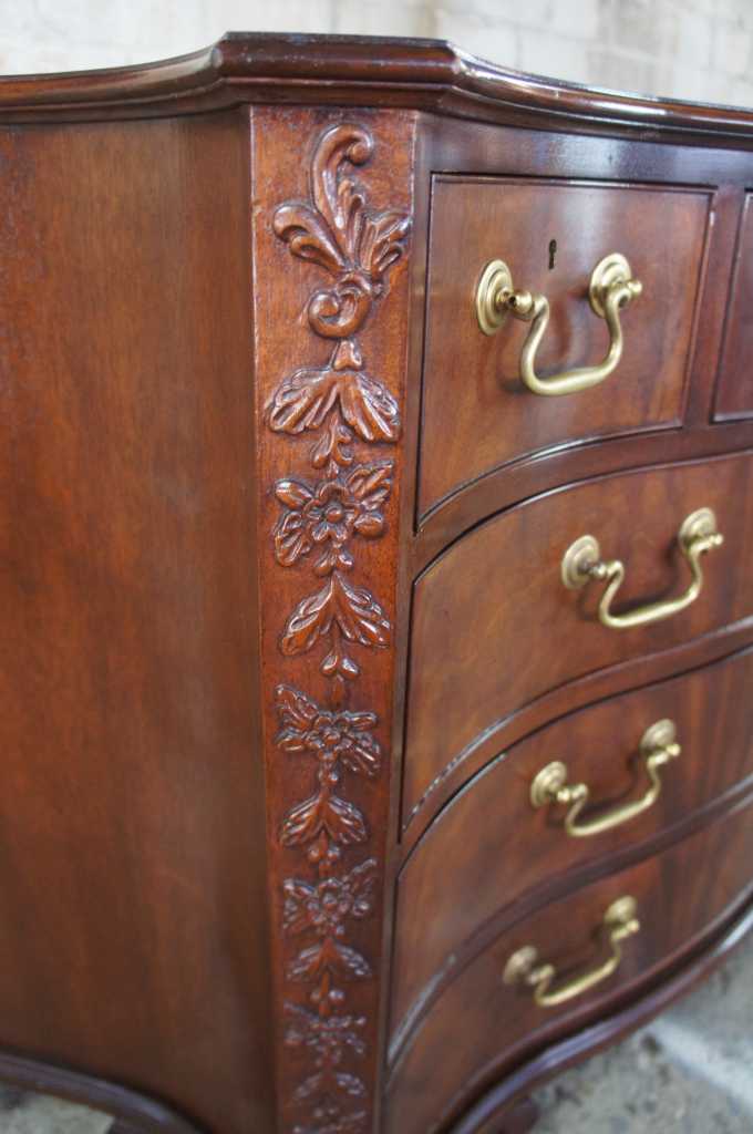 Baker Stately Homes serpentine chest. A fine chippendale serpentine carved mahogany chest, with moulded border to the shaped top, fitted with three short drawers and three graduated long drawers, the canted angles finely carved with trailing flowers and berried foliage, on boldly shaped ogee bracket feet. Baker Furniture Company, established 1891. This piece is from the Stately Homes of England and Scotland Collection, selected by Sir Humphrey Wakefield. Province The Lord Clifford of Chudleigh Ugbrook Castle.