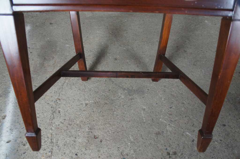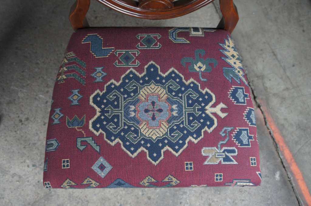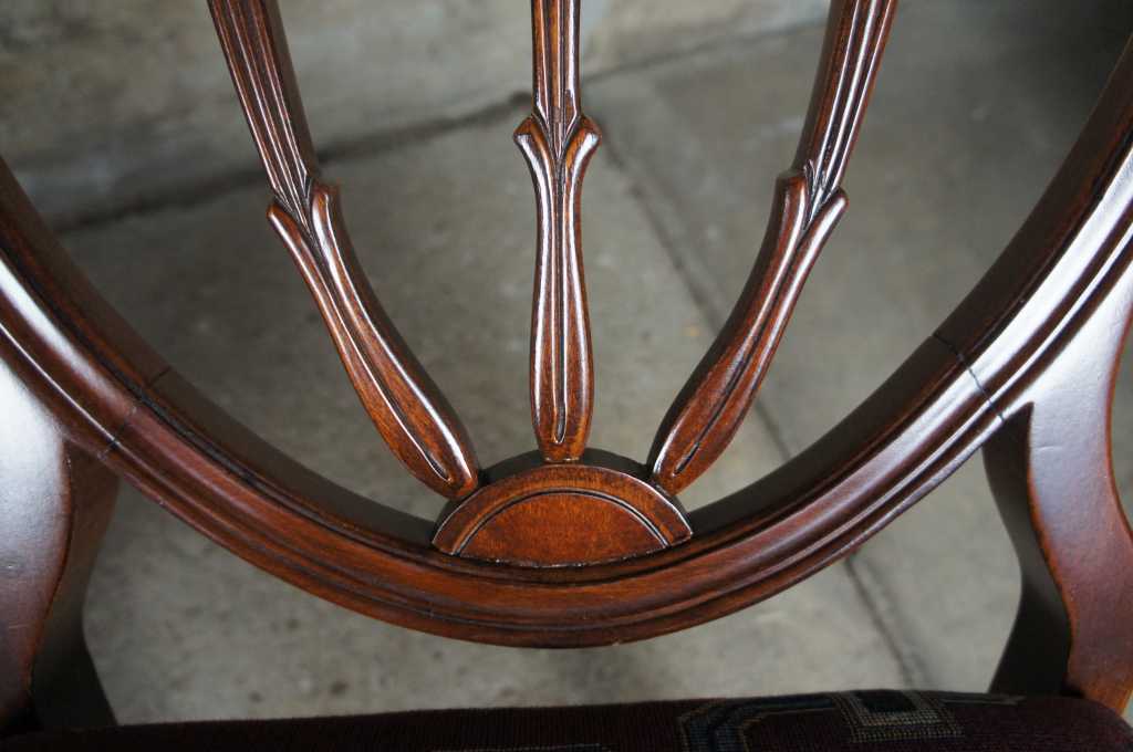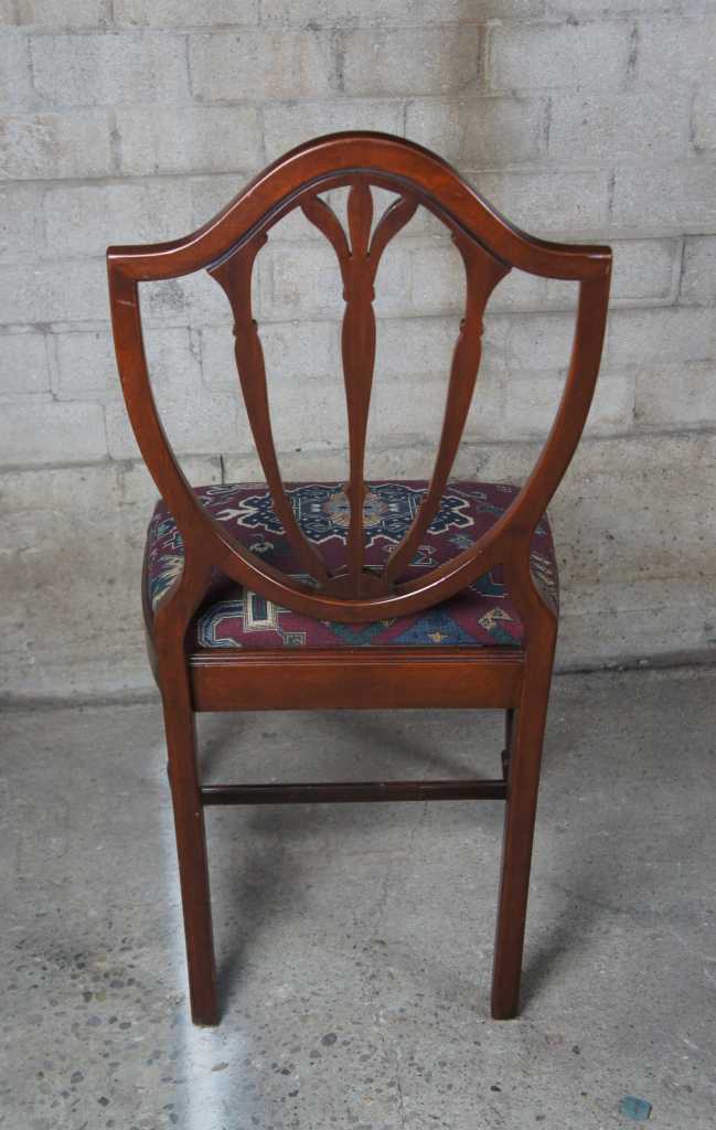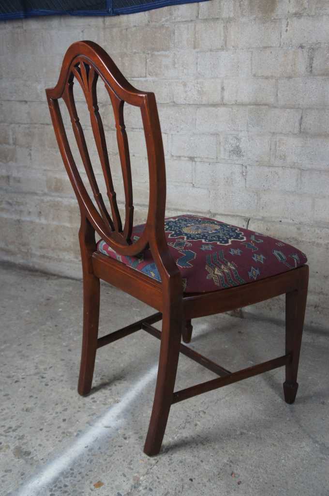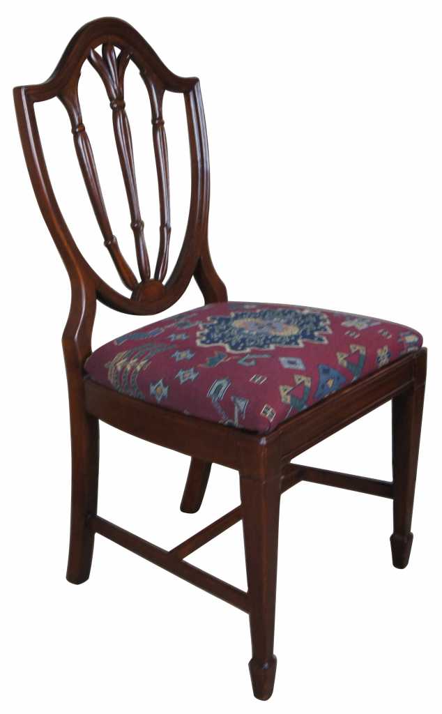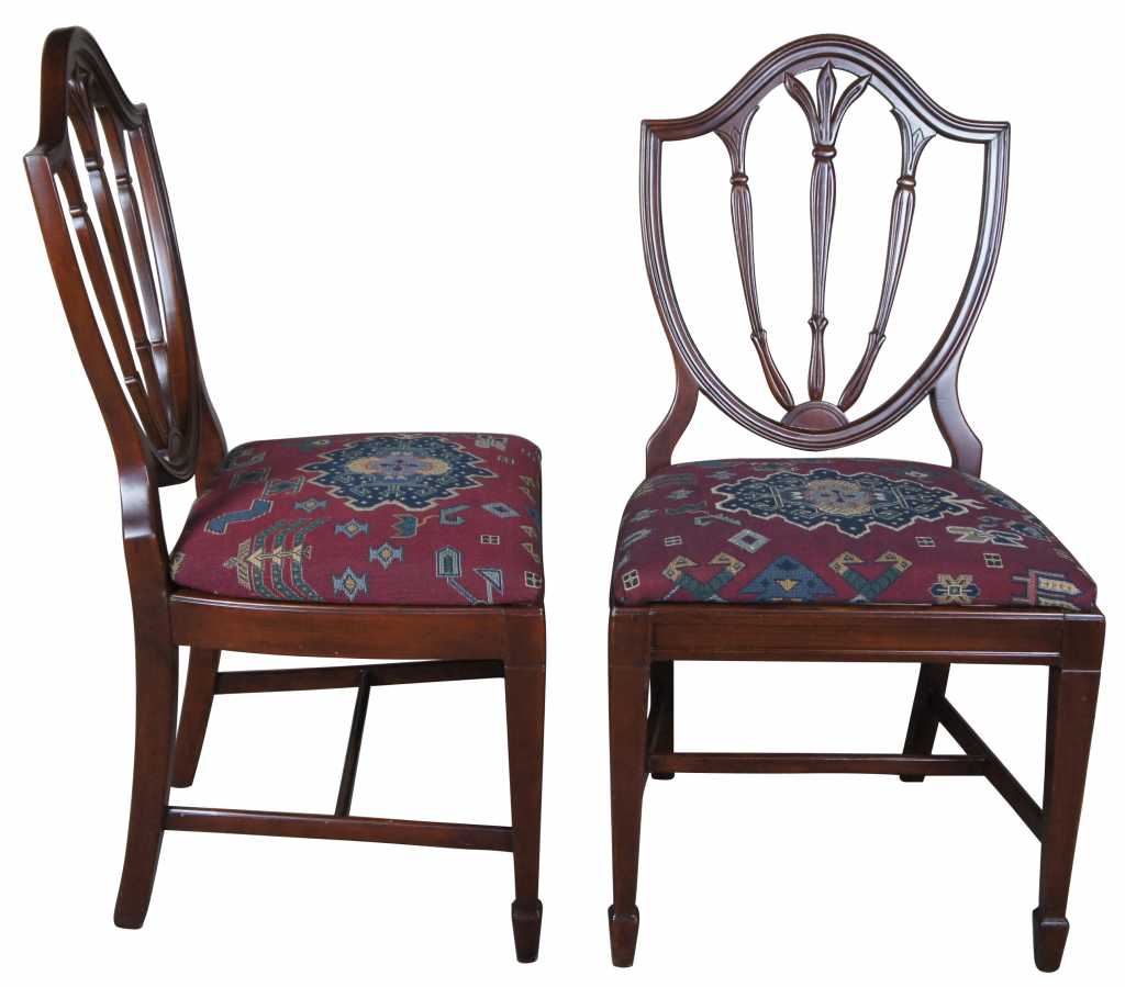 Gorgeous pair of antique shield back dining or accent chairs. Made from mahogany with carved back and tapered legs leading to spade foot. Upholstered in southwestern fabric with medallion center.