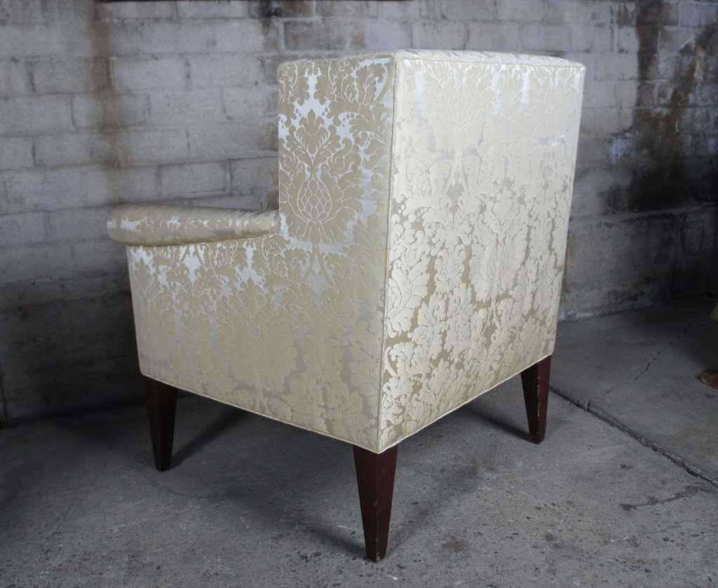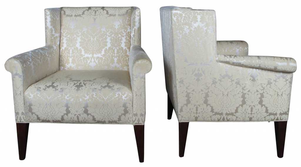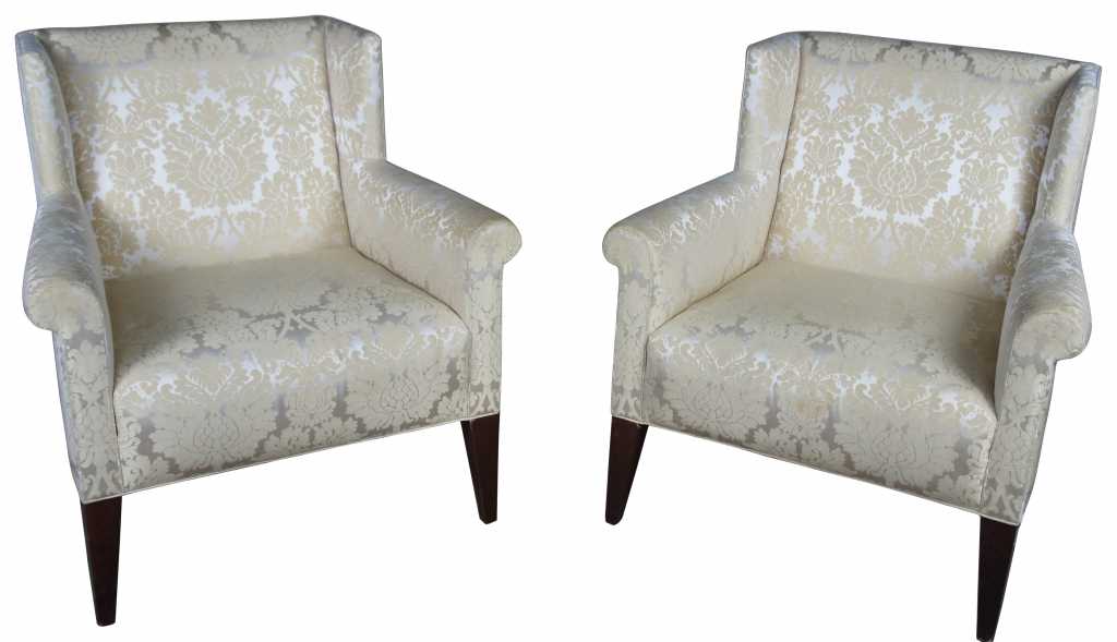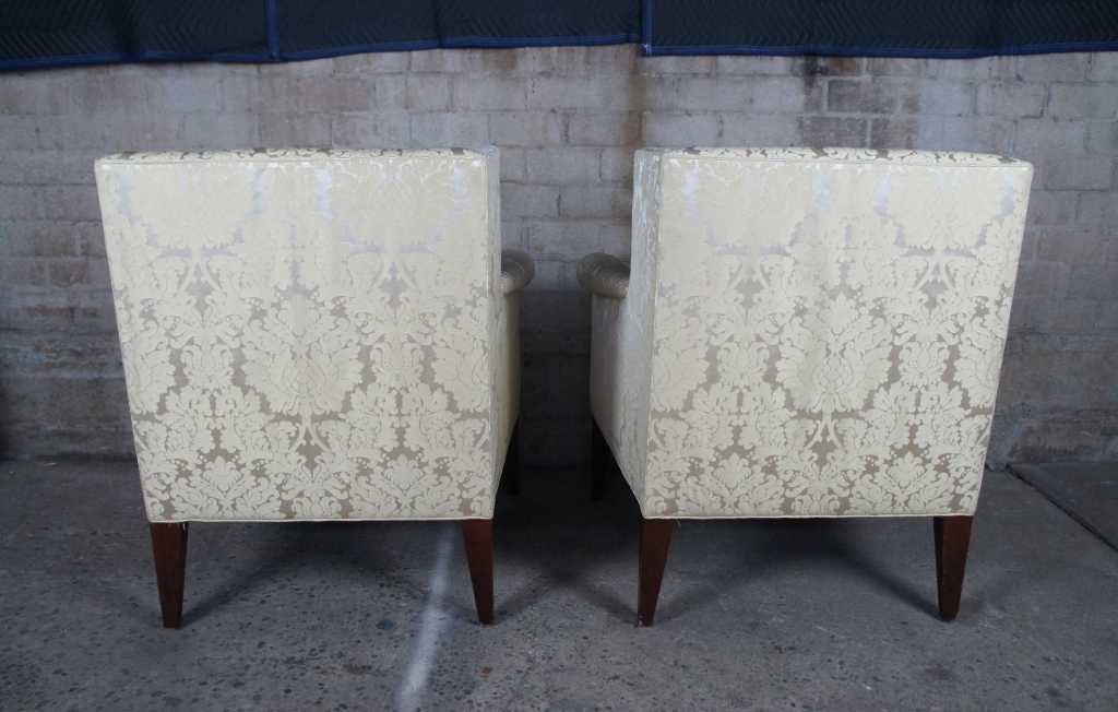 Beautiful pair of Baker Furniture Archetype Collection wingback club arm chairs. Features bright scalamandre floral pattern fabric in champaign color. Rests upon tapered mahogany legs.