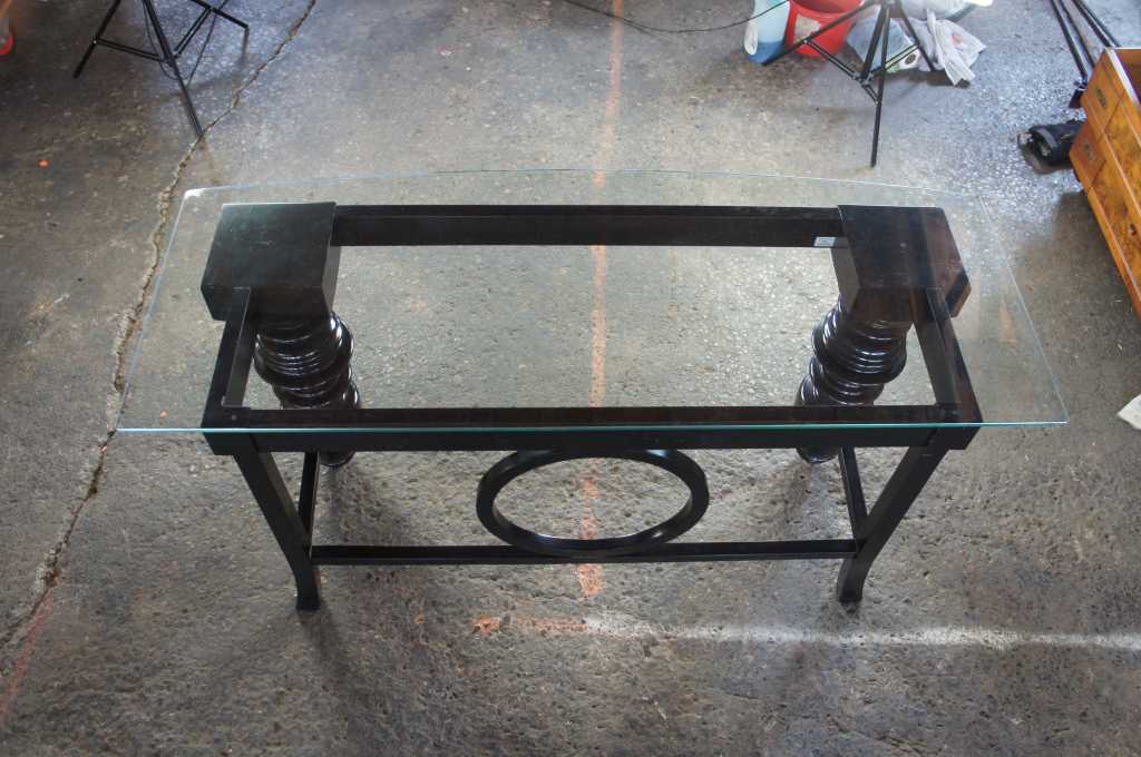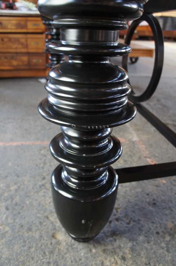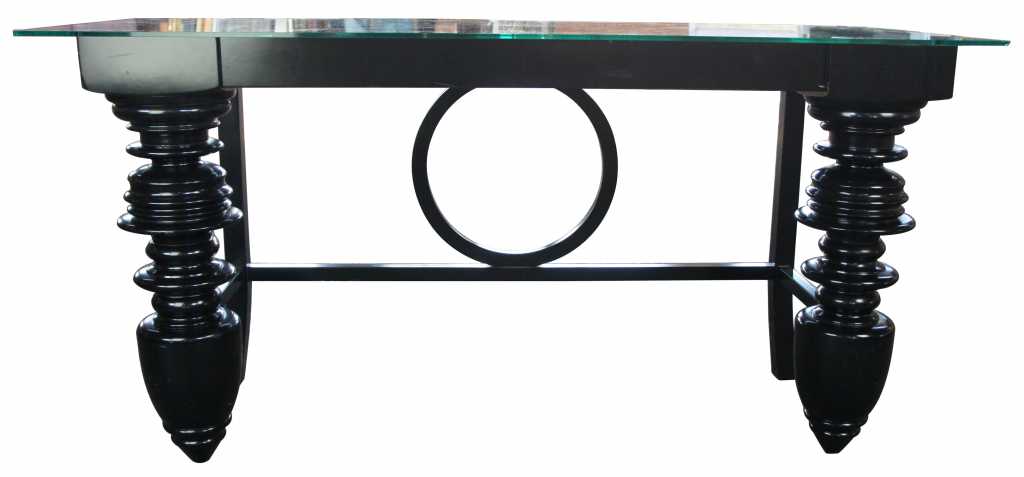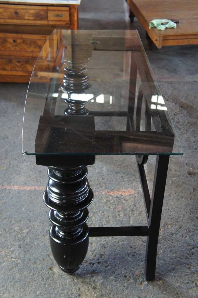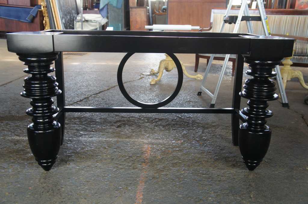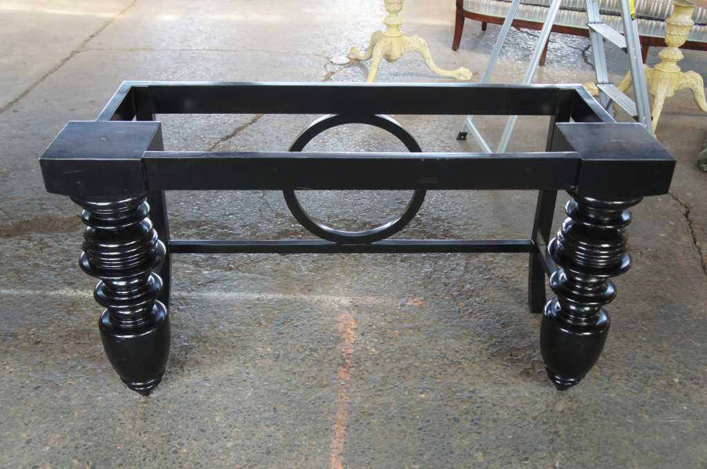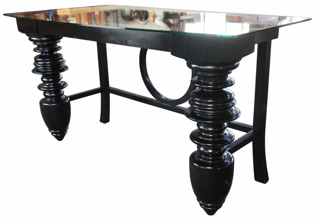 Transitional or modern desk or library table. Finished in black with bulbous turned front legs and streamlined open backside. Orignianly purchased from Ladiff in Richmond Virginia.