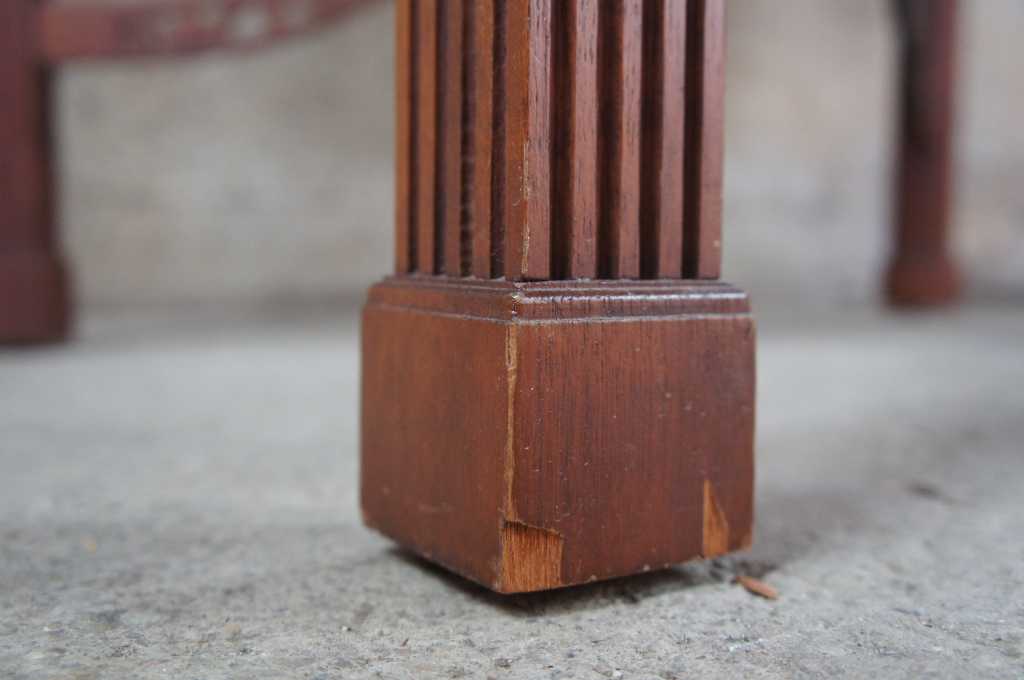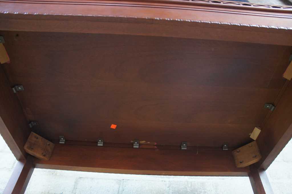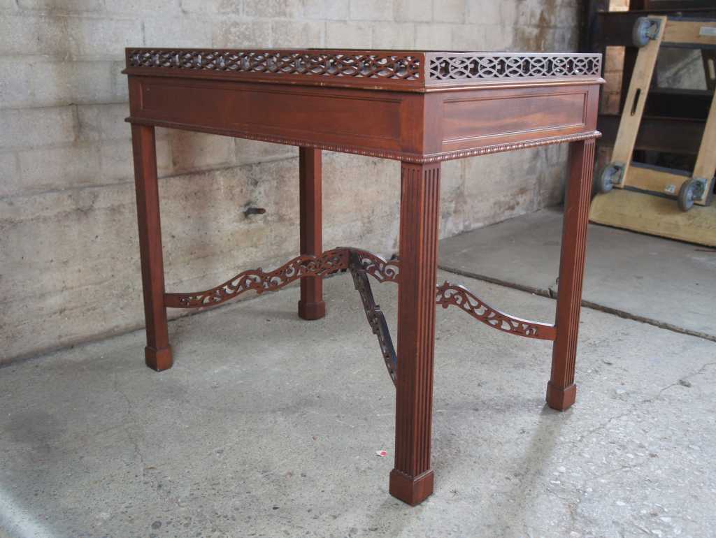 20th century mahogany chippendale style table. Features pierced fretwork along the upper trim and lower jointed streatchers. Table is supported by fluted legs with block feet.