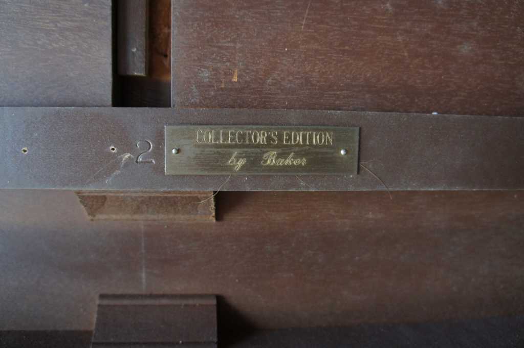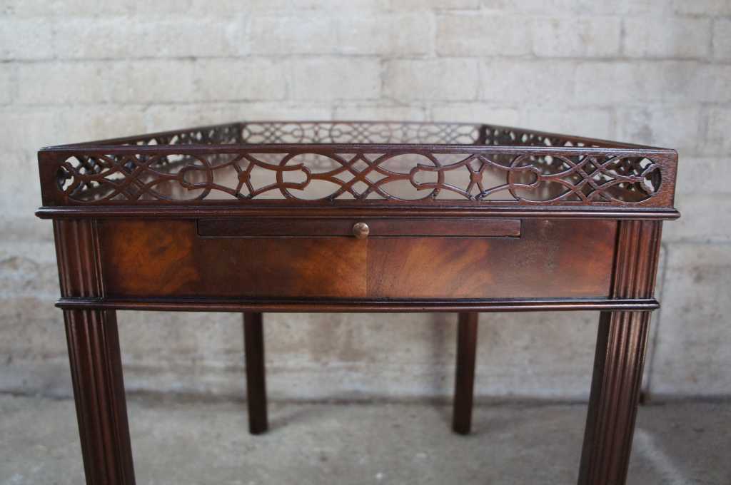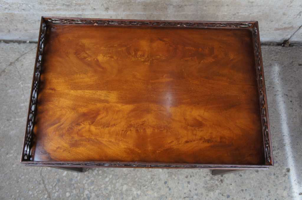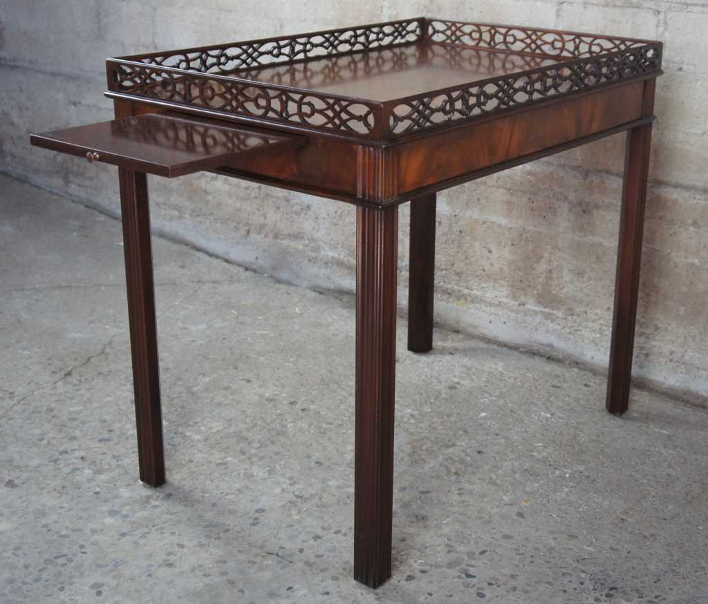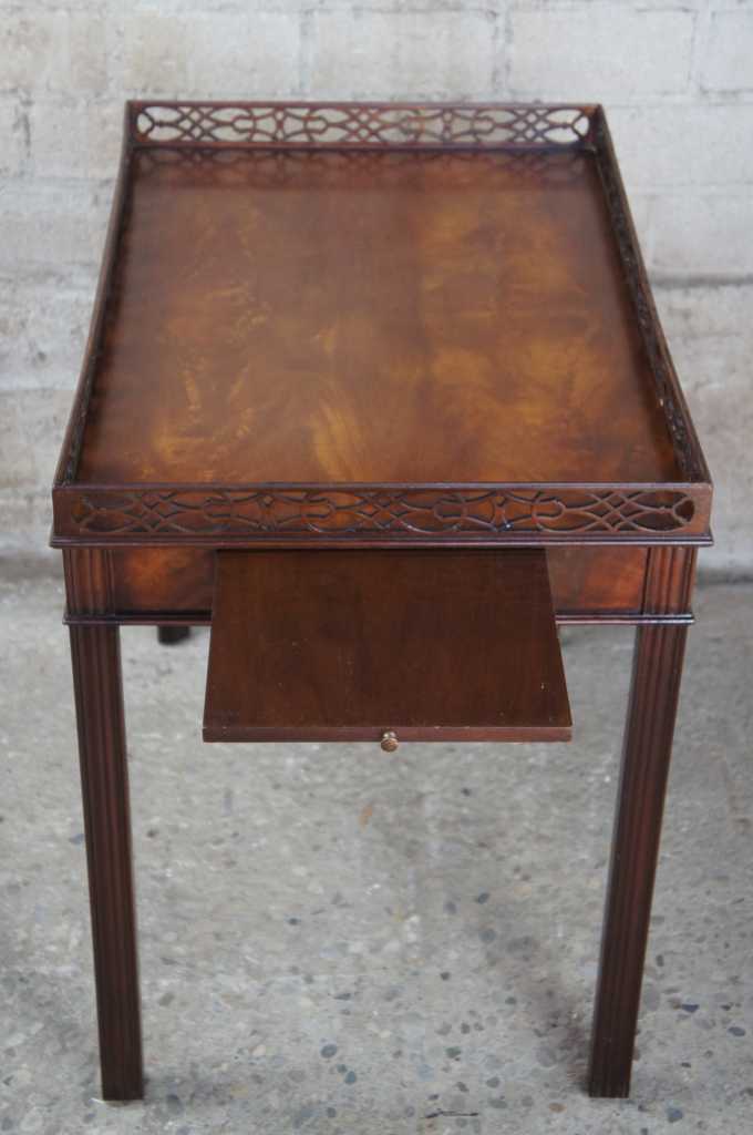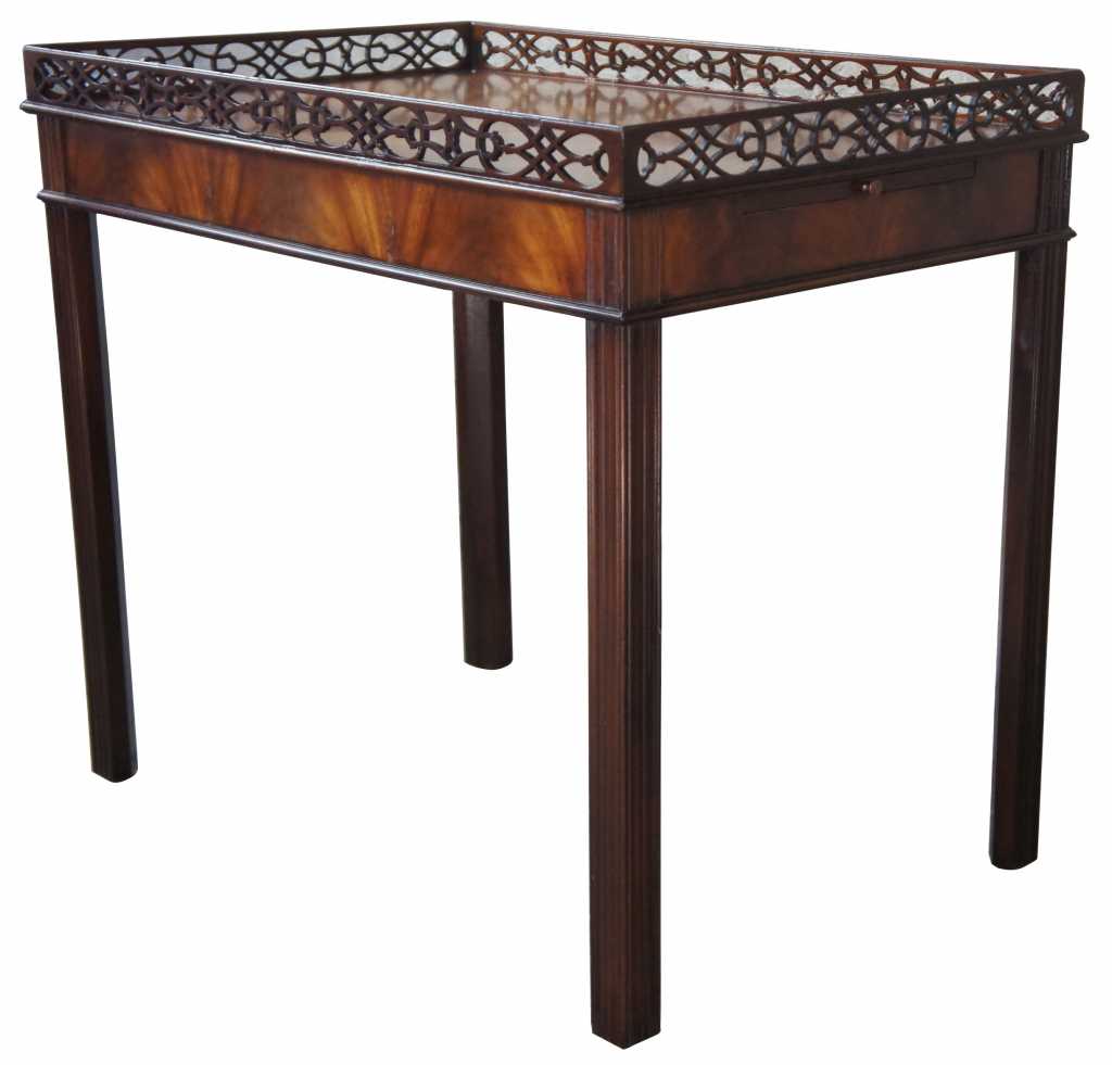 The Collectors Edition by Baker Furniture is inspired by iconic chippendale styling with a raised gallery of carved fretwork over a matchbook veneered top. Two pull out trays support the four fluted legs.