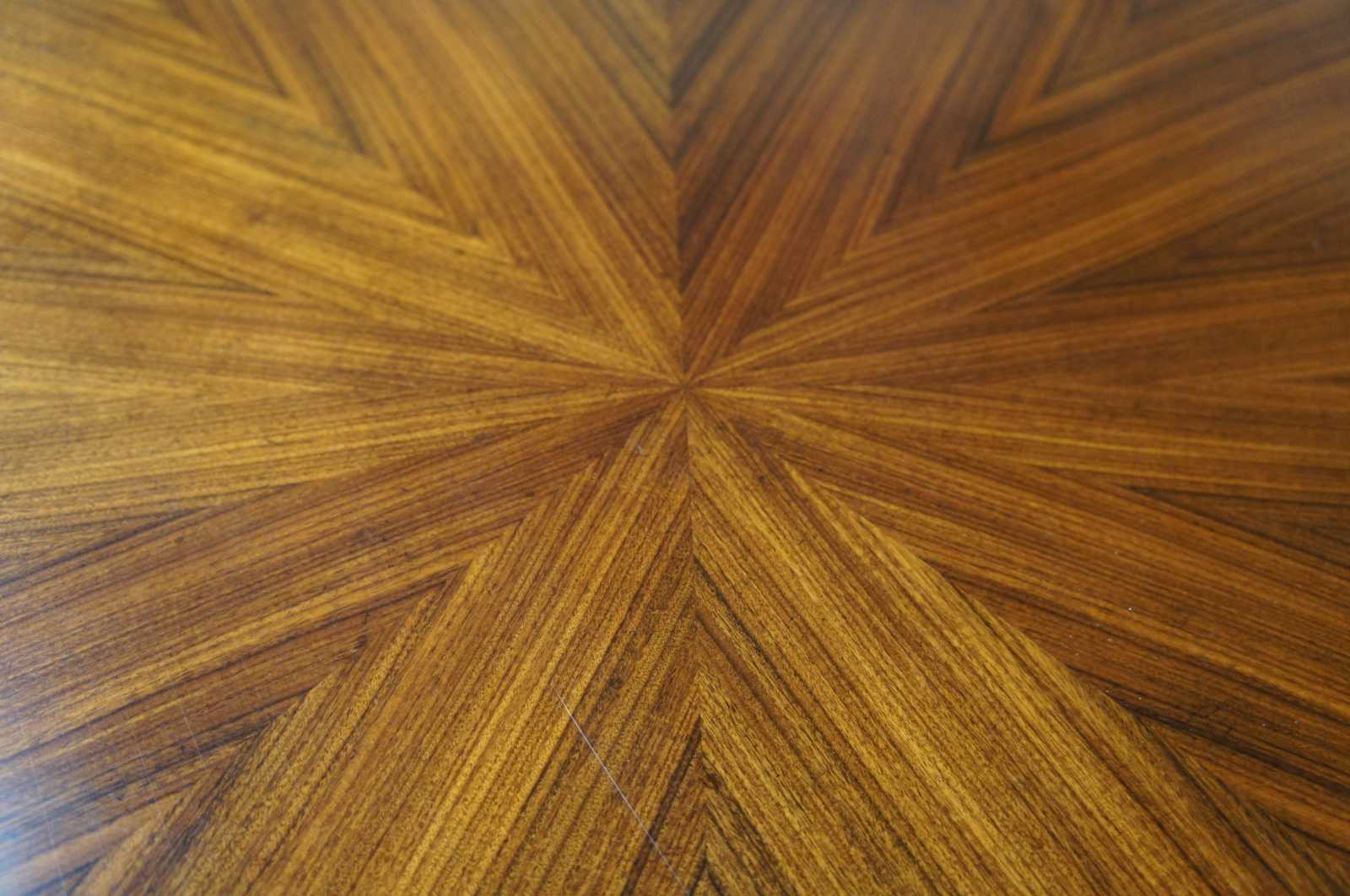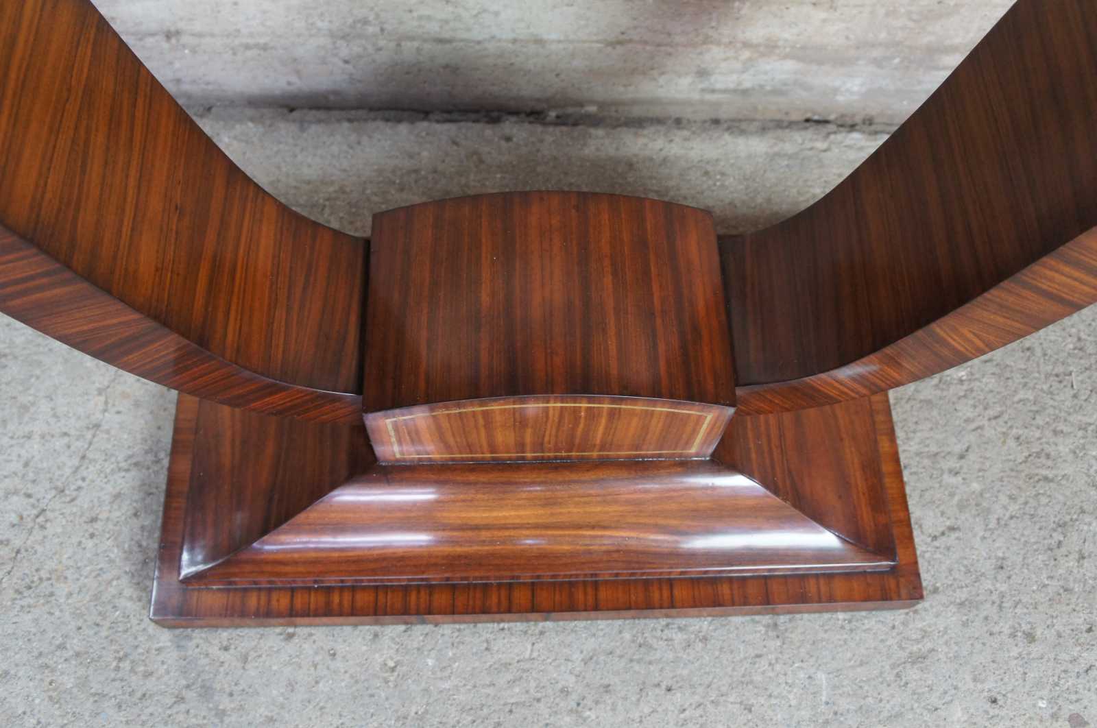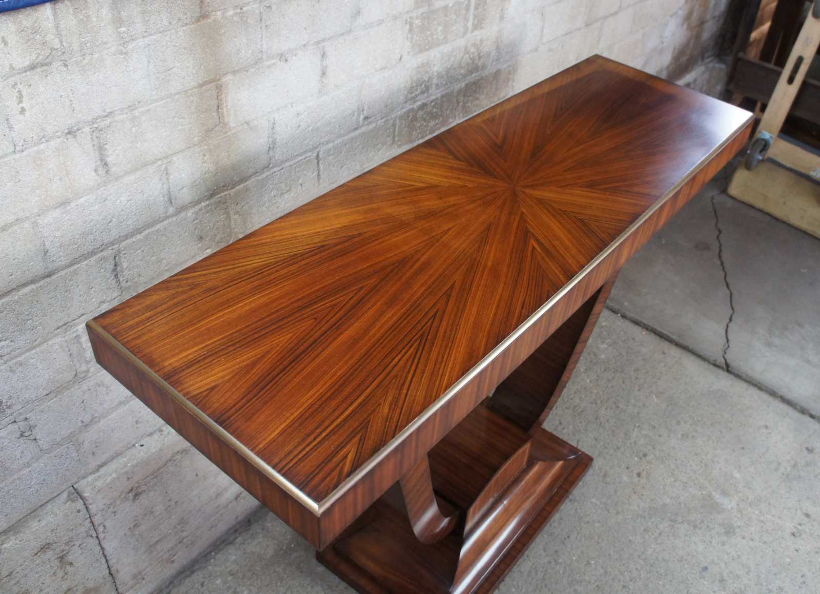 Fine French Art Deco styling with exotic Morado veneers and brass strung accenting. Features an in-swept tulip body and stepped plinth base. We have two available, second one needs some trim work to the brass.