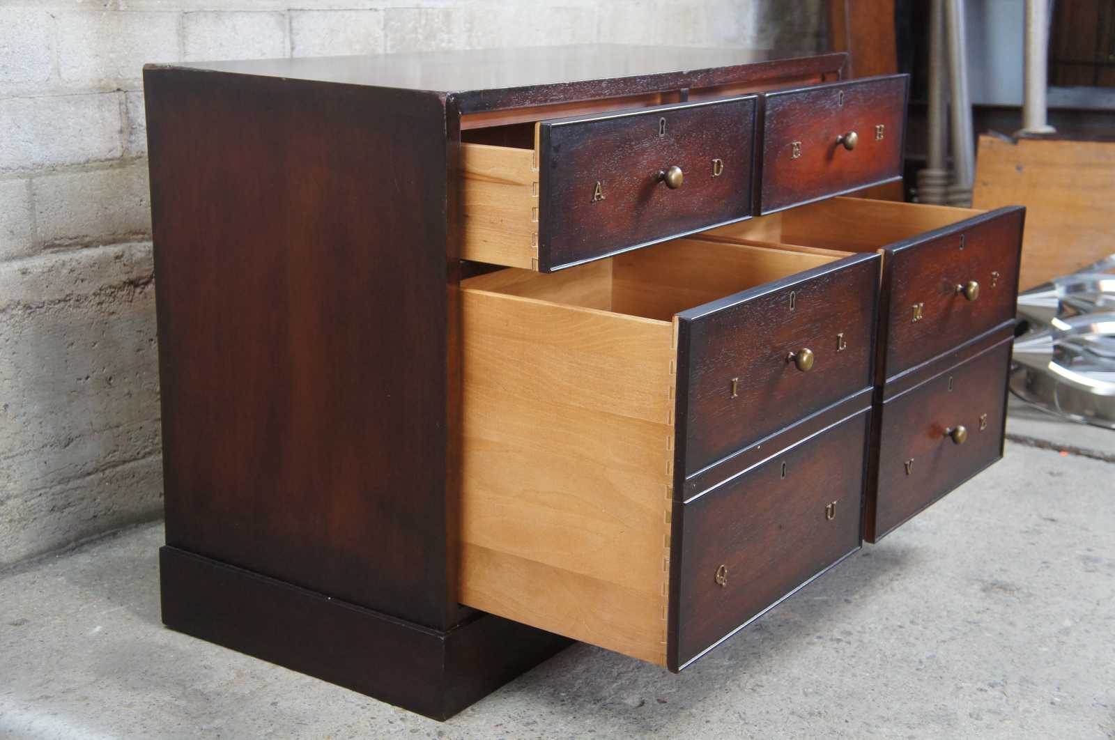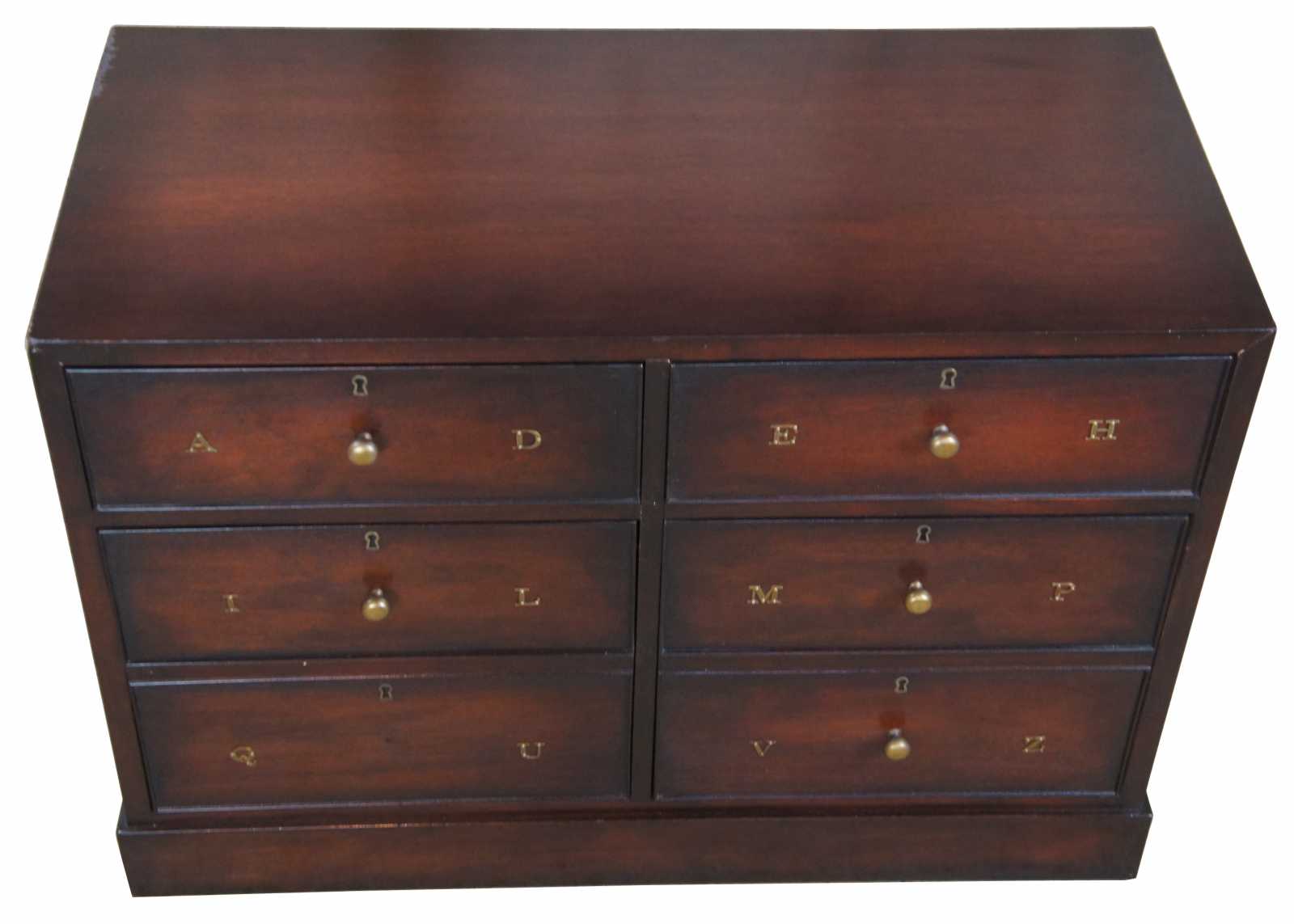 The New Bohemian Chest by Ralph Lauren. Features an A through Z brass accent file cabinet motif, but its actually a dresser or chest of four drawers.