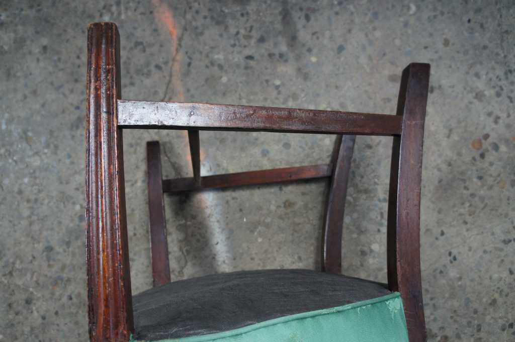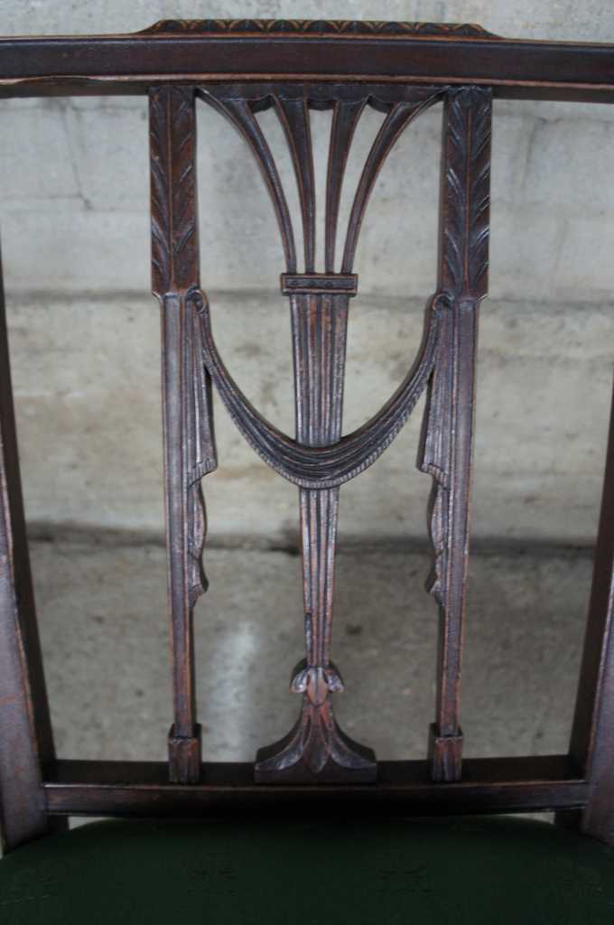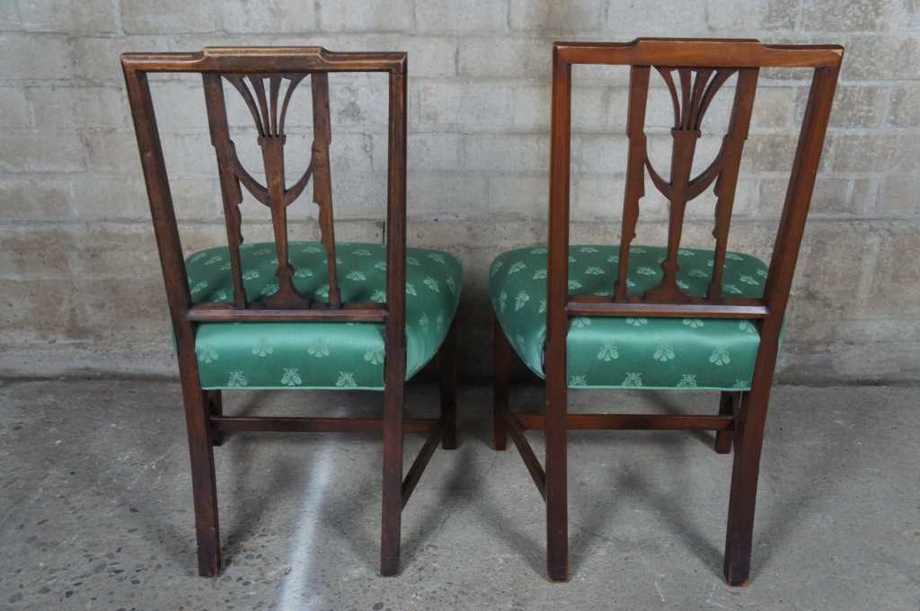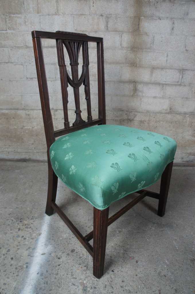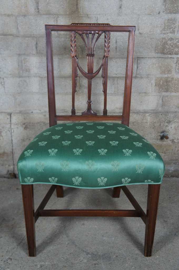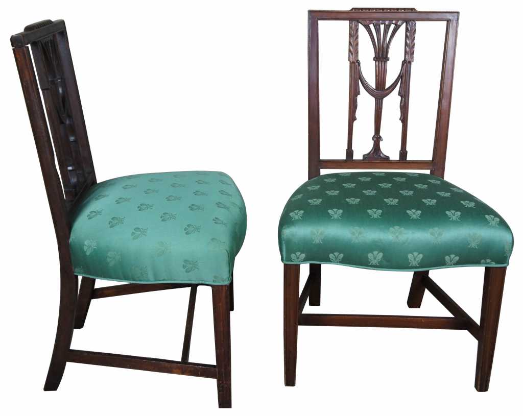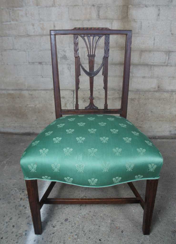 2 matching chairs, one antique and one vintage, Baker Furniture Hepplewhite Square back dining or side chair. Features mahogany wood with green silk fabric seat. Hepplewhite or Sheraton style, not to be confused with Federal, although they have similar characteristics.