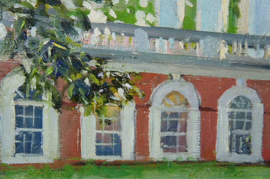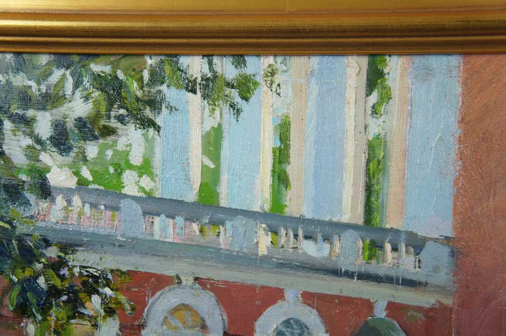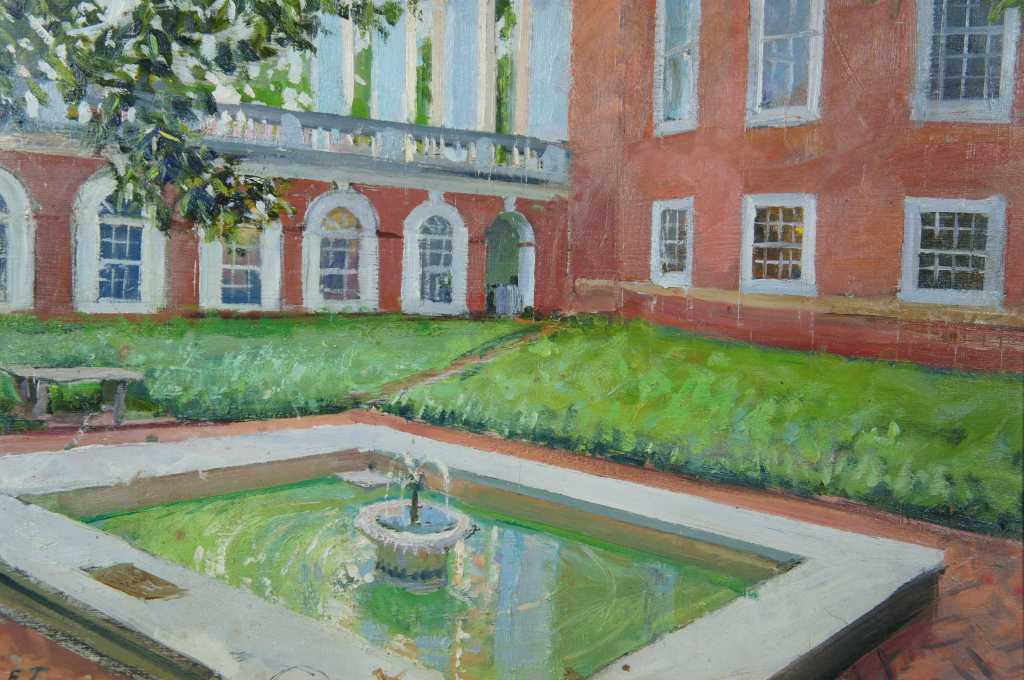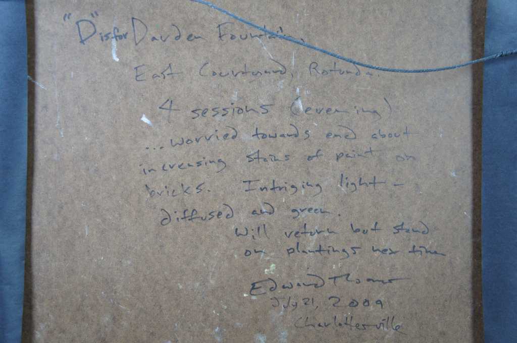 Oil on Board Landscape Painting by Edward Thomas. Features the Dauden Fountain, east cortyard at the University of Virgina (UVA) in 2009. Bio: Edward Thomas is an artist, architect and historian living and working daily in Charlottesville, Virginia. Edward studied both architecture and painting at the University of Virginia. He paints out of door scenes daily and continues his passion for building by using his downtown home as a perpetually unfinished architectural laboratory. Edward specializes in brick masonry and classical methods of building that were used by Thomas Jefferson and other architectural styles vernacular to the region. Edward's original paintings are found in prestigious collections throughout the US. He is now offering select pieces to be reproduced as limited edition signed prints, as well as a gift shop featuring his work.
