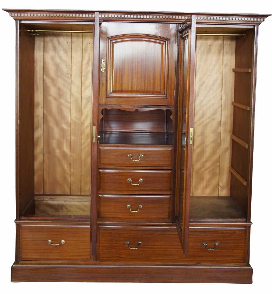 Early 20th century mahogany chifferobe. Traditional style with two outer mirrored hanging closets. Includes four drawers, and upper cubby. Doors open via unique latch that has to be turned to release the catch.