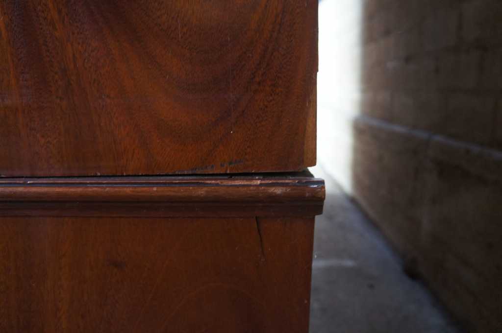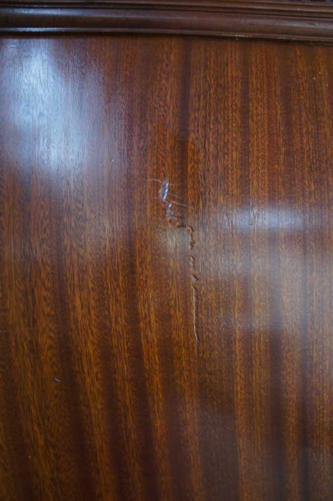 Very good antique condition, chip in wood on front left corner, scratch on left side, split and veneer loss back right corner