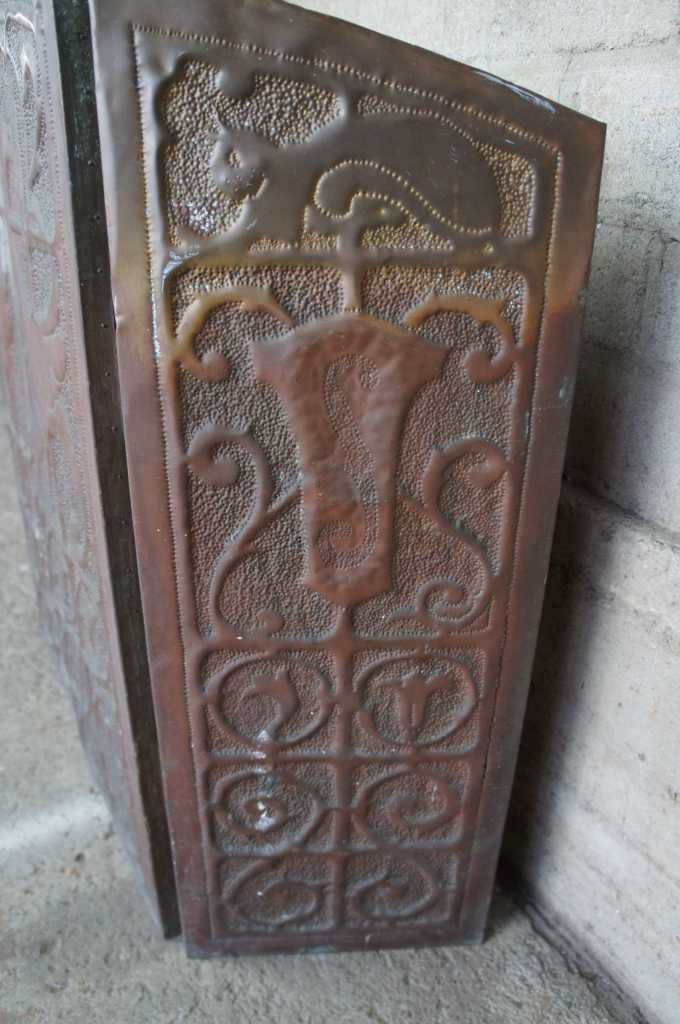 Antique stamped copper fireplace screen. Features swans, cats and outer crests with an "S". Floral design throughout. Each copper panel is mounted to oak boards with a hinge.