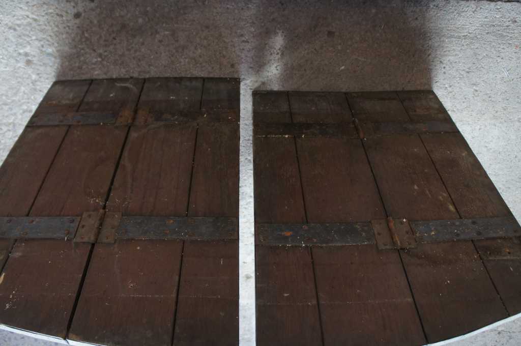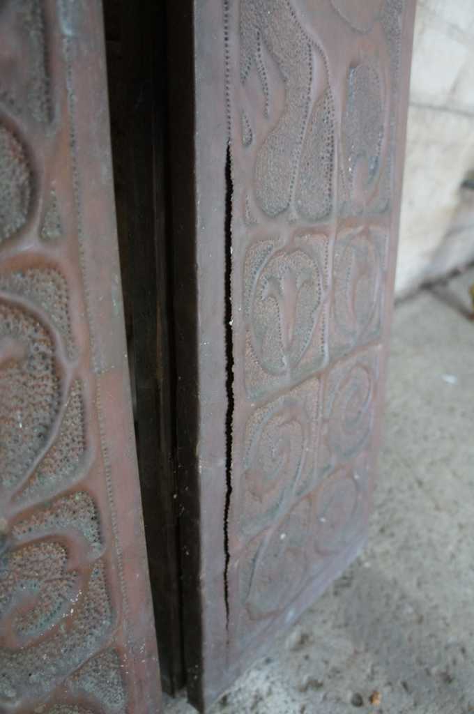 Good antique condition, corrosion, wear and distressing, separation to one panel, the two split panels could be rejoined by wood if interested.