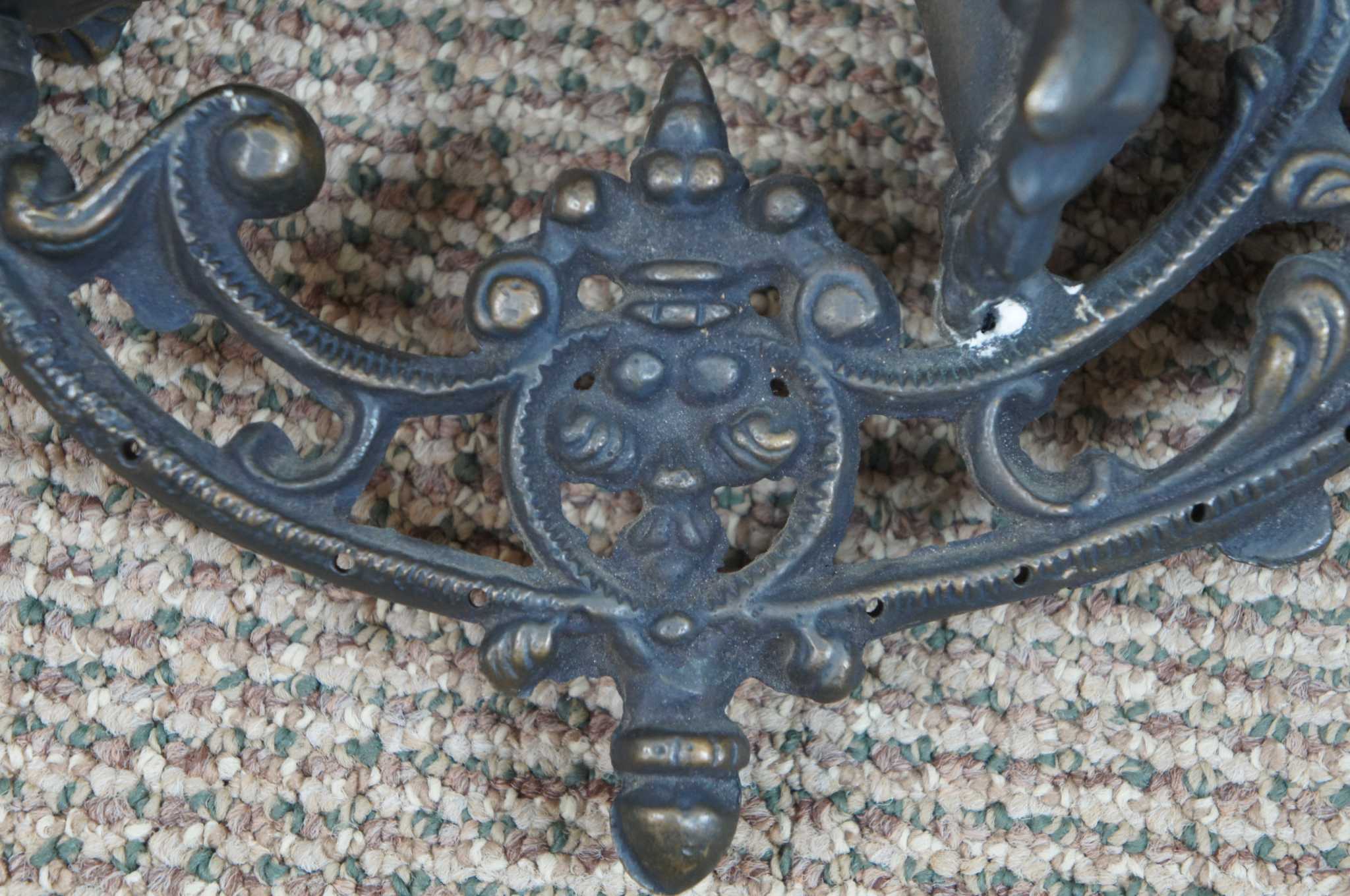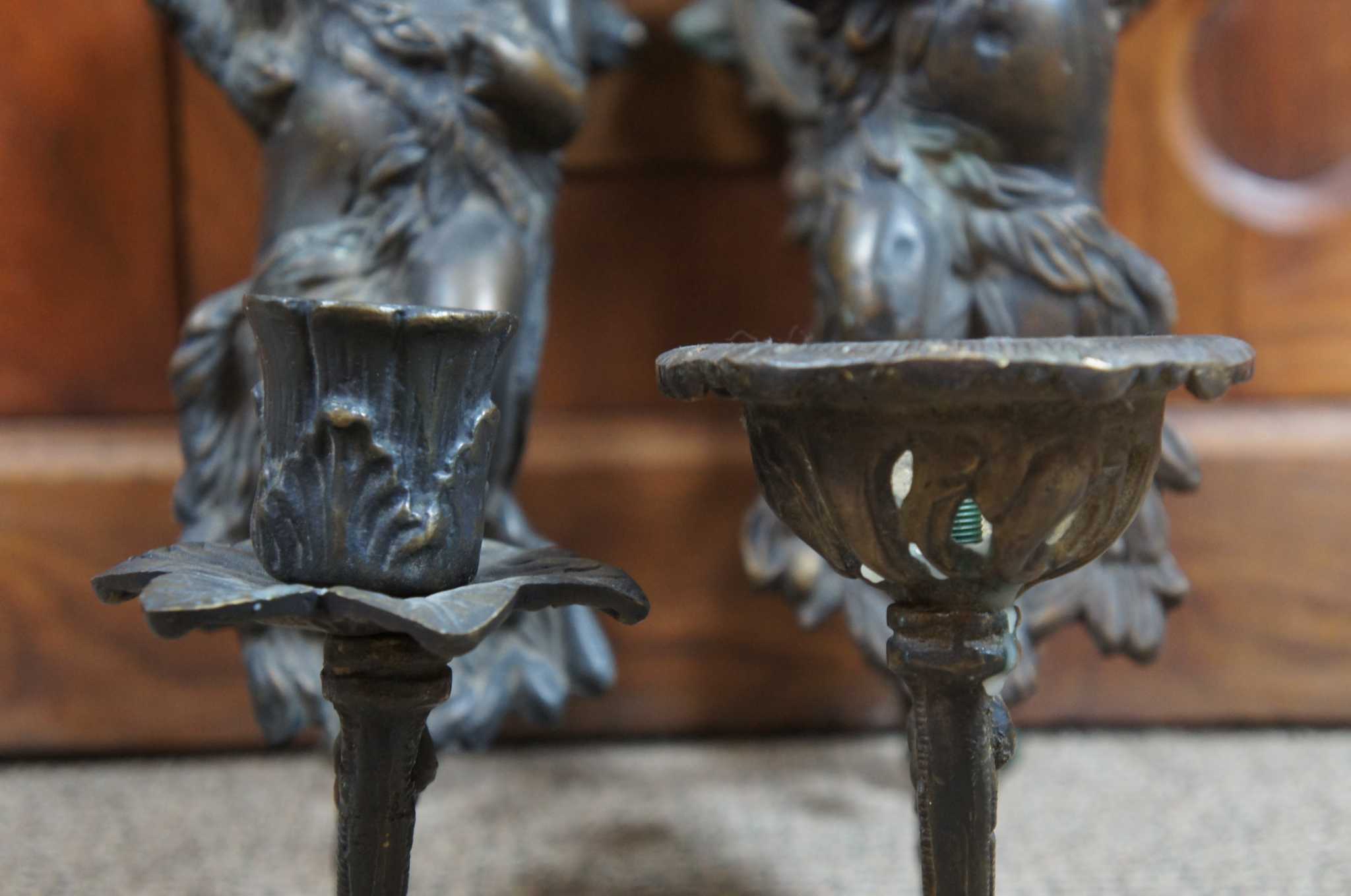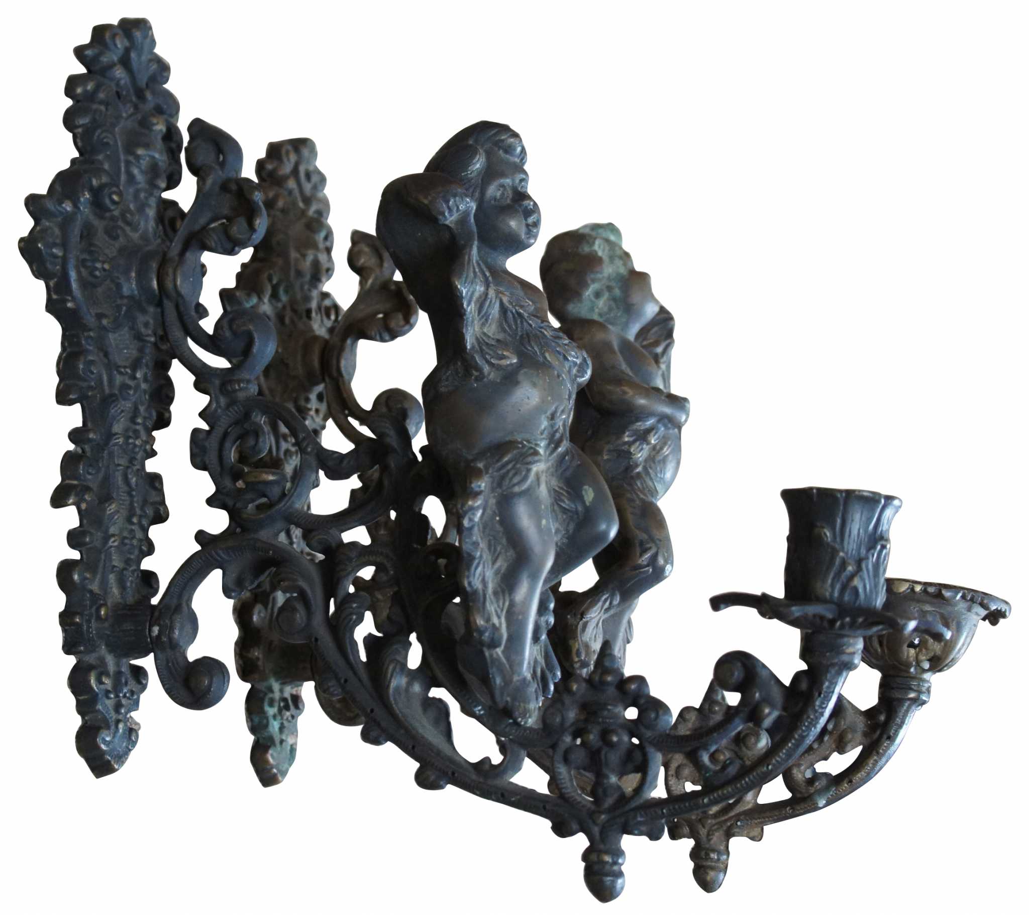 Two heavy bronze 19th century Victorian figural wall sconces. Features ornate scrolled back leading to cherubs which continue to the candle holder. A face ordains the back plate which appears to be Dionysus or Bacchus.