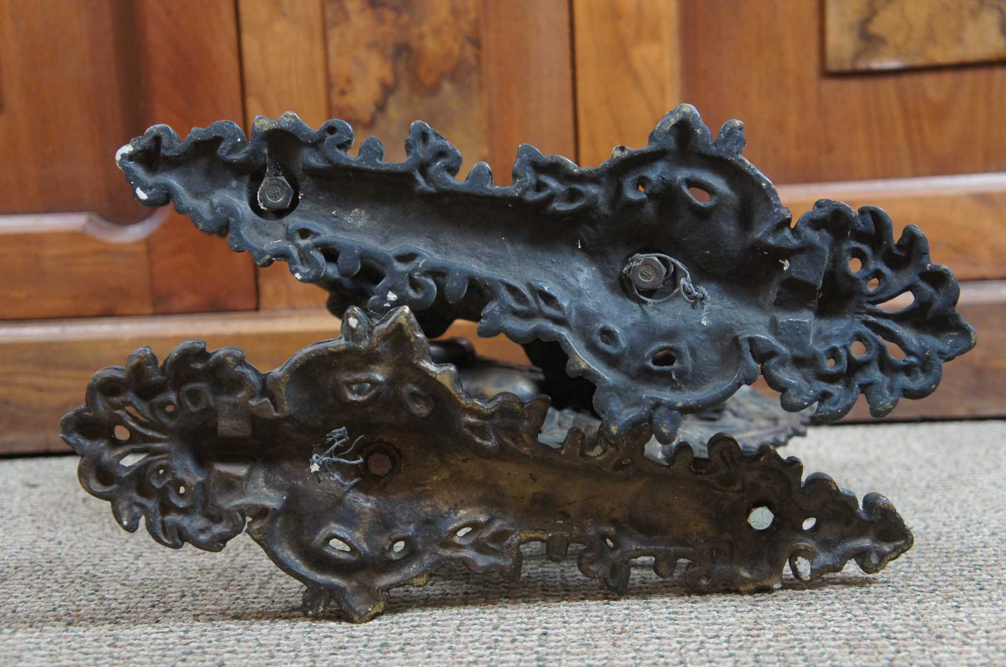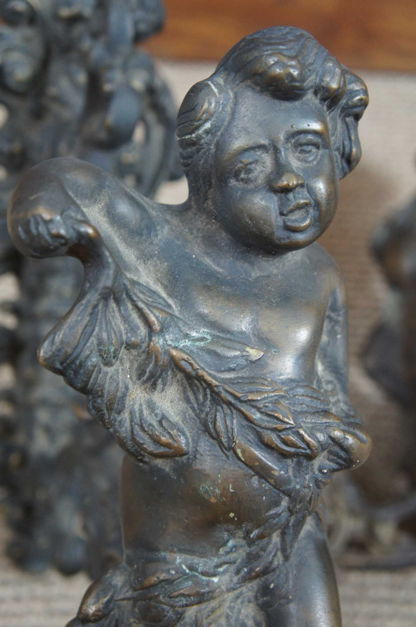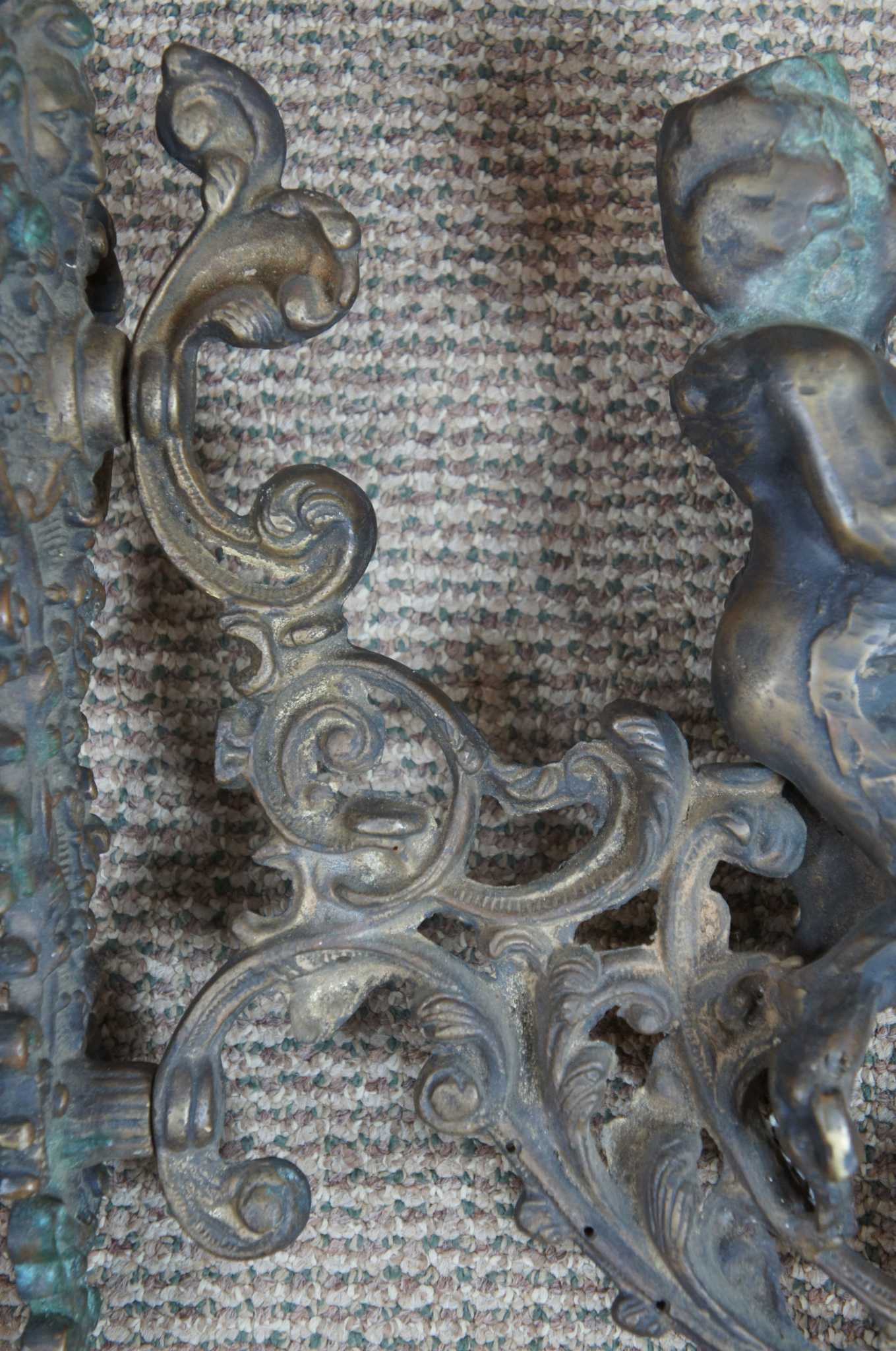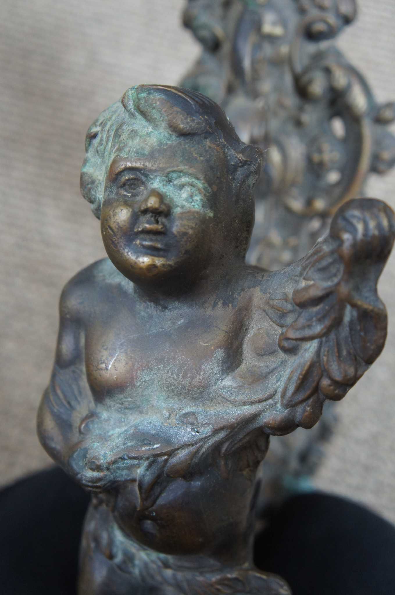Two heavy bronze 19th century Victorian figural wall sconces. Features ornate scrolled back leading to cherubs which continue to the candle holder. A face ordains the back plate which appears to be Dionysus or Bacchus.