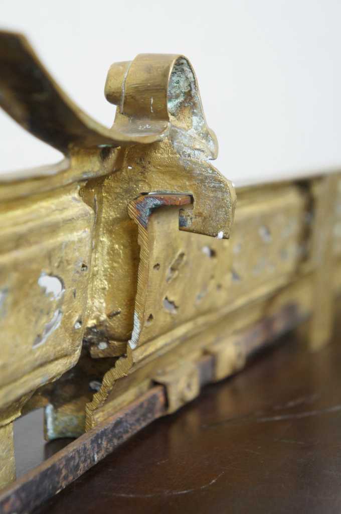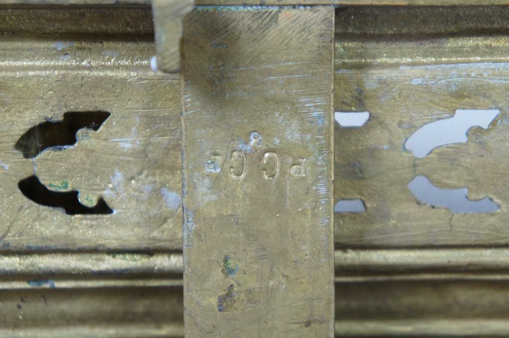 Very Good - Polish residue; some rust/maks from use; missing one decorative knob on corner piece. Marked C.C. - see pictures