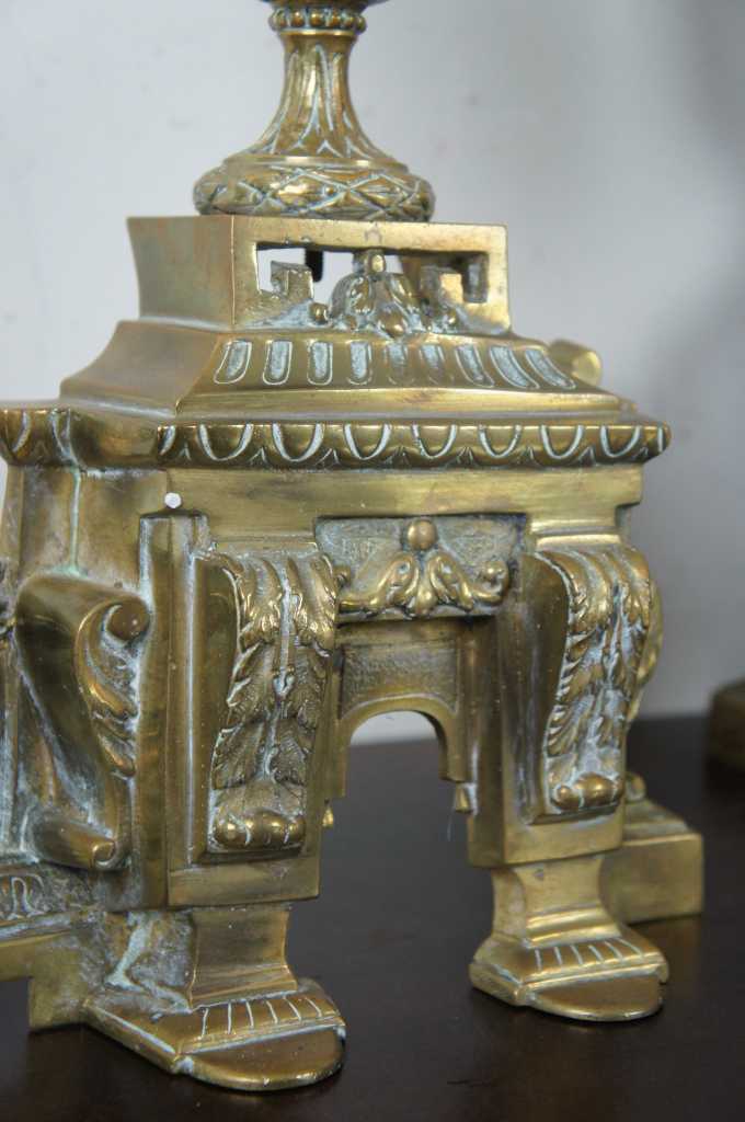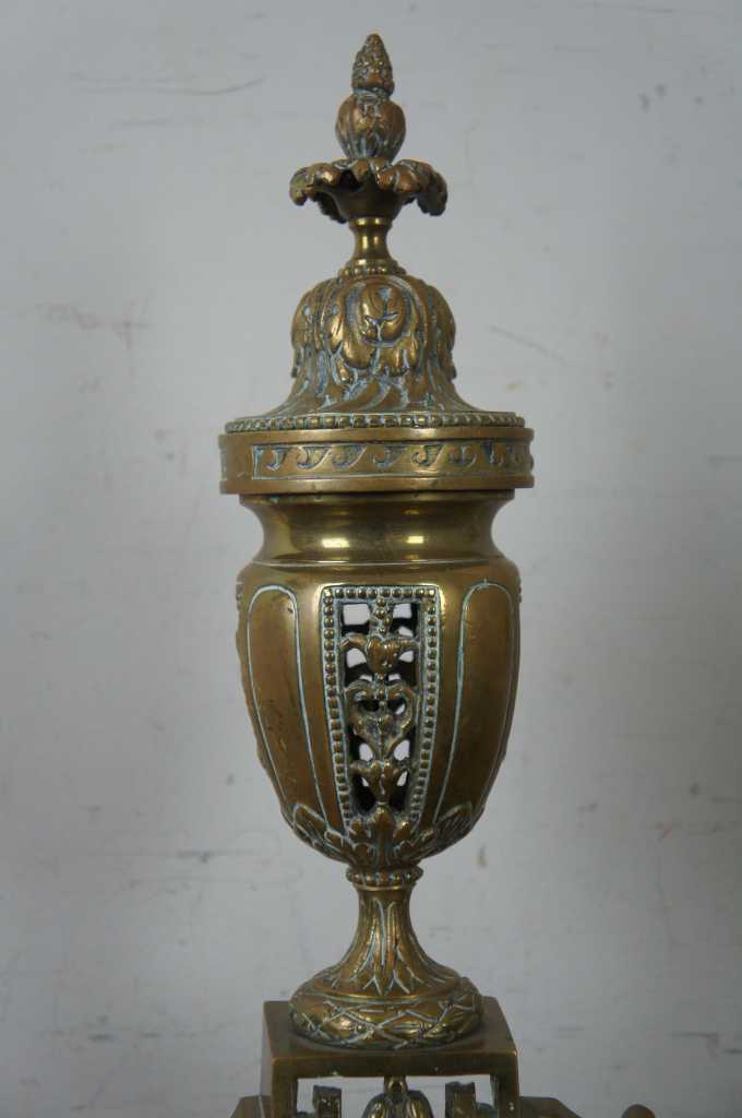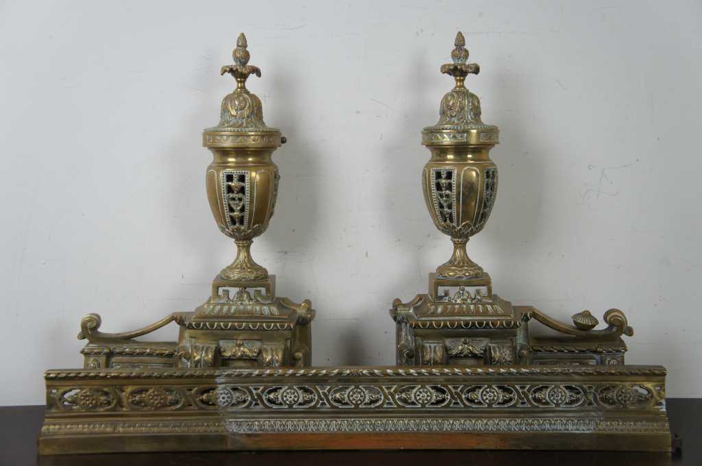 Napoleon III French adjustable fireplace fender and andirions. Beautiful details with large trophy urns mounted along the andirons, acanthus engravings, trophy finials, and gadrooning. The fender portion is pierced/reticulated with tressel design and medallions.