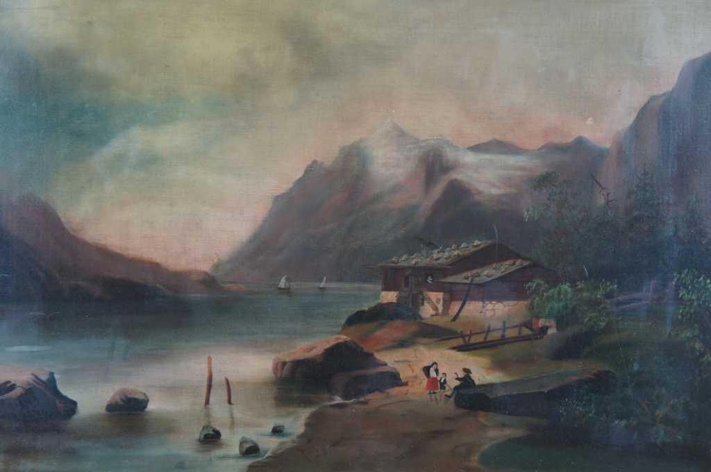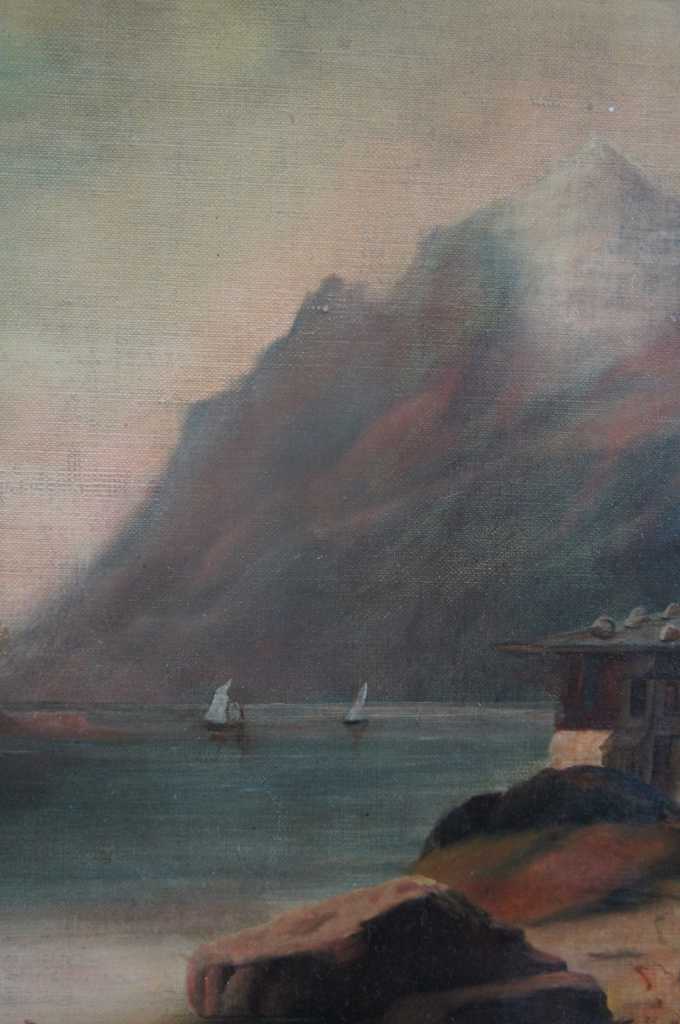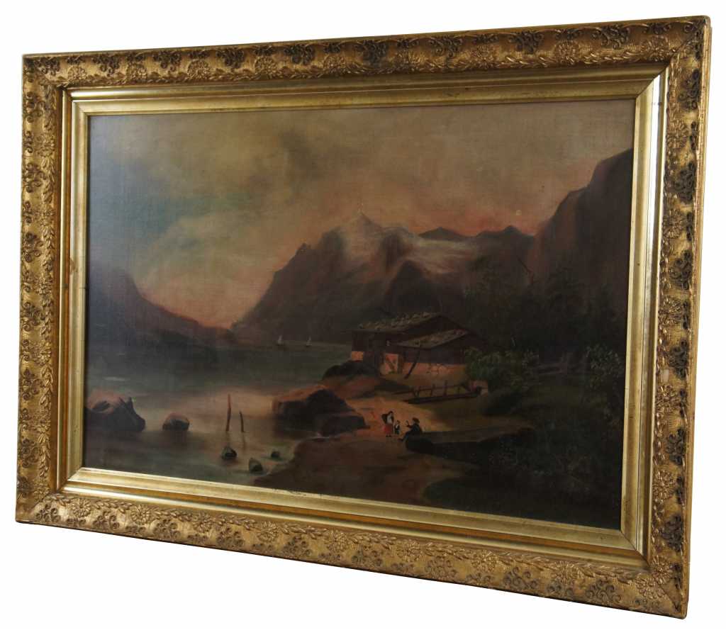 Antique 1800s mountainous landscape. Features a riverside view on a cloudy day. Boats and cottage can be seen in distance, figures shoreside. Ornately framed with low relief accents and gold.