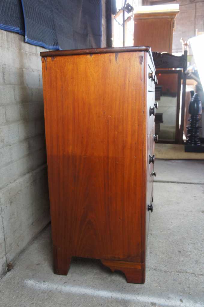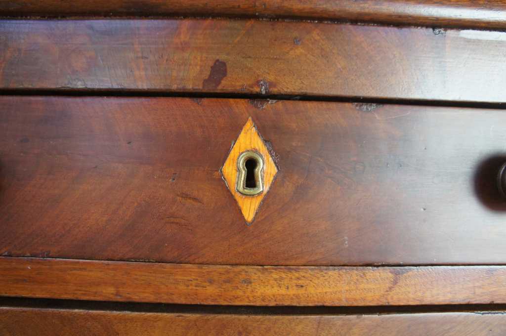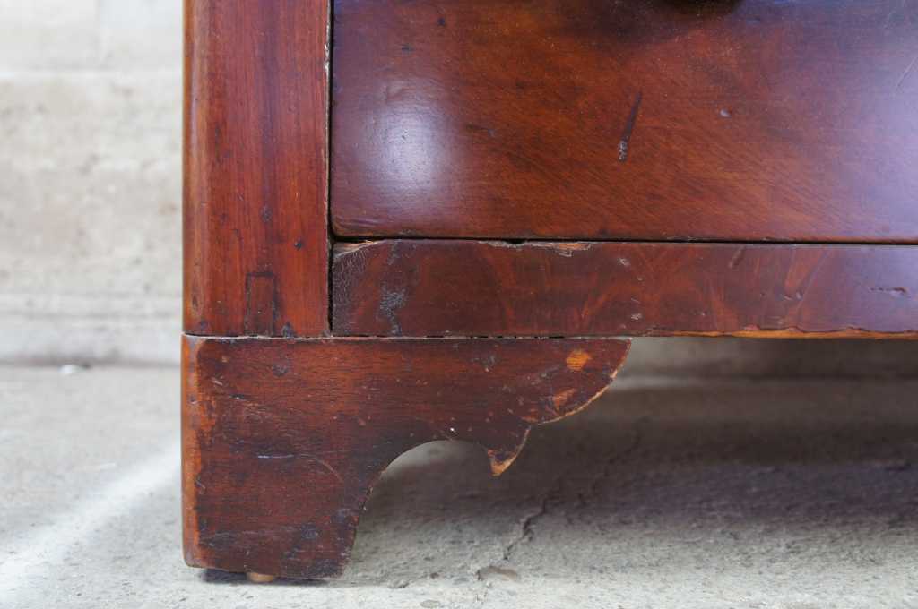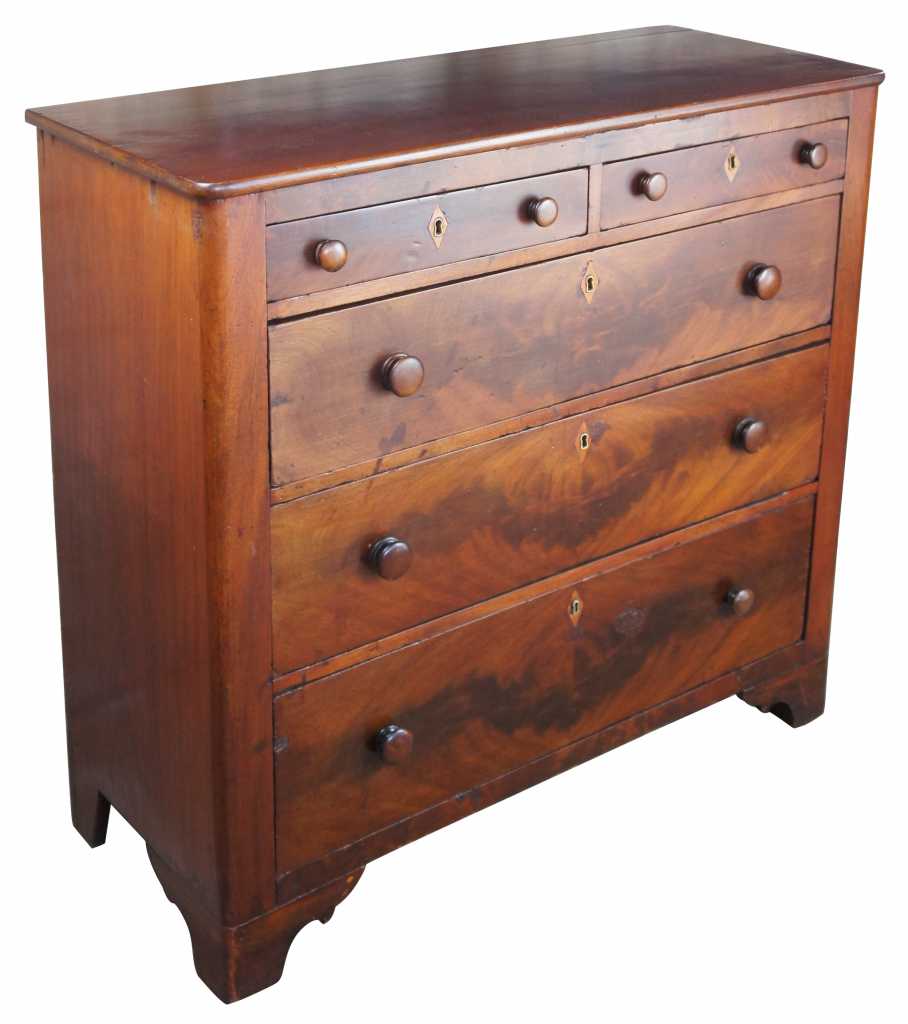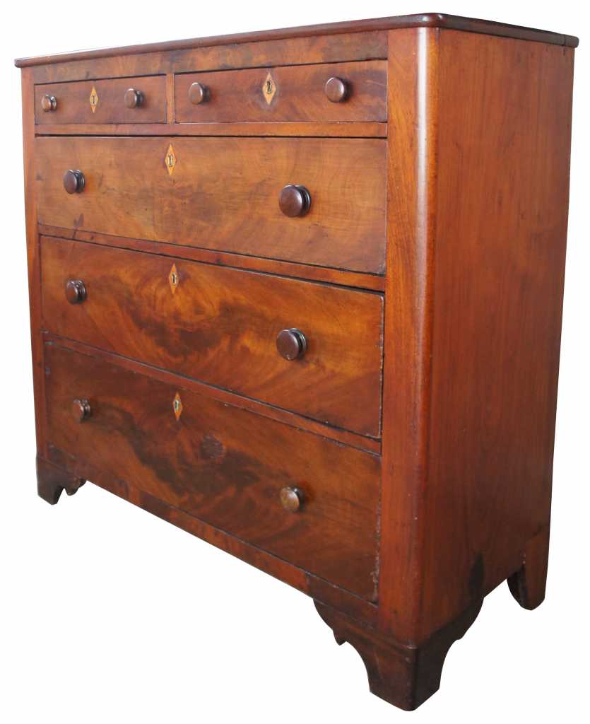 19th century American mahogany dresser with crotch front veneer drawers and diamond keyhole inlay. Hand dovetailed with braceted feet.