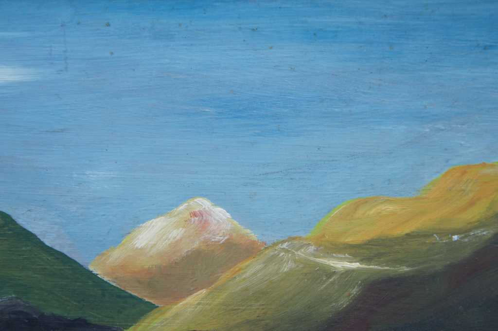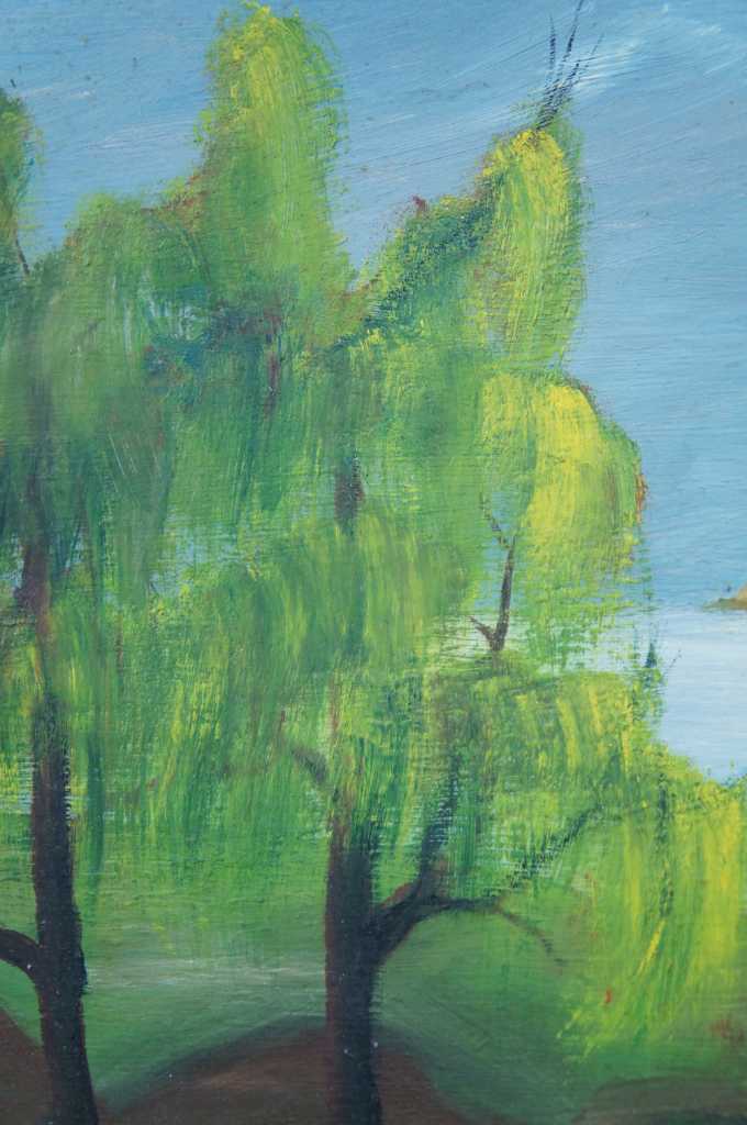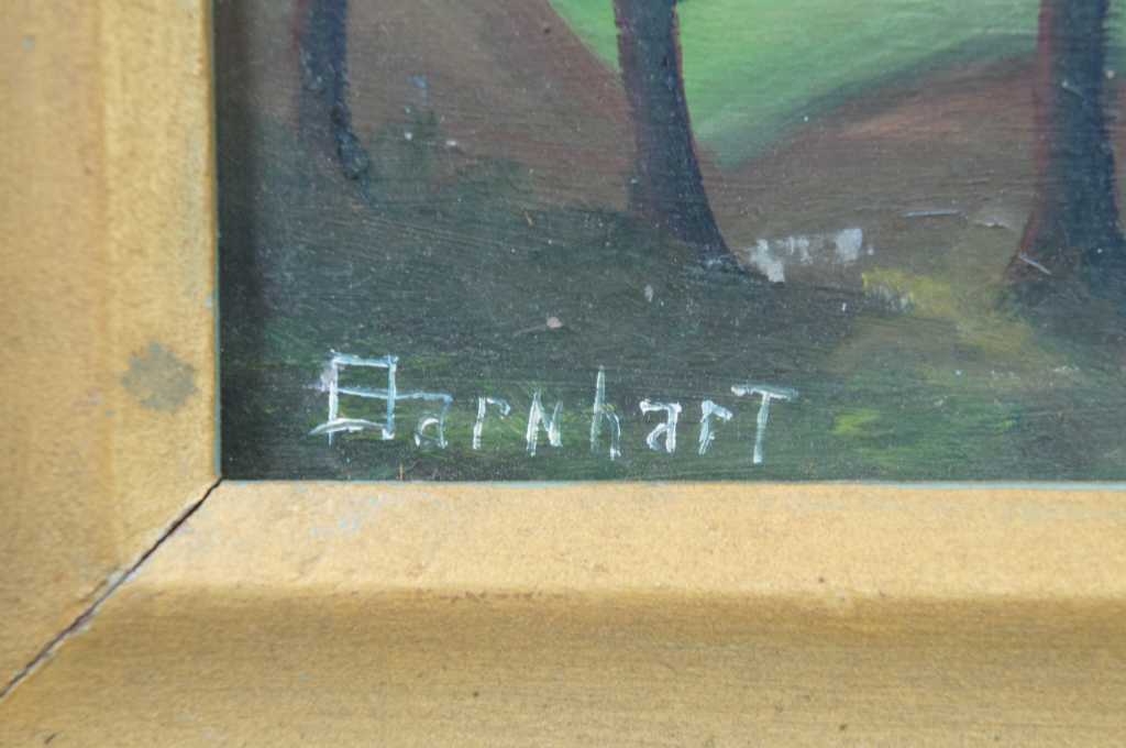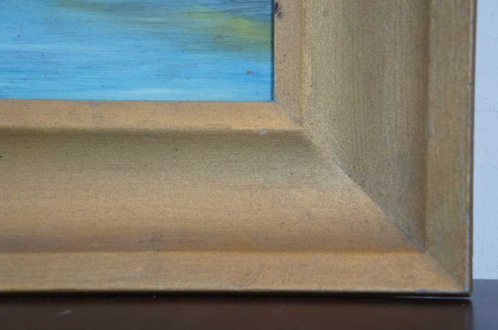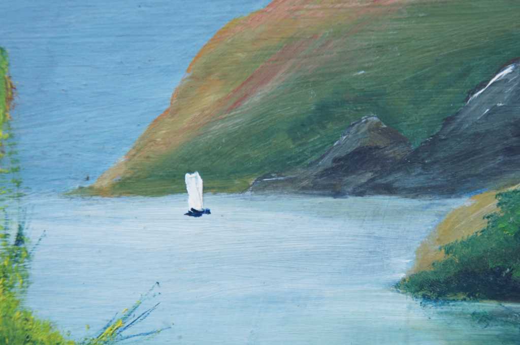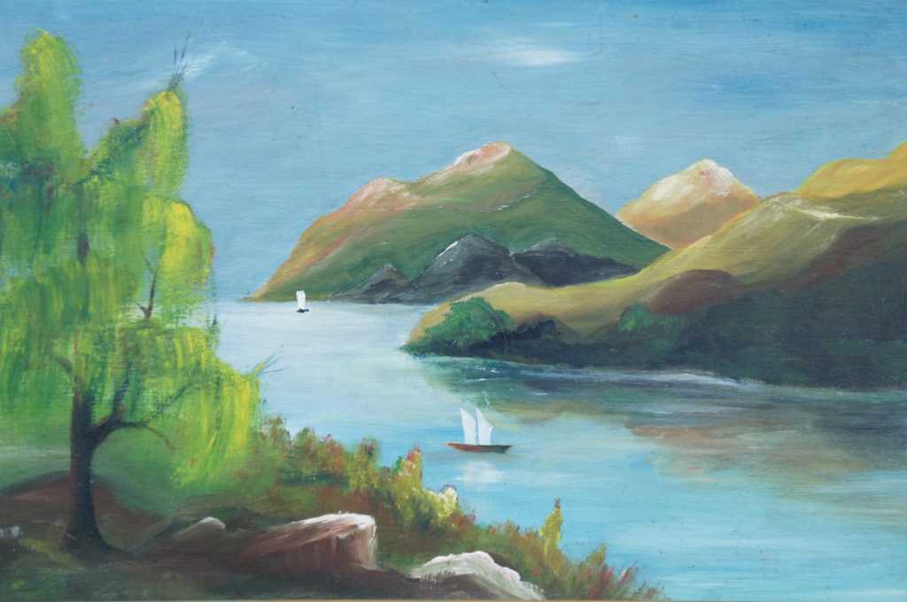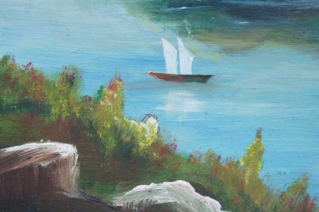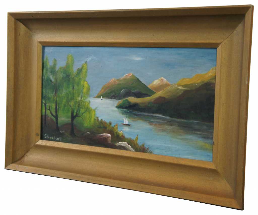 A quaint 20th century oil painting by Barnhart. Features a riverside view of the Chesapeake. Two sailboats and mountains can be seen in the background.