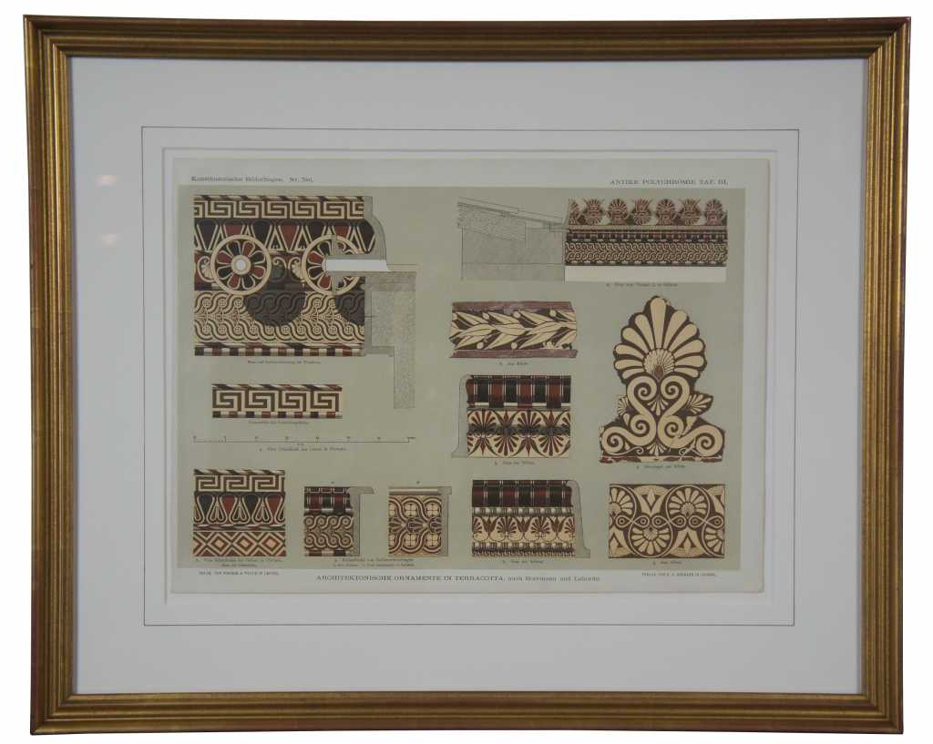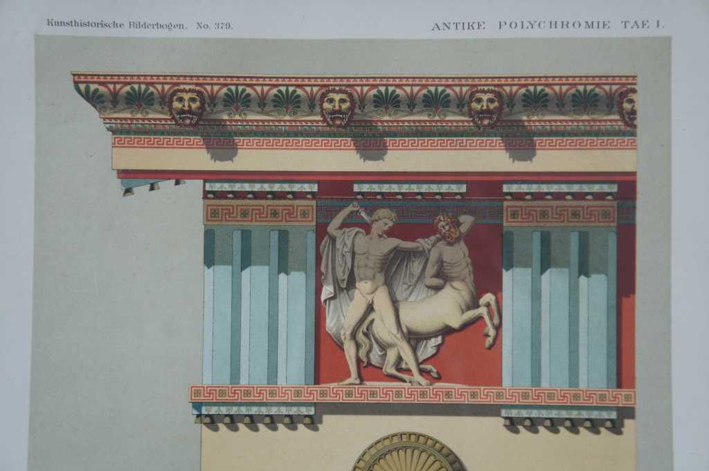 Roman Architecture Prints; Taf. I-II: 'Antike Polychrome - Dorischer Gebalk - Ionisches Gebalk - Casette aus den Propylaeen.' (Antique multicolours / polychrome - Dorian / Doric beams - Ionian / Ionic beams.) Decorative set of 2 matching plates showing classical column / frieze styles. A Propylaea, Propylea or Propylaia is any monumental gateway based on the original Propylaea that serves as the entrance to the Acropolis in Athens.; Antique Prints-Ionic-Doric Classical Columns-Frieze-Architecture-Seemann-1880. Kunsthistorische Bilderbogen. Nr. 381. Ionisches Gebalk Cassette Aus Den Propyleen 380. Dorisches Gebalk 379. Architectural ornaments in terrecotta.