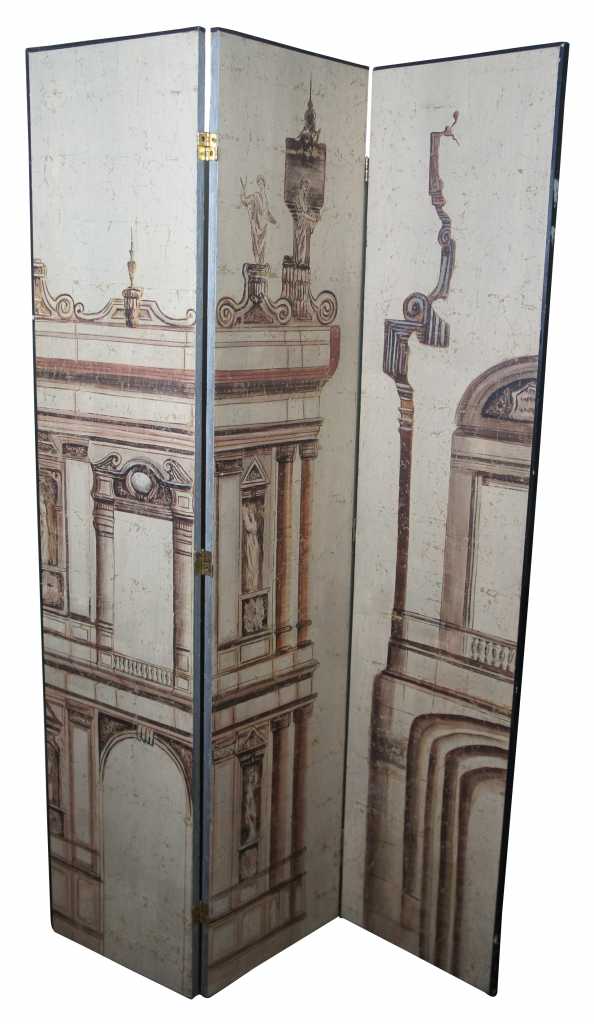Late 20th century 3 panel screen or room divider. Features Greek or Roman inspired achitecture over a distessed backing. Reverse side shows a network of green leafs