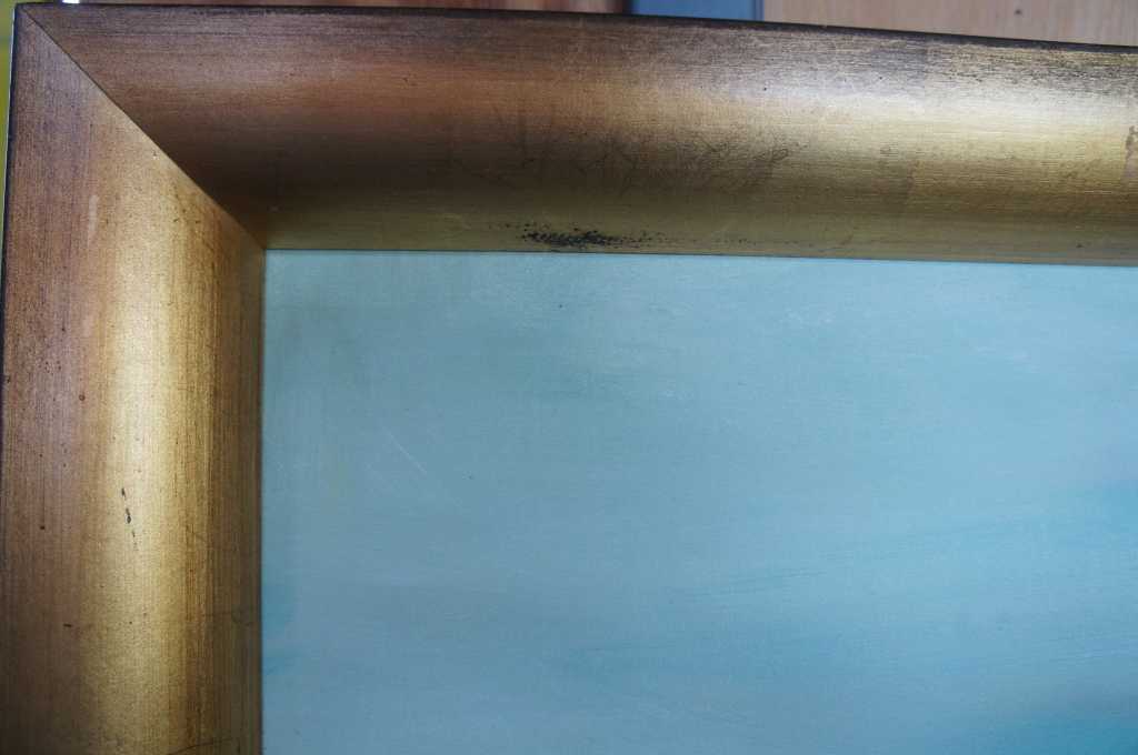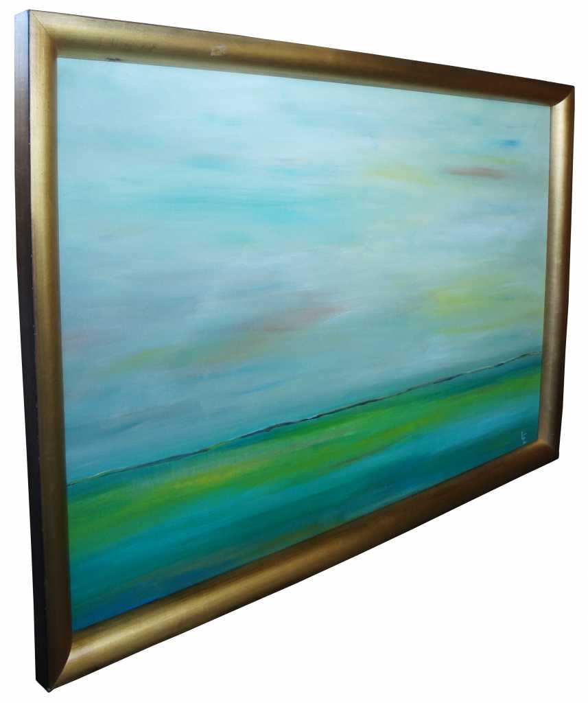 Abstract impressionist seascape singed LE. Features towards land with greens and blues, painted by a university of Michigan grad student in the 1990s. Oil on canvas, framed in gold.