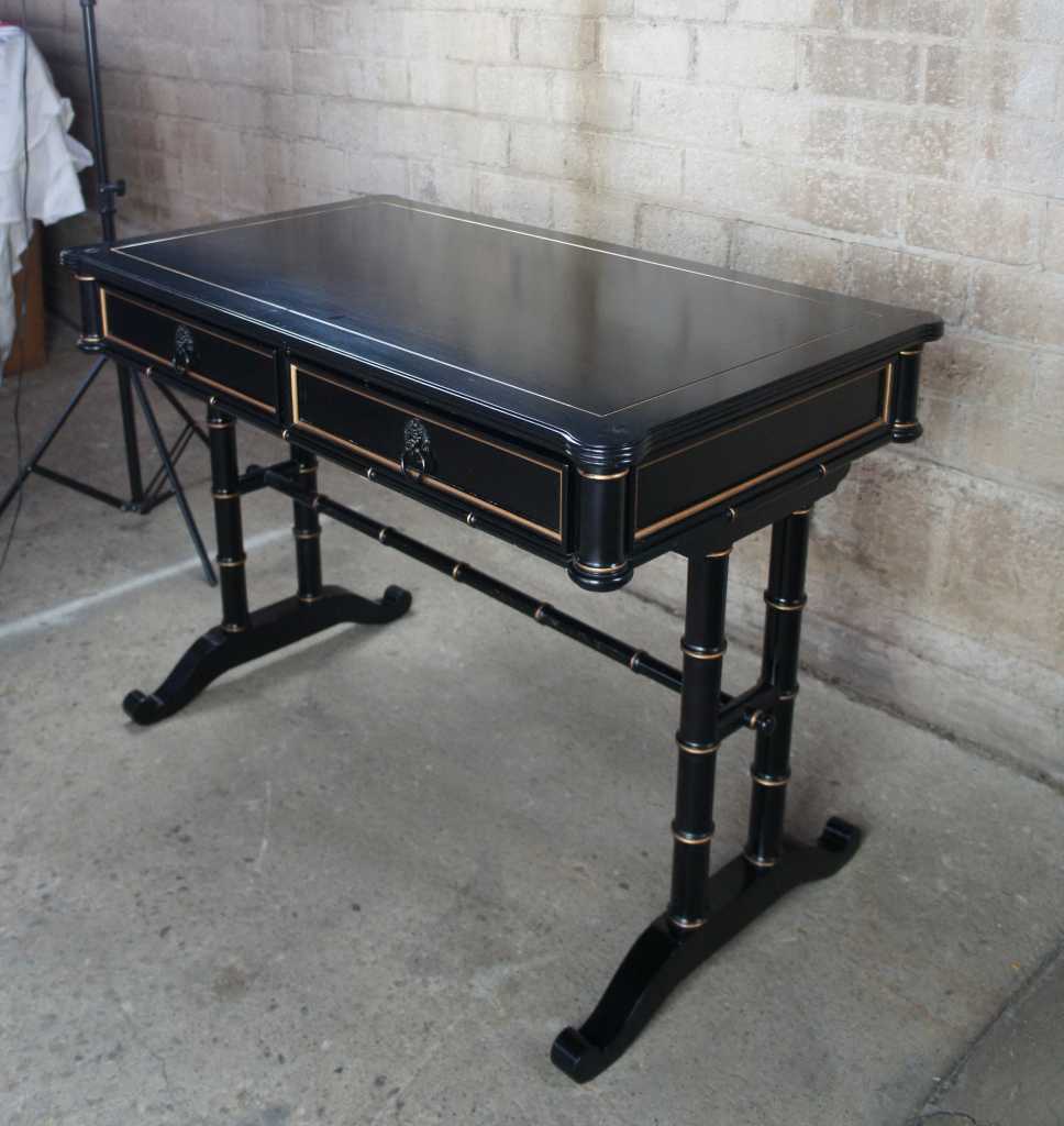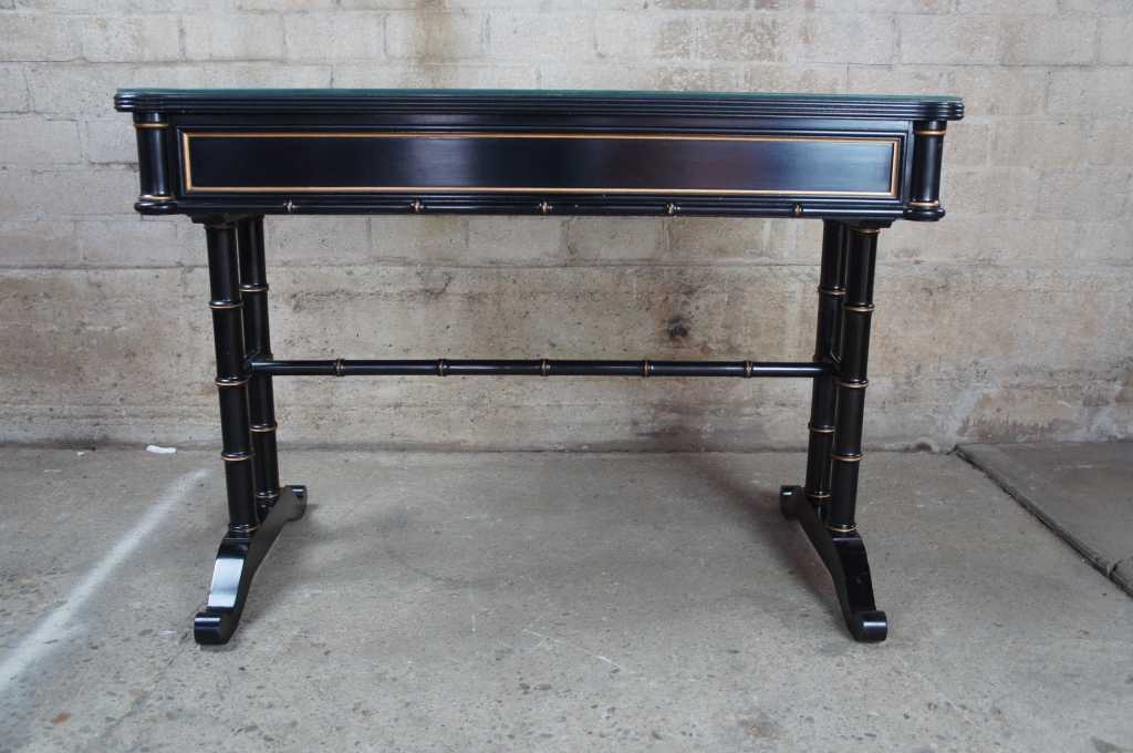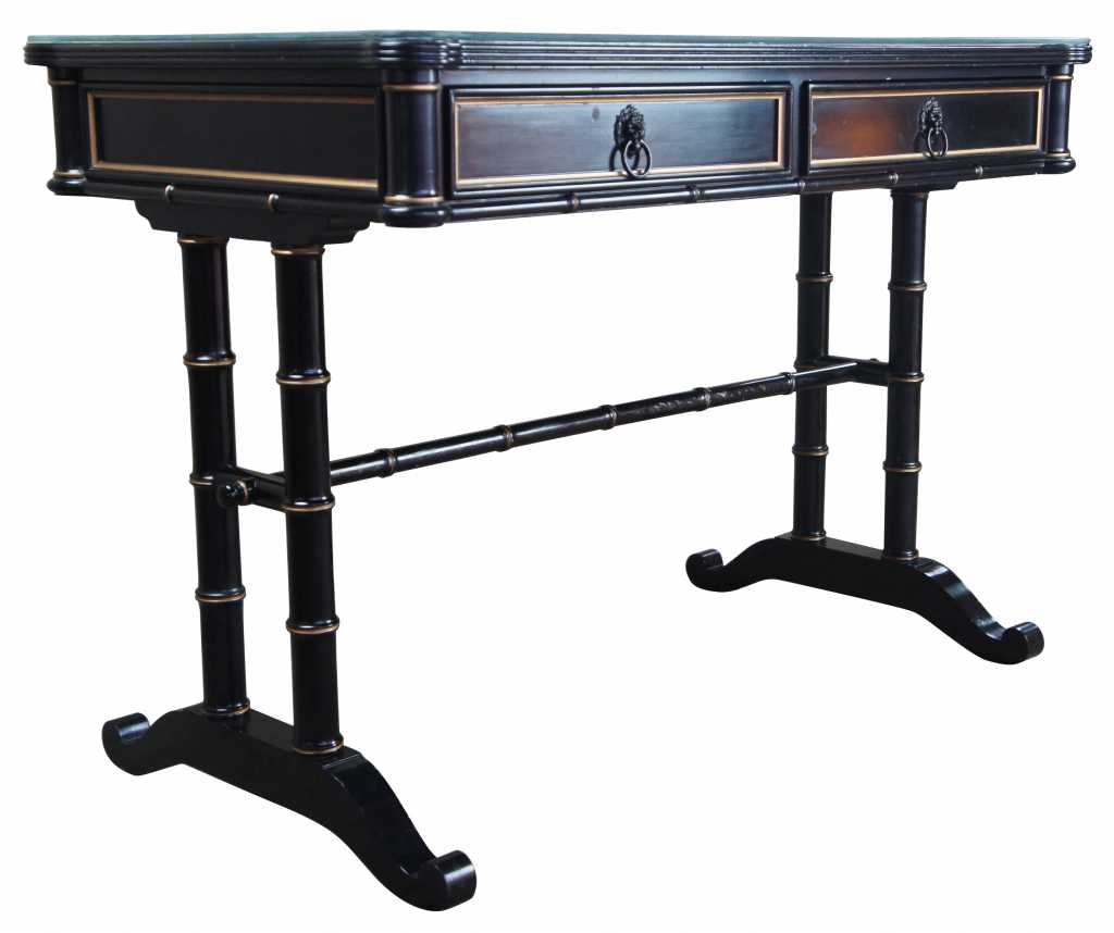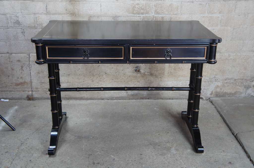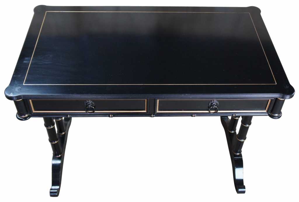 Baker Furniture black and gold writing desk. Features a faux bamboo styling, two drawersw with lion head pulls, glass covered top.