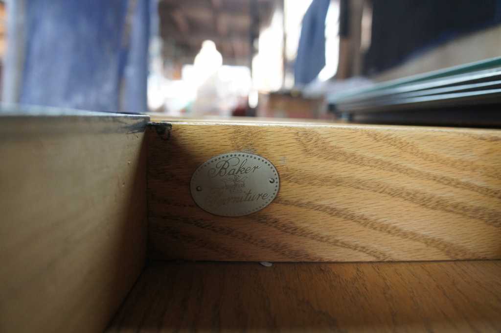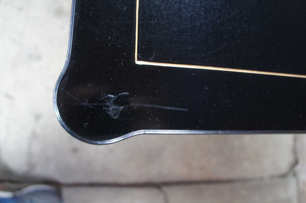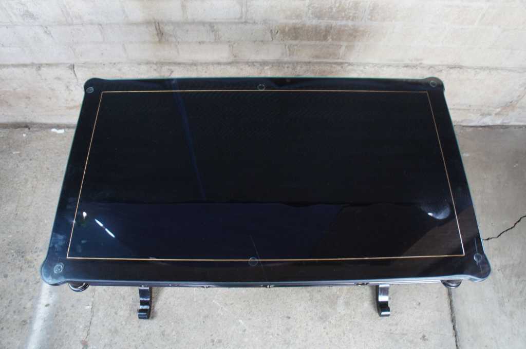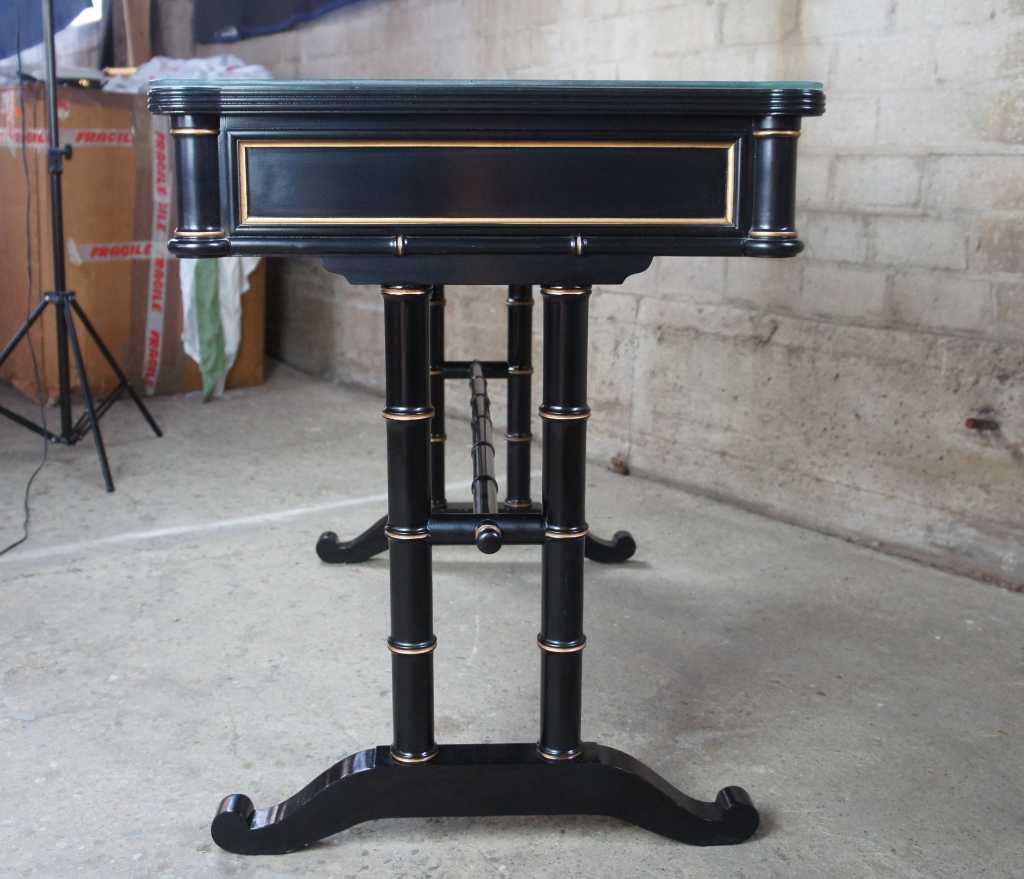 Baker Furniture black and gold writing desk. Features a faux bamboo styling, two drawersw with lion head pulls, glass covered top.