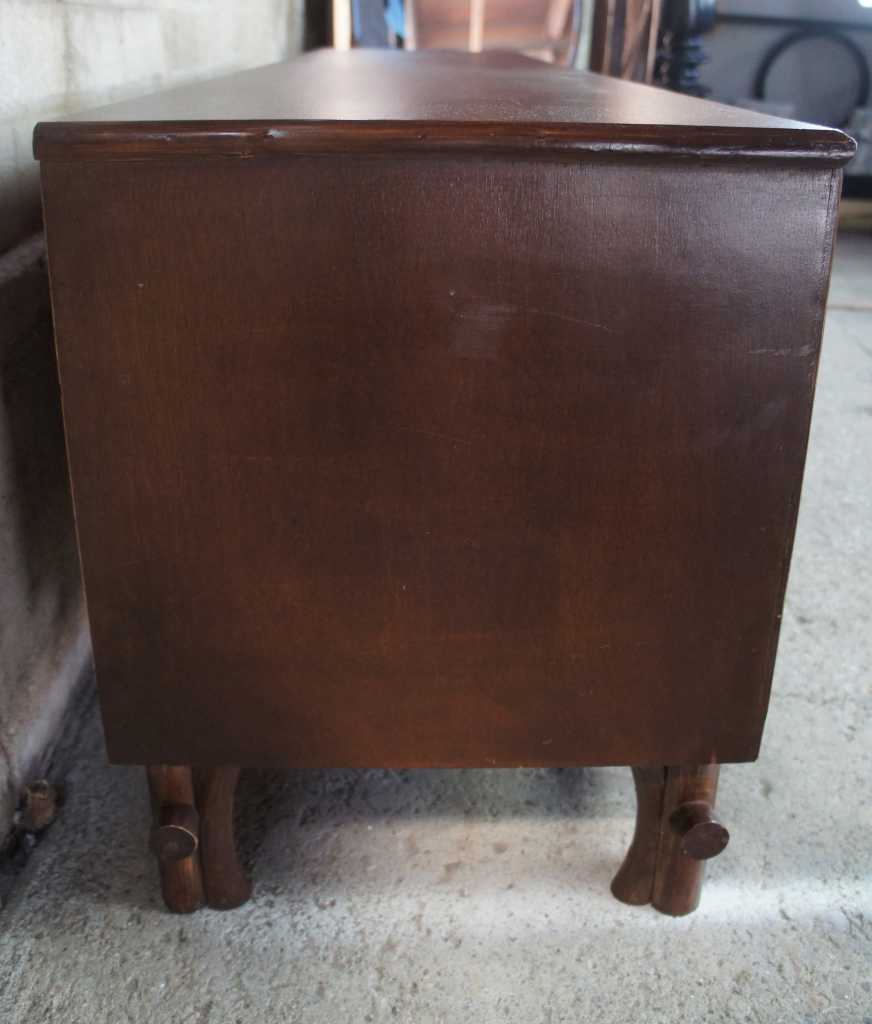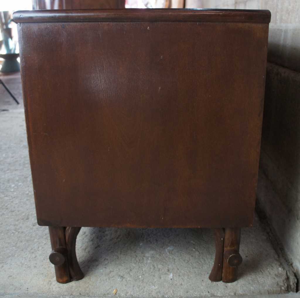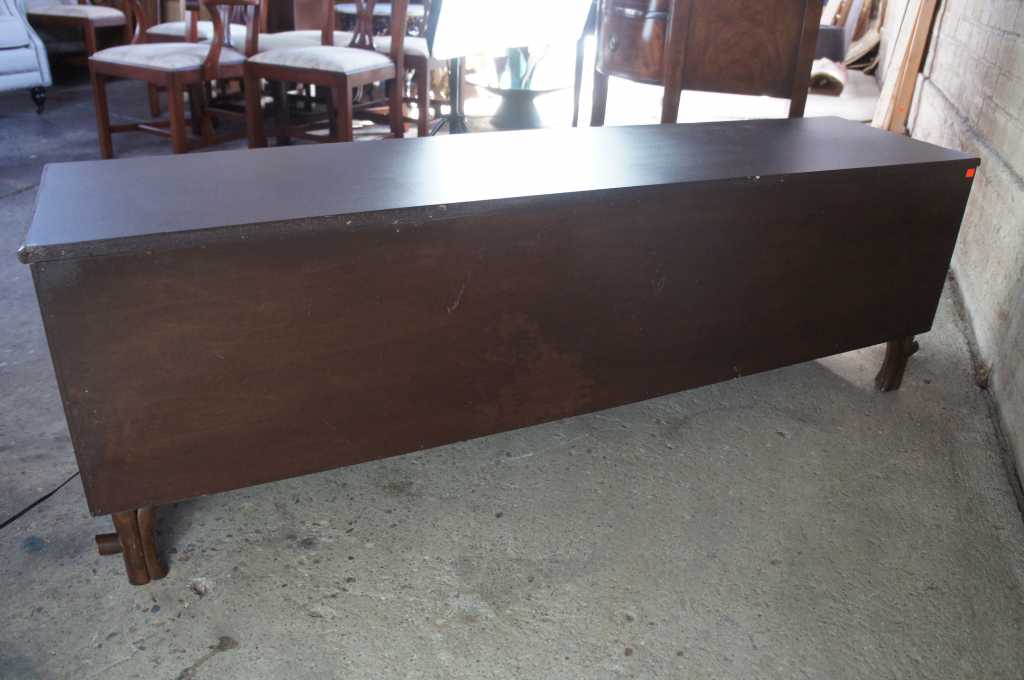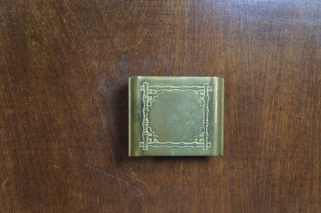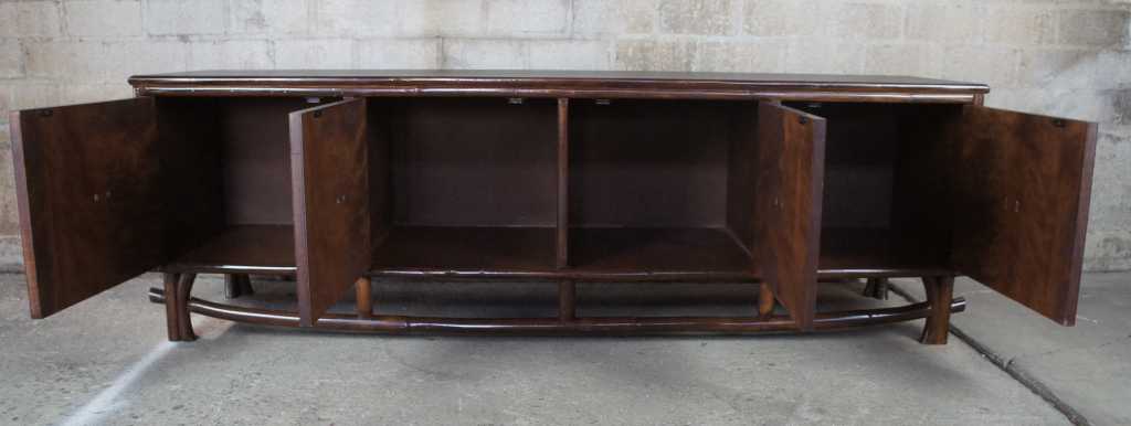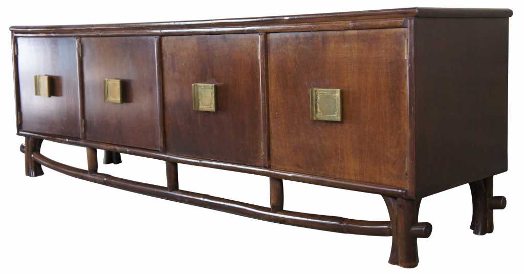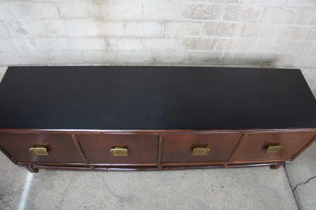Mid 20th century asian inspired cabinet or console. Made from mahogany with black laminate top. Opens to four cubbies, features brass hardware with bamboo embossed motif.