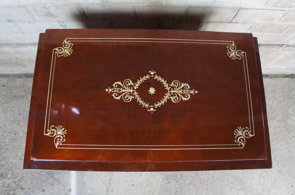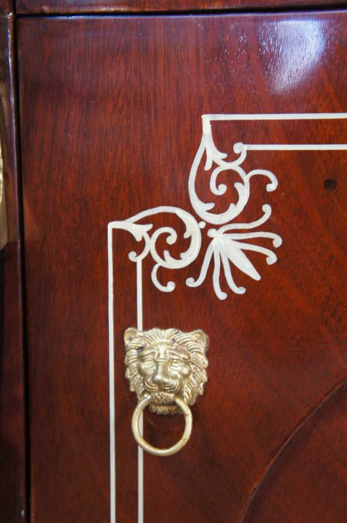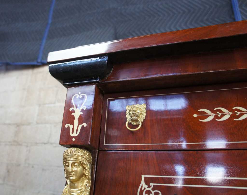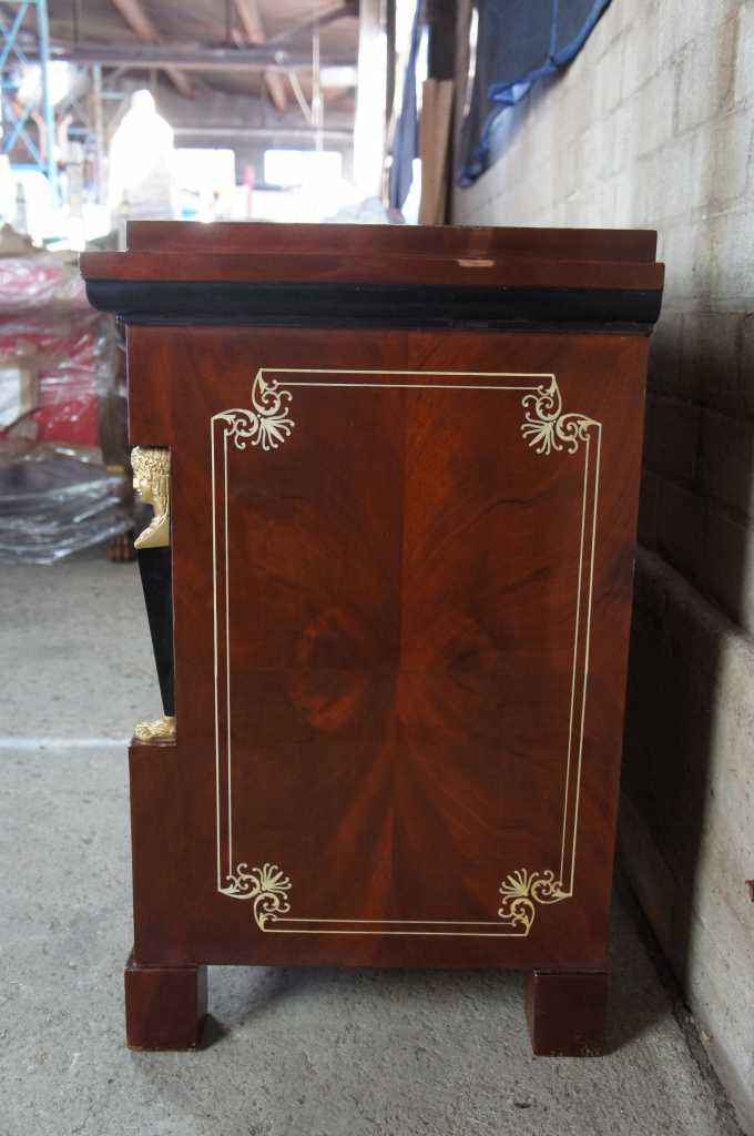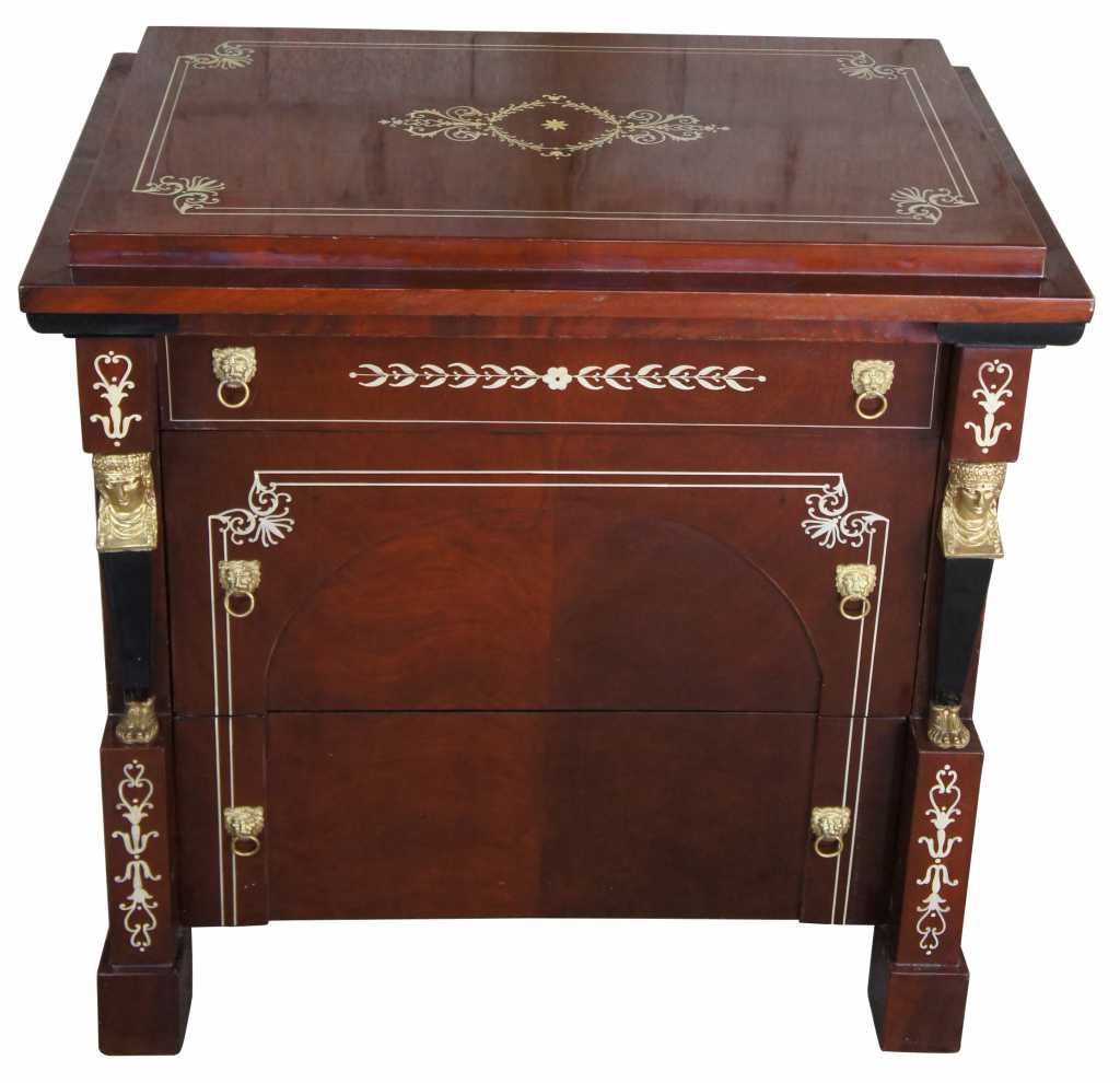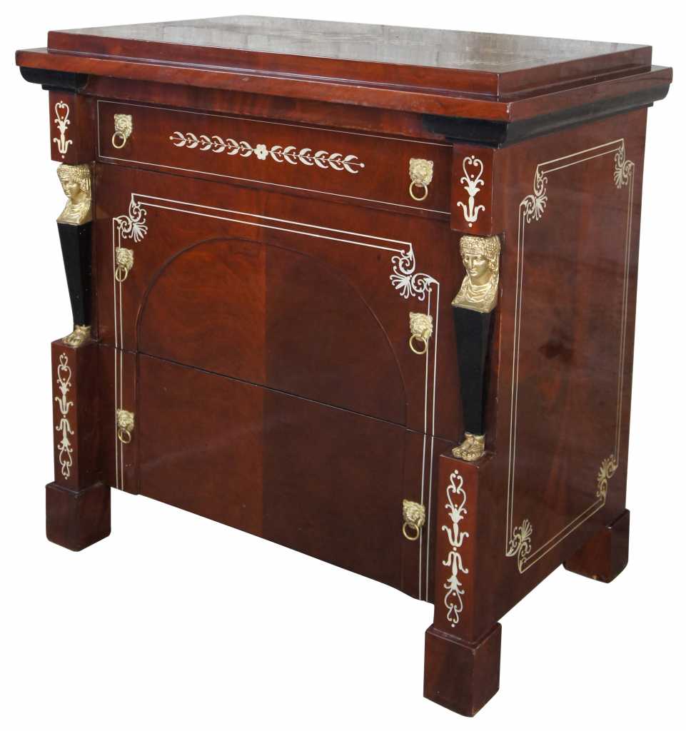 20th century Egyptian Revival three drawer chest. Made from mahogany with figural mounts and lion knocker drawer pulls. Features a blend of French and art deco styling. Perfect for use as a bedside table, dresser or stand alone piece. Matching table available without handpainted detail.