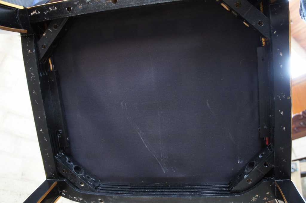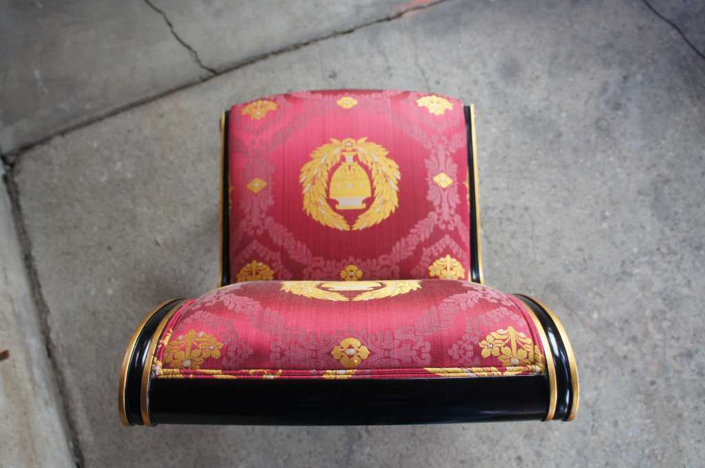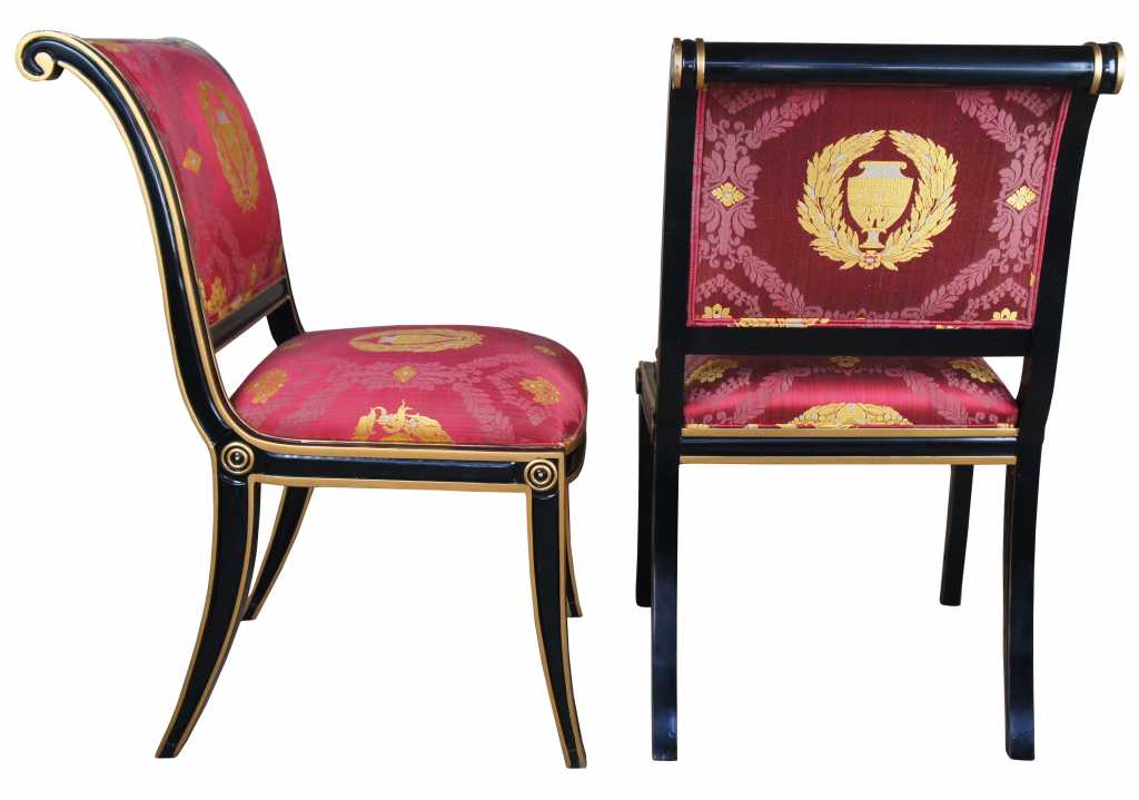 A beautiful pair regency style black and gold dining or side chairs. Features a sleigh shaped back and traditional red sclamandre fabric with urns at the center. Attributed to Maitland-smith or Henredon, however the paperwork was lost.