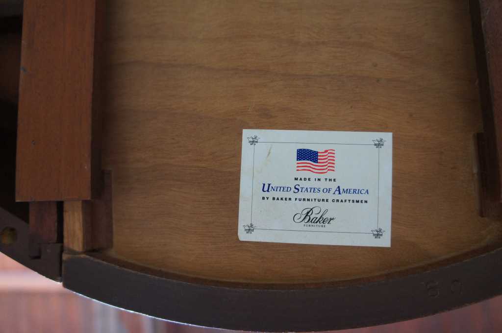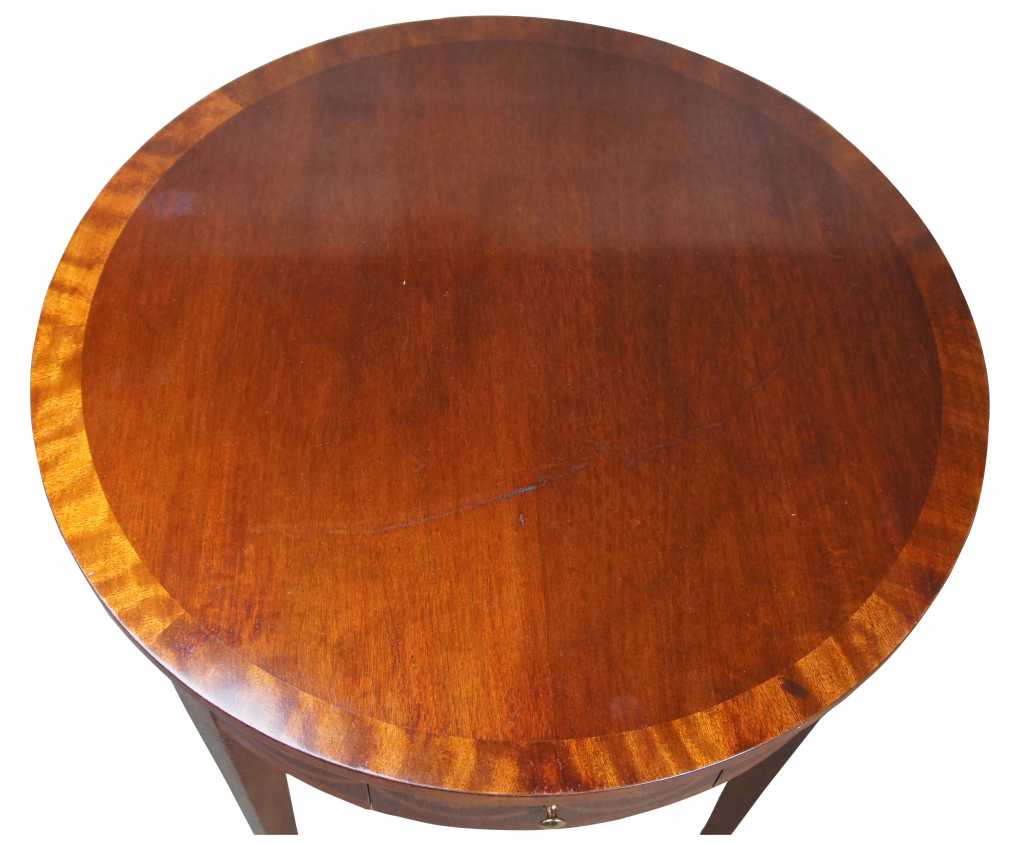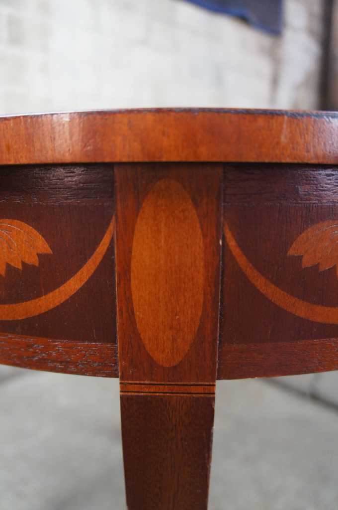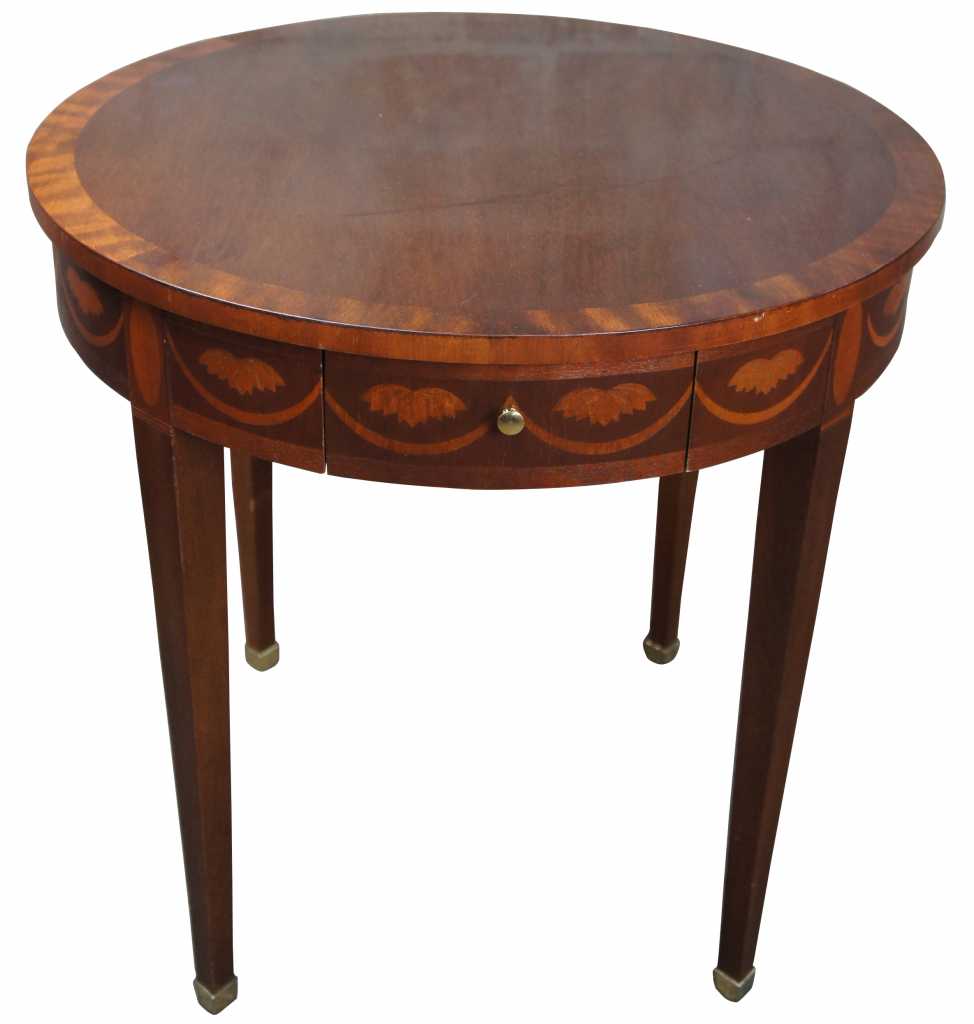 Round side table by Baker Furniture. Features distressed mahogany round top with banding and side pullout / pull-out trays. The table has delicate inlay around the aprons and the top of the four tapering legs.