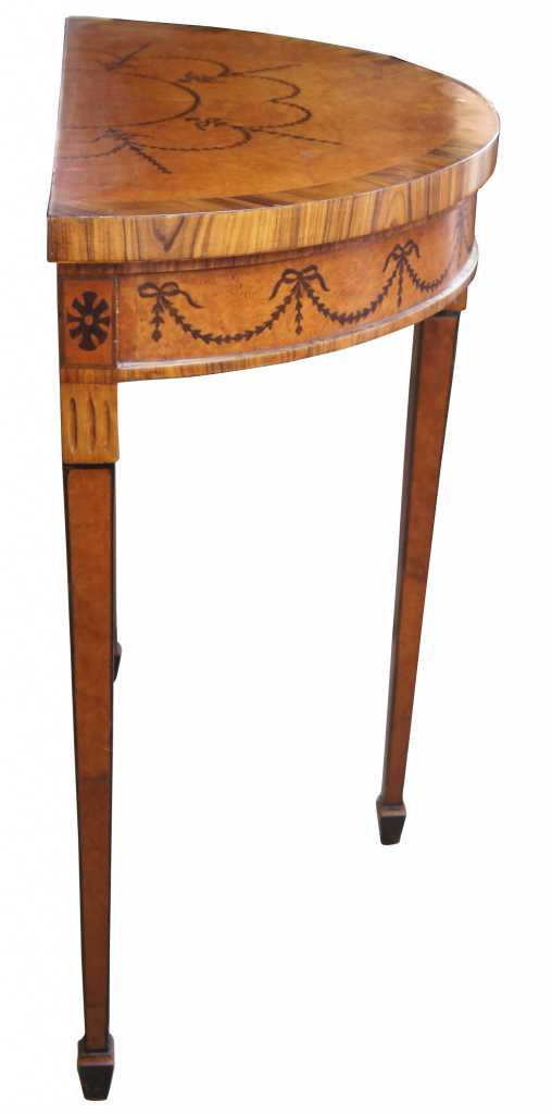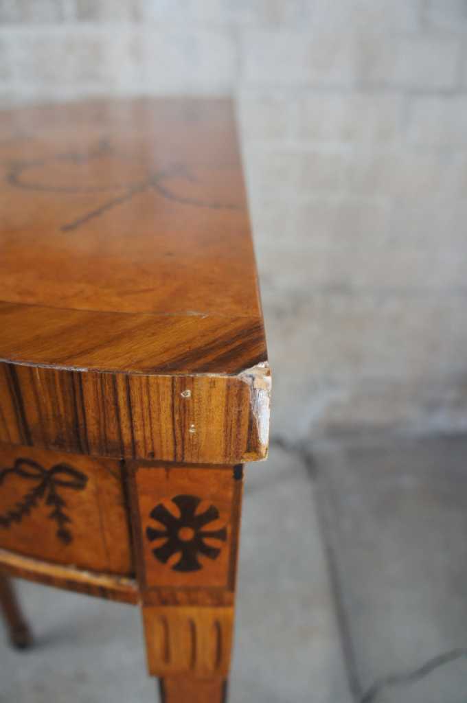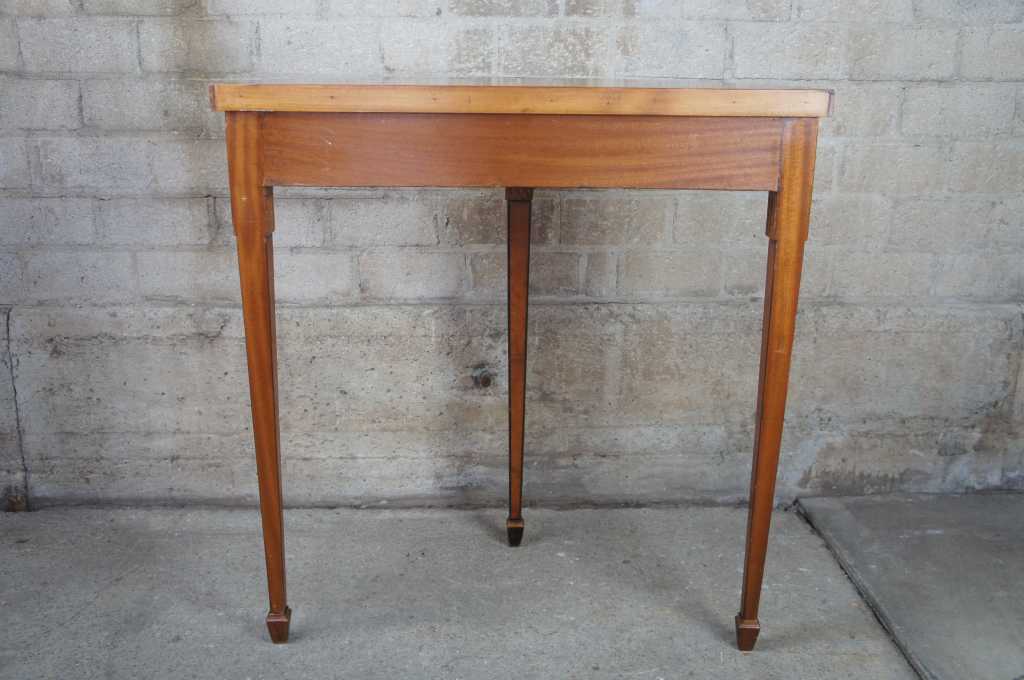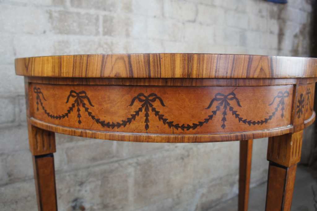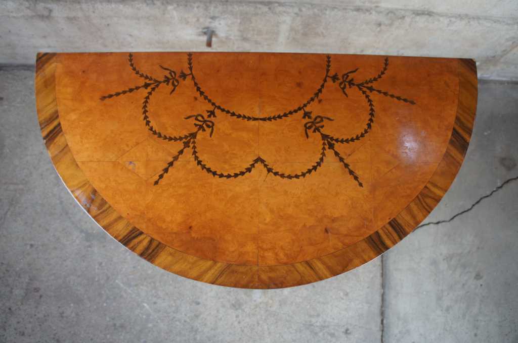 French inspired neoclassical console table with laural inlaid design and u banded edges. Features three long tapered legs with ebonized inlay leading to spade foot.