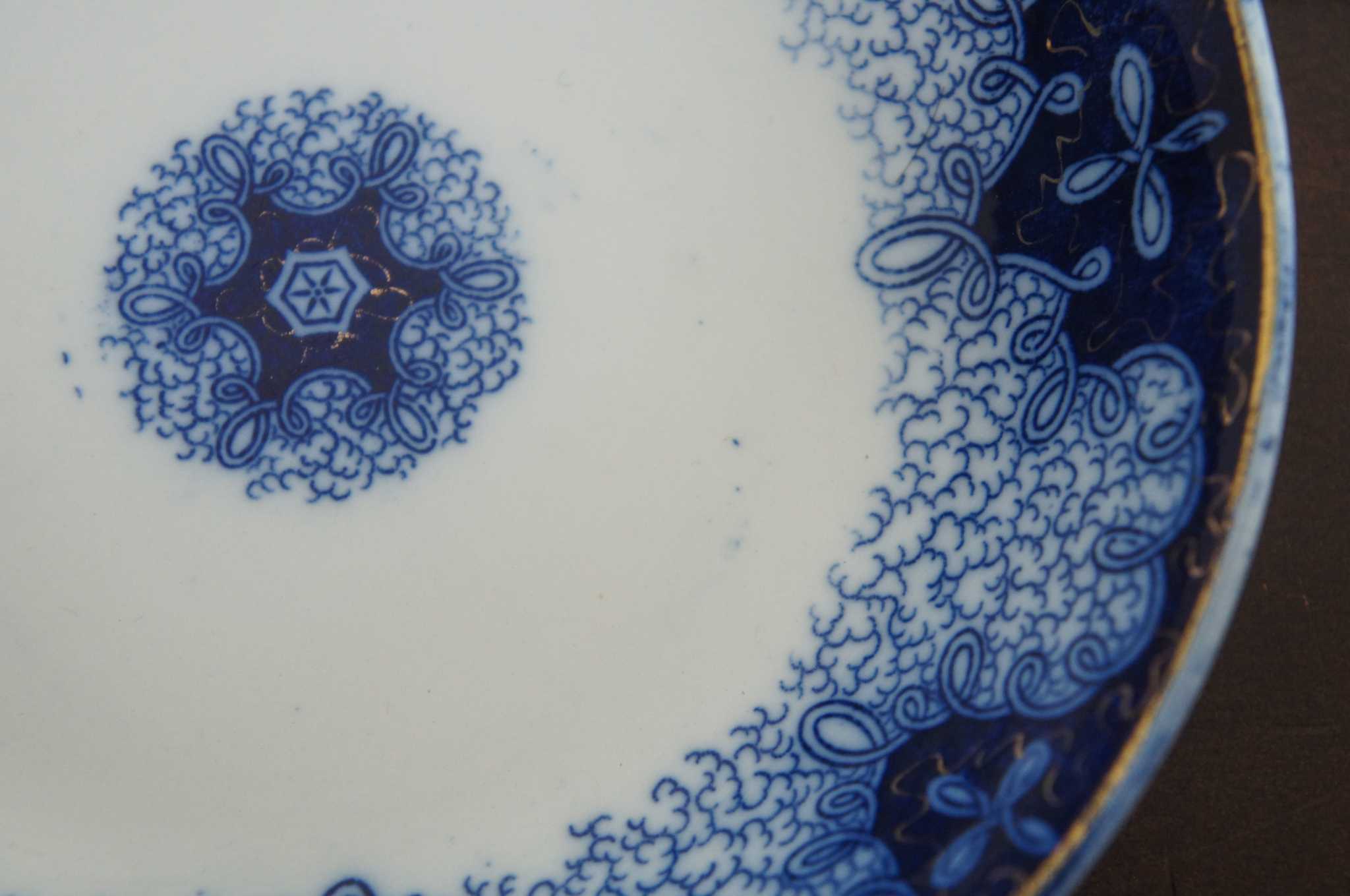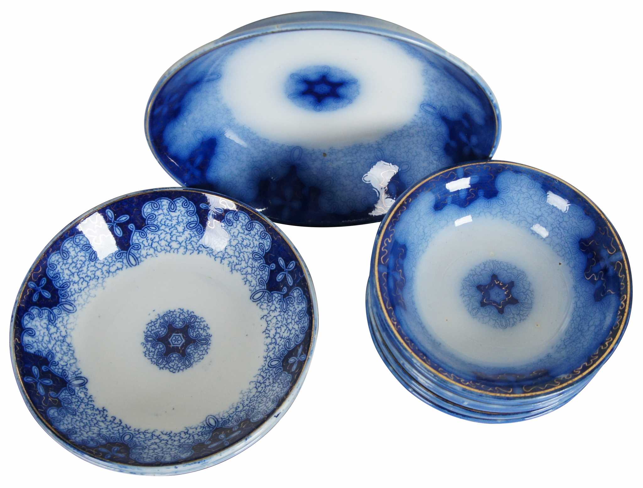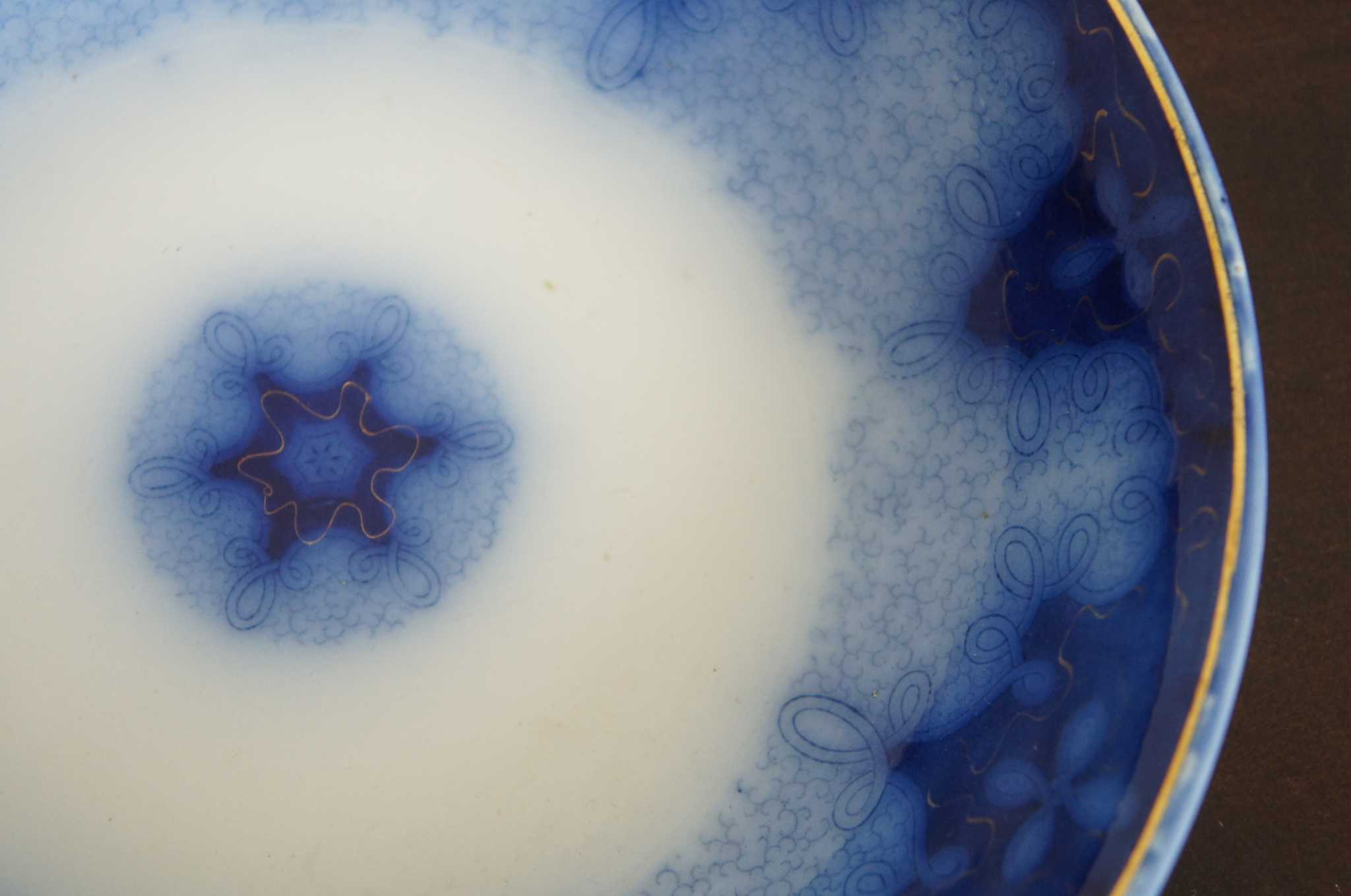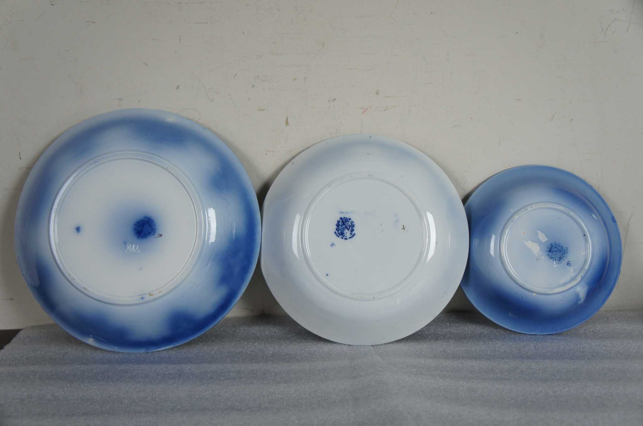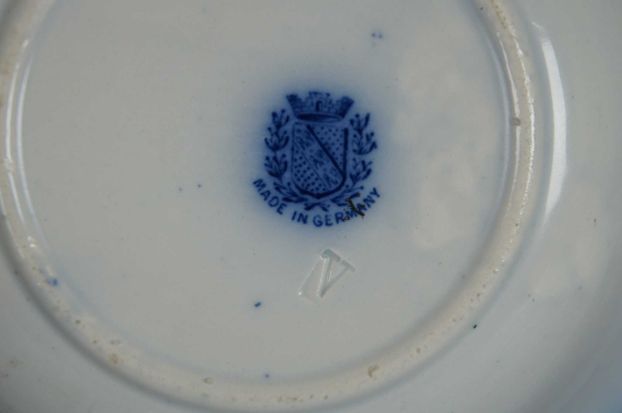 Transferware, flow blue, made of porcelain. Made in Germany by Utzschneider & Co in the late part of the 19th century. Three different sizes.