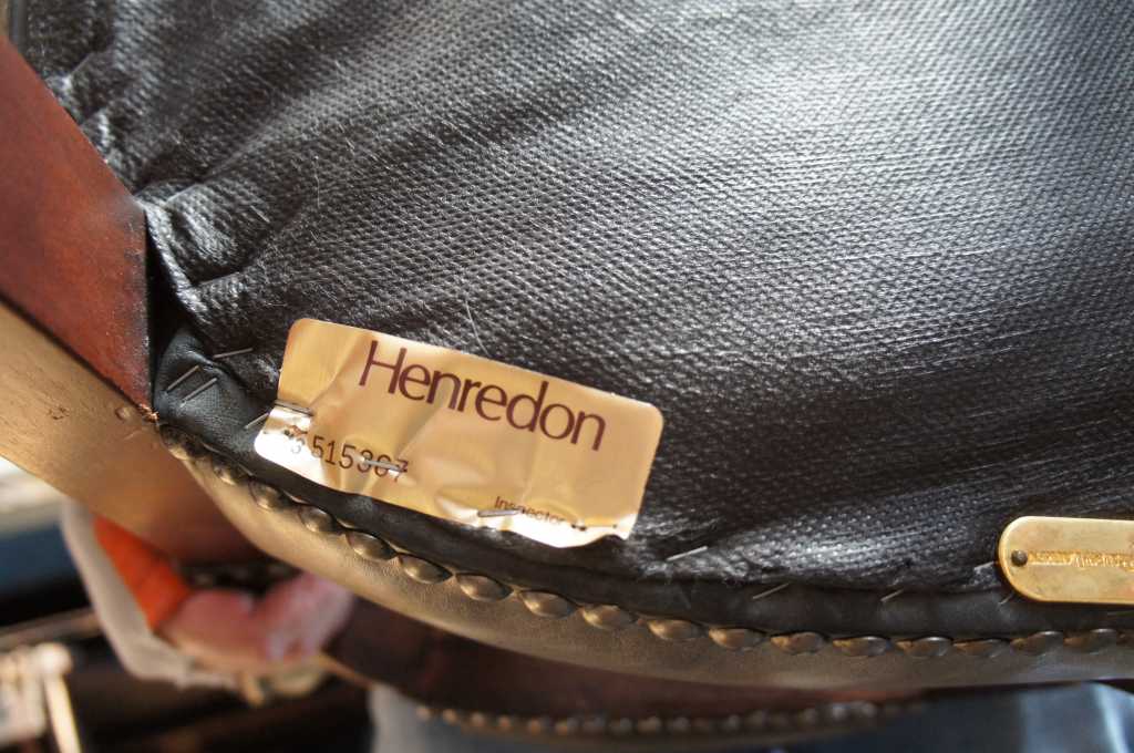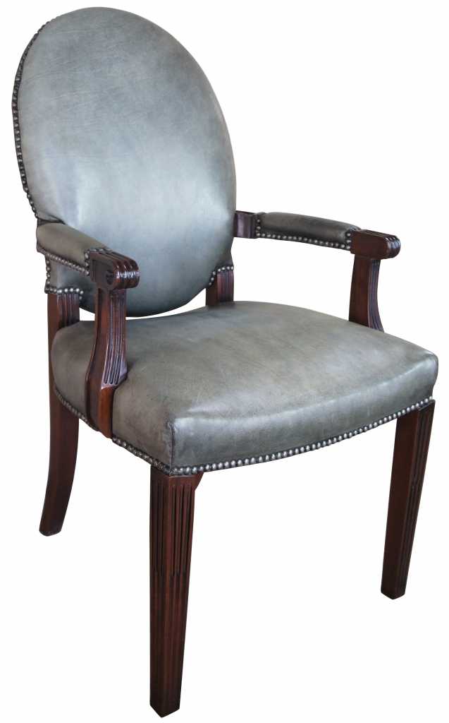 Traditional inspired arm chairs by Henredon for Ralph Lauren. Made from mahogany with scrolled arms and fluted legs. Features a green leather upholstery with silver nailhead trim.