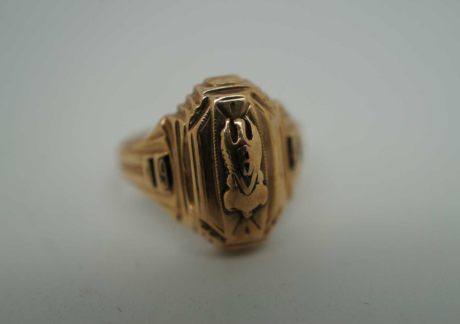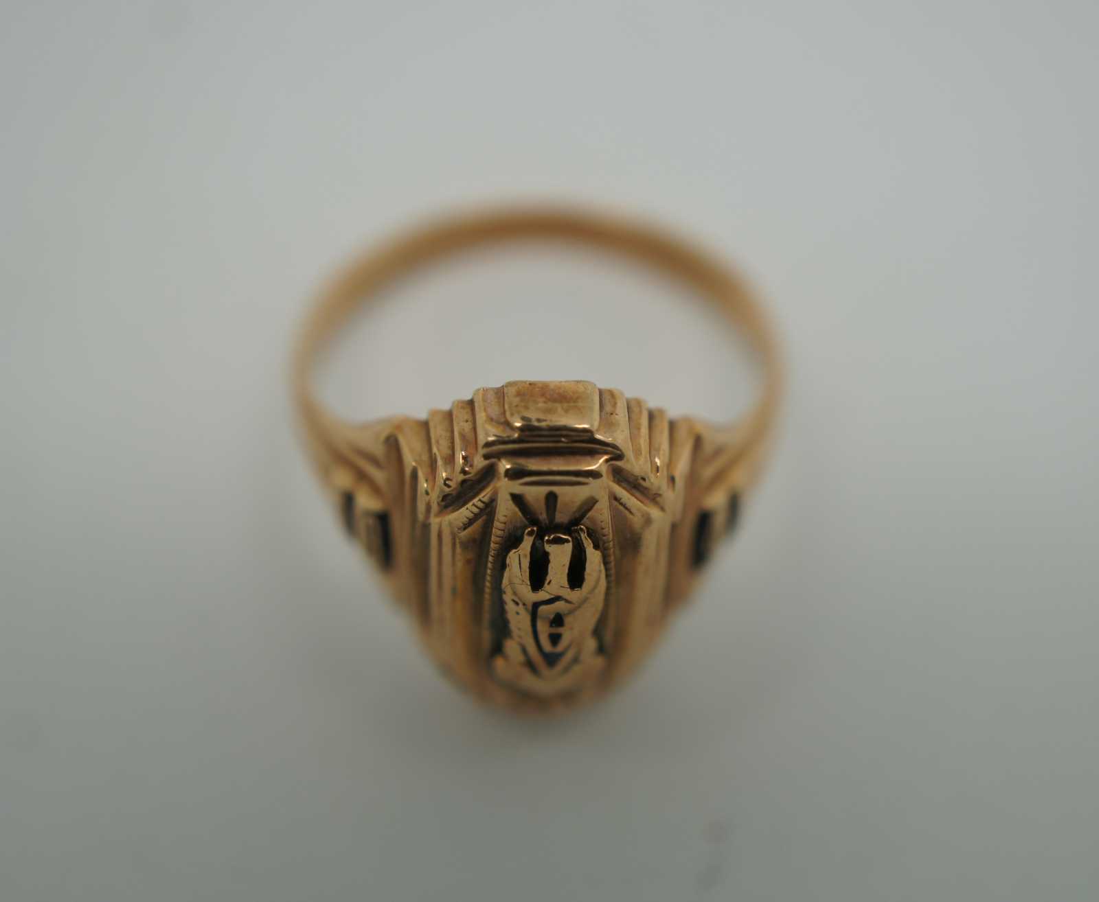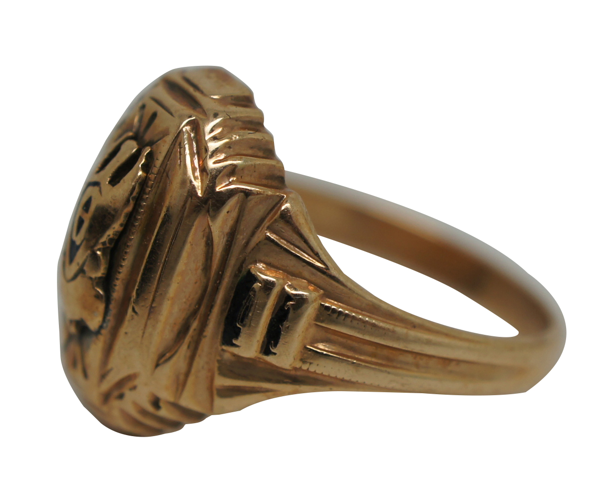 Vintage 1943 Balfour 10K gold highschool class ring. Late art deco styling, features an eagle / bird with a shield / crest. Marked 1943, 10K gold, monogrammed MCF, Size 6. Weighs 4.8 grams.
