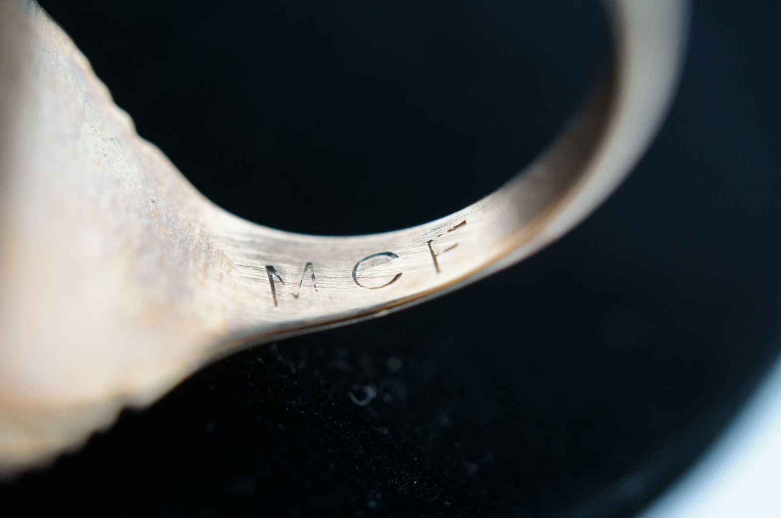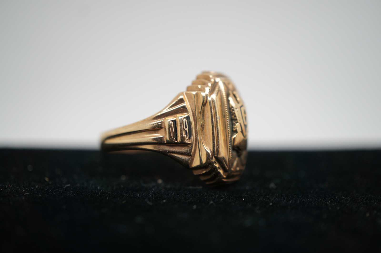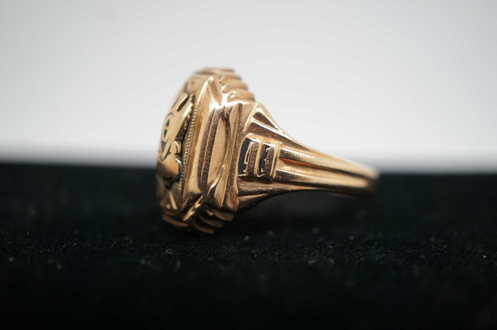 Vintage 1943 Balfour 10K gold highschool class ring. Late art deco styling, features an eagle / bird with a shield / crest. Marked 1943, 10K gold, monogrammed MCF, Size 6. Weighs 4.8 grams.
