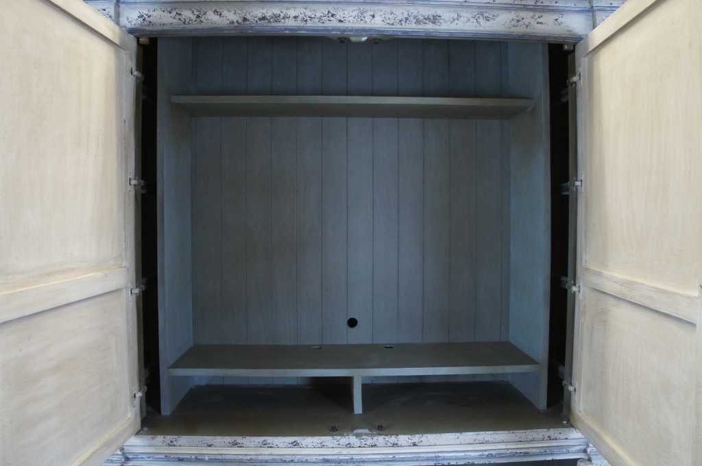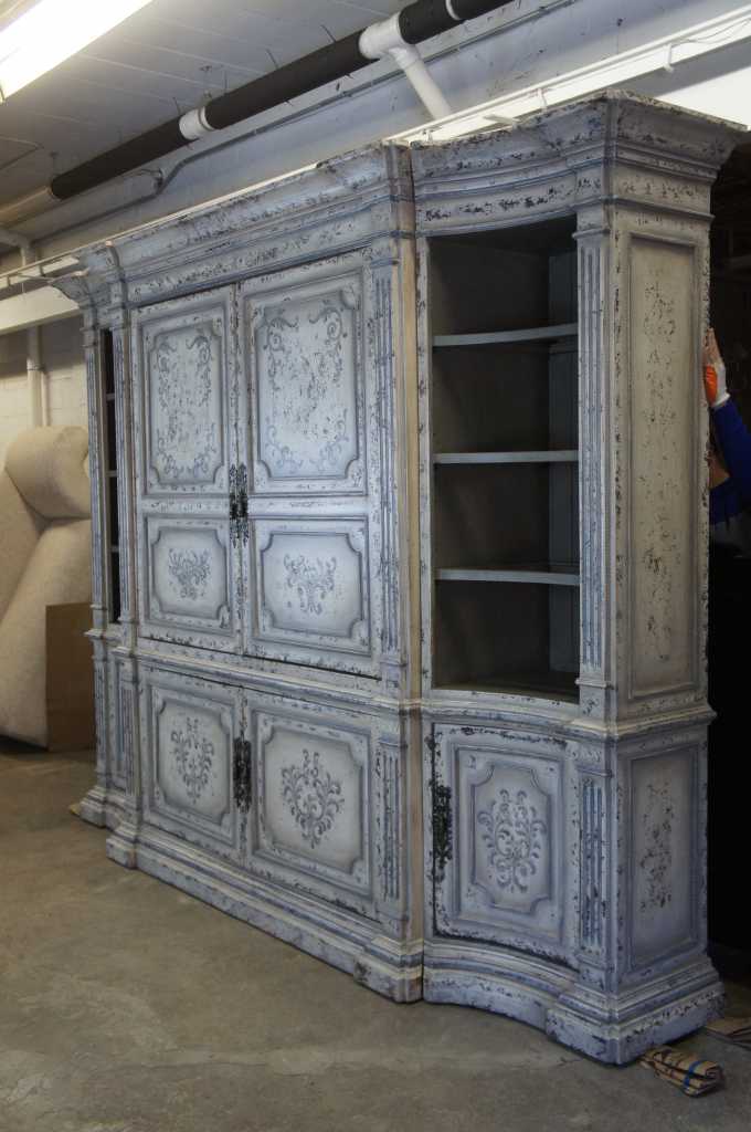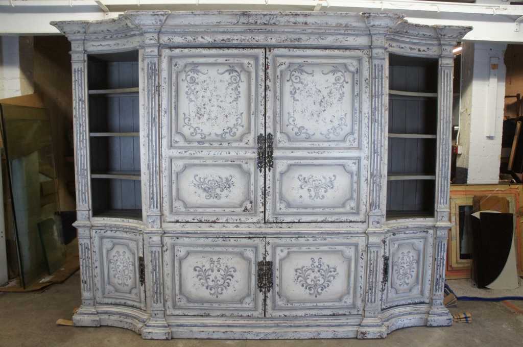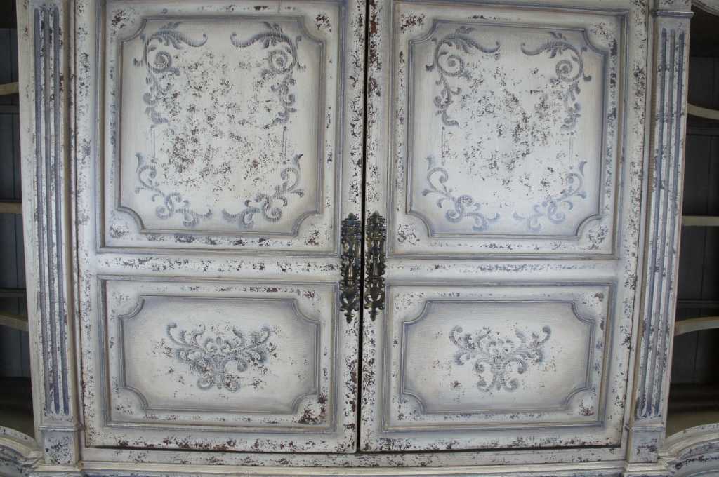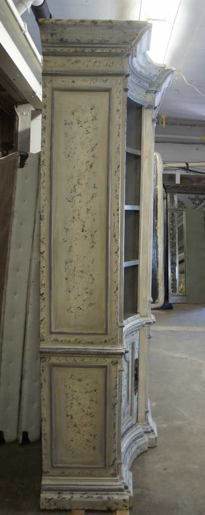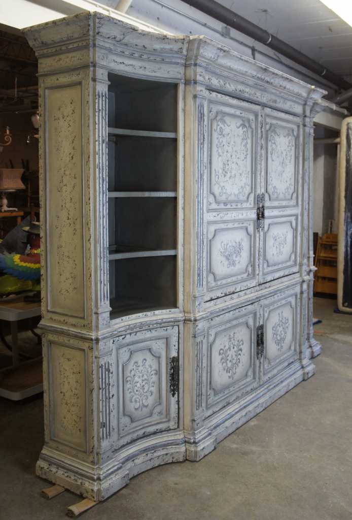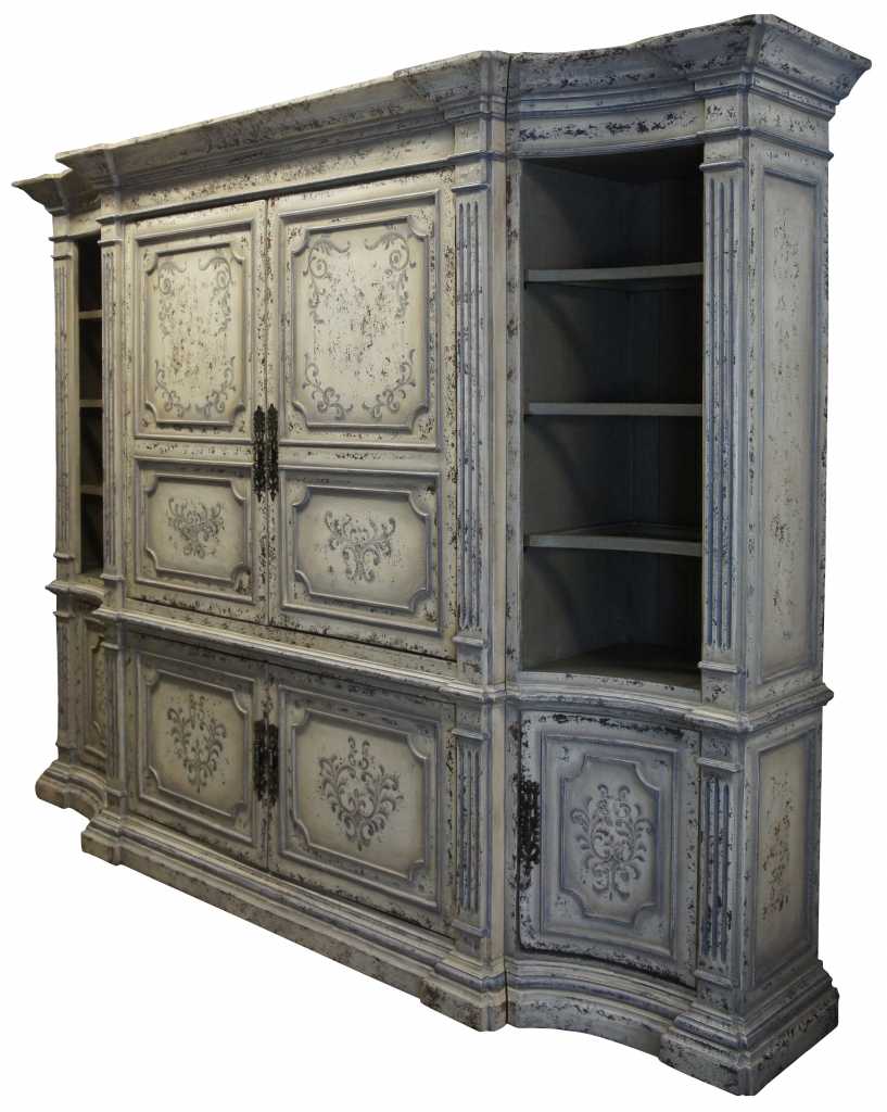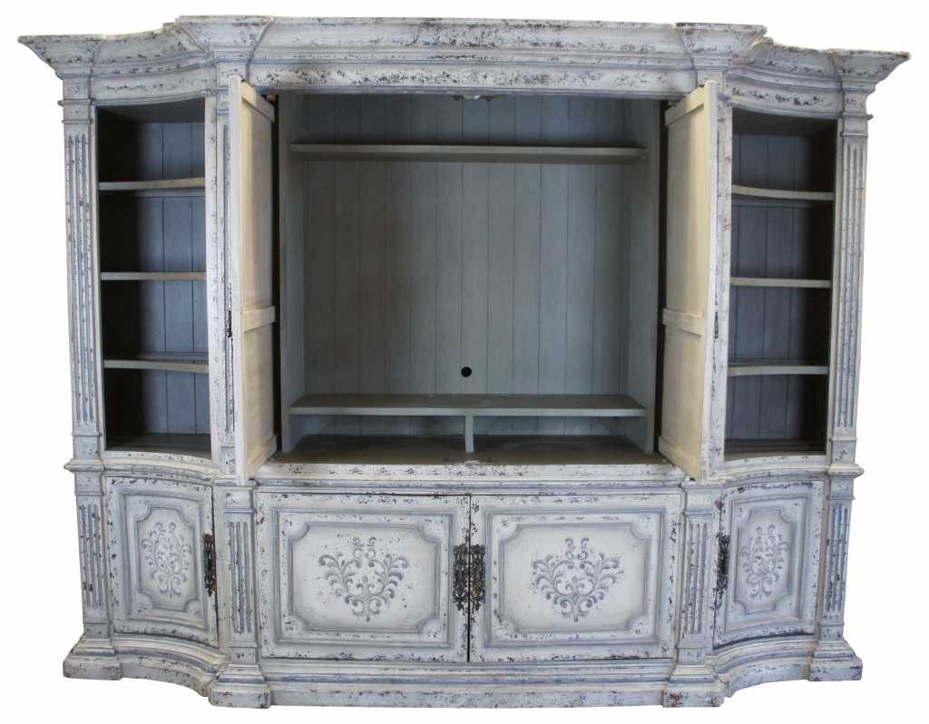Italian inspired distressed white media cabinet with bookcases. An architectural design with four raised and fluted columns along the front. Features paneled doors with floral scrolled deisgn. Side bookcases have three adjustable shelves with glass inserts. Doors recess for video viewing.