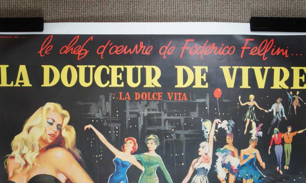 Original 1960 French poster by Yves Thos for the film La Dolce Vita directed by Federico Fellini with Marcello Mastroianni / Anita Ekberg / Anouk Aimee / Yvonne Furneaux. Very good fine condition, unfolded. Many original posters were issued folded or were subsequently folded, but this one was not.
