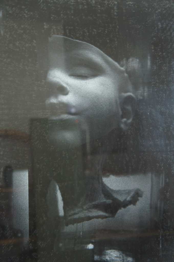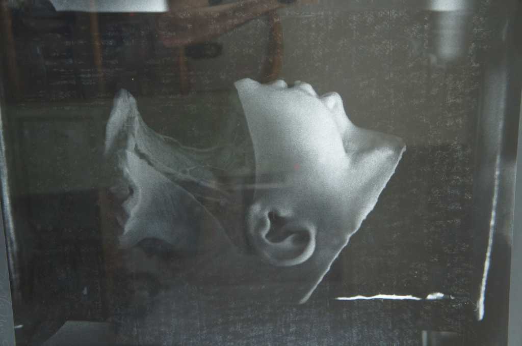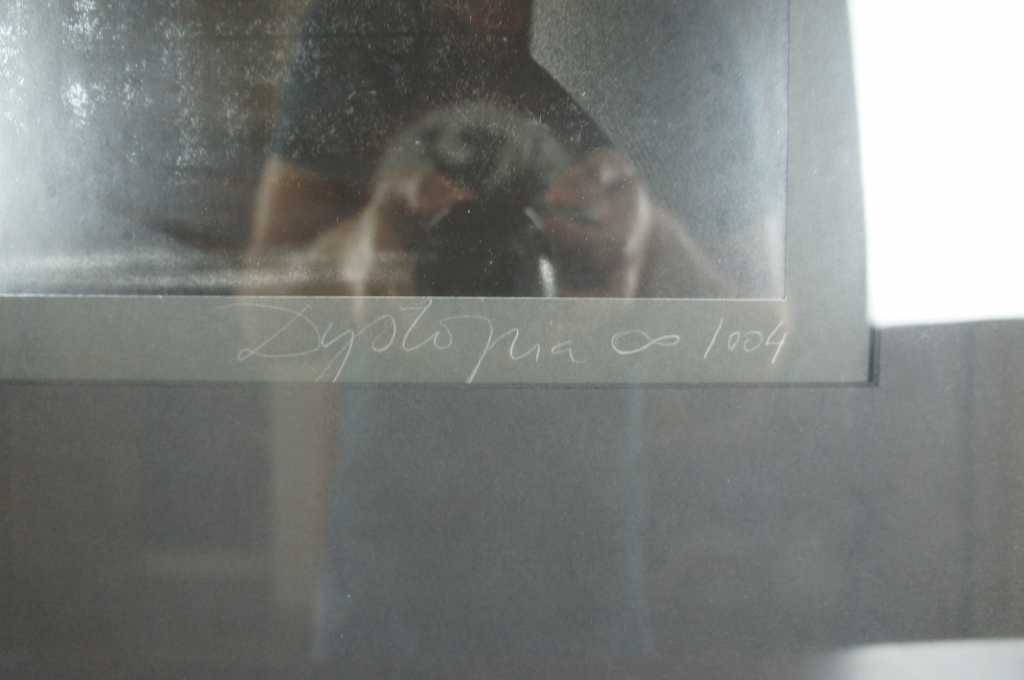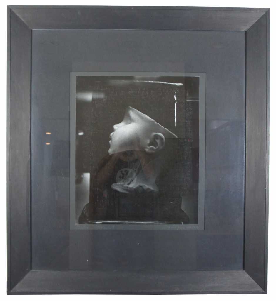 Piameter Dystopia, 1987 by the feminist artist Orshi Drozdik, born 1946 in Hungary, but currently based in New York City. Features 2 large format black and white photographs of a head in a jar. Framed in black with black mat. Pencil signed with label along the back.