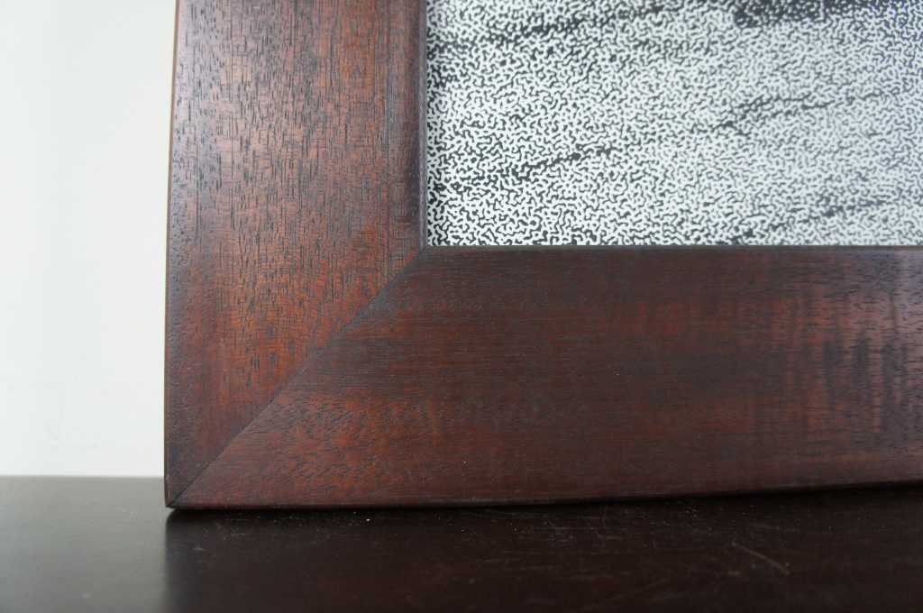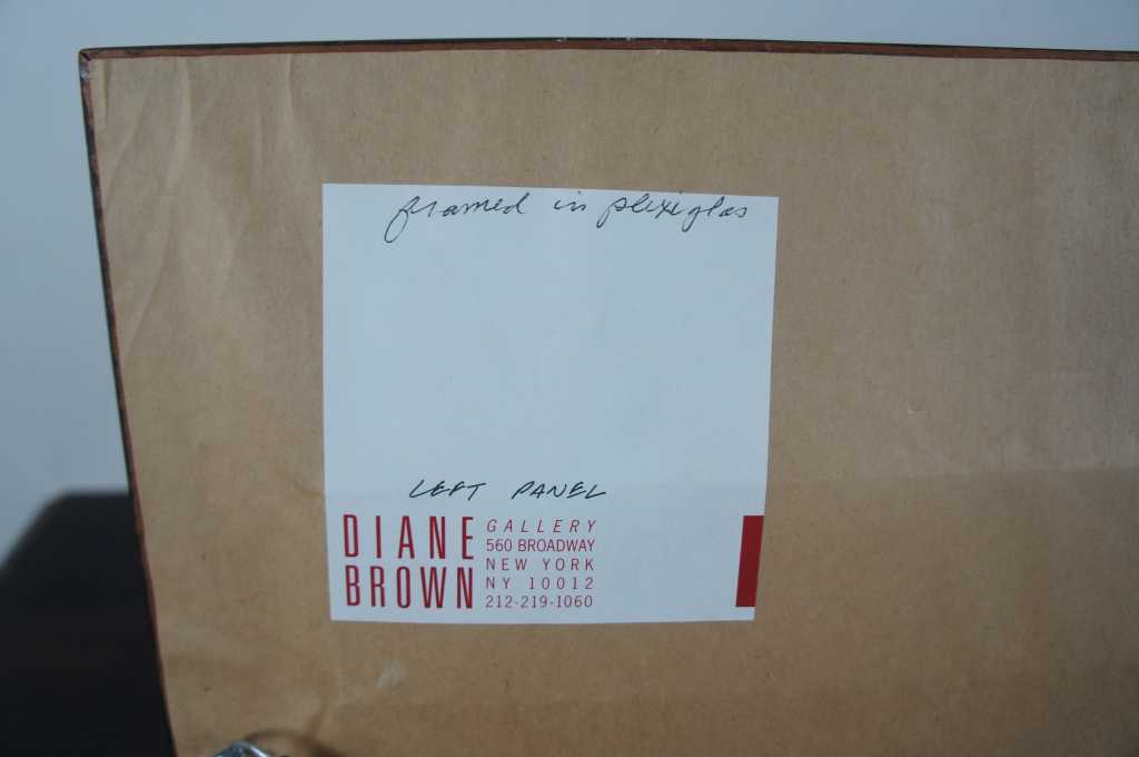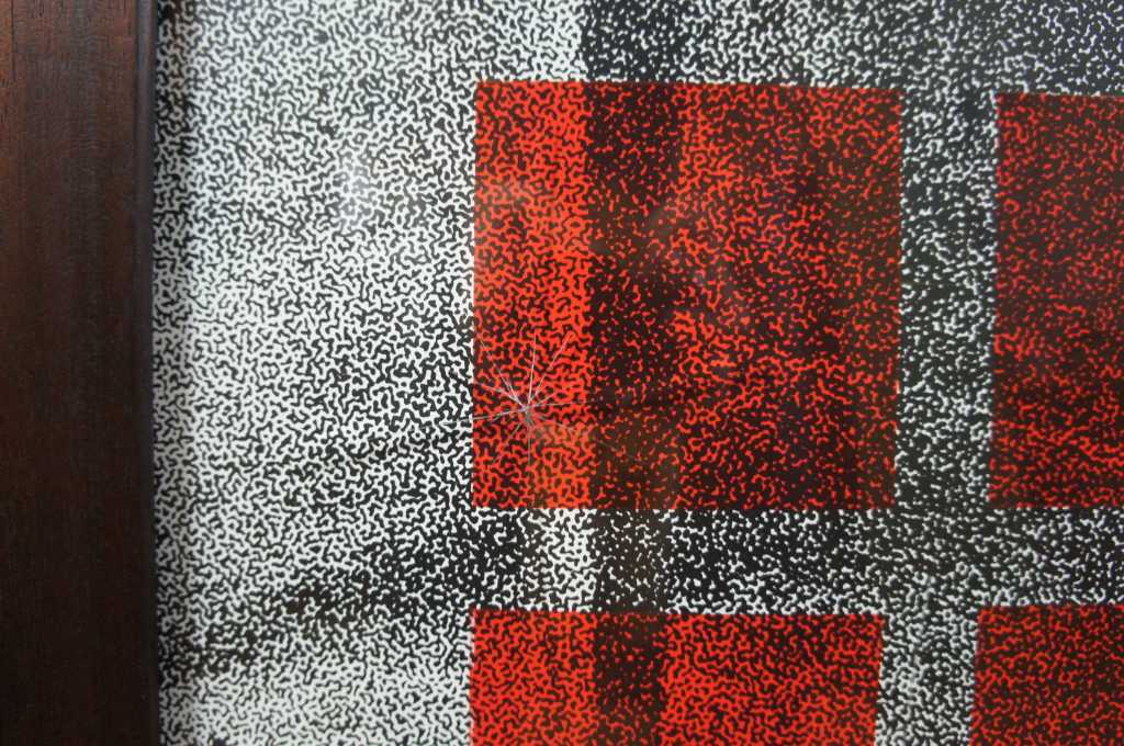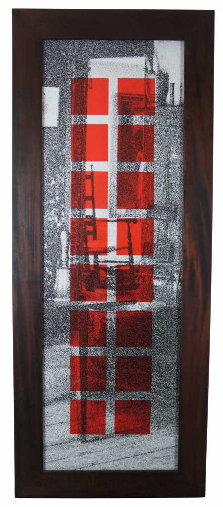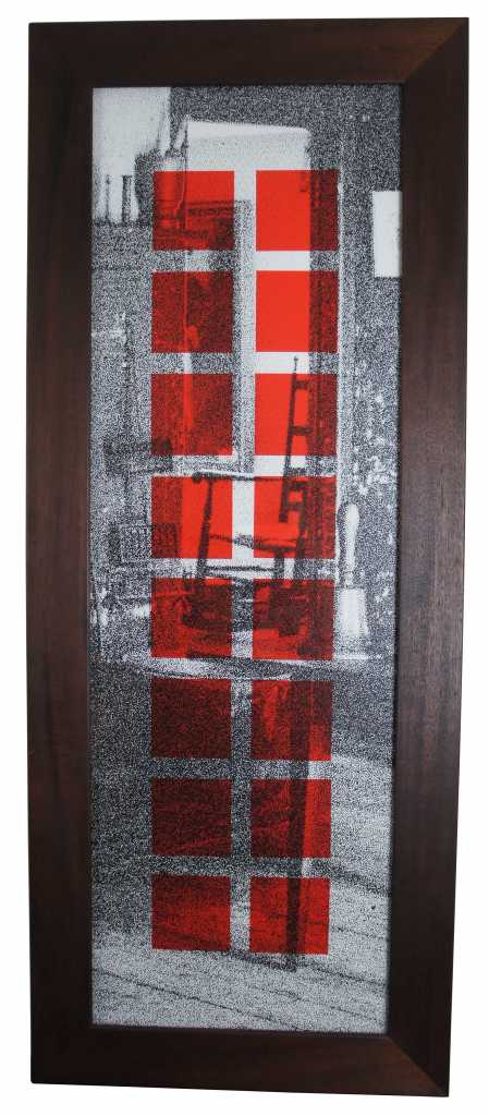 "A pair of prints by Susan Ewing, Untitled. The red squares distract the eye from seeing the subject behind. A home setting in the background showing a rocking chair, stove and other furniture. The prints are mirrored to face each other. Framed in Mahogany with Plexiglas.