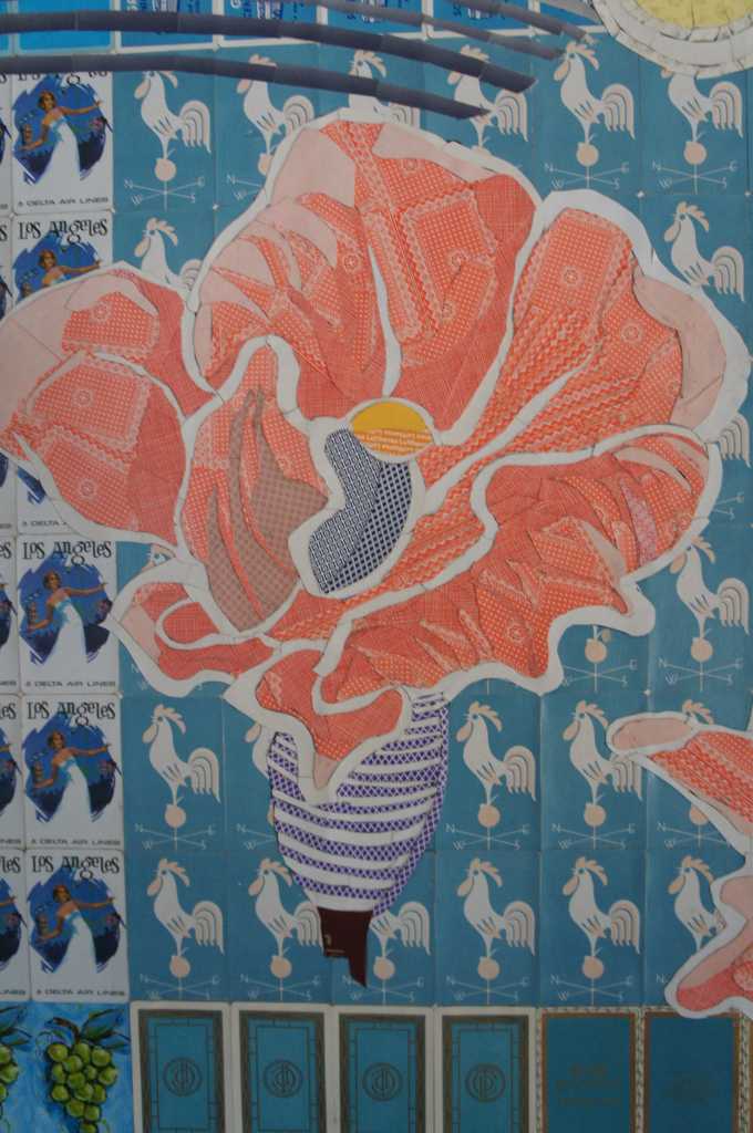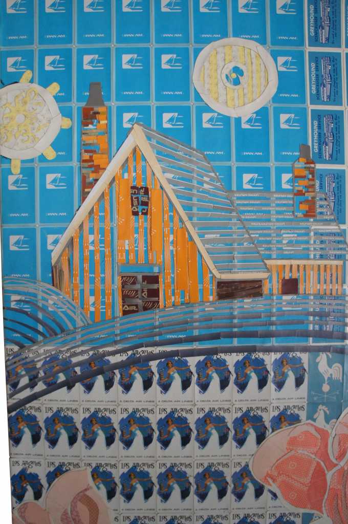 Rural or country themed collage, featuring a rooster perched at the center over a weather vain, with a farmhouse, cow, florals, fish, grapes and more!. The text reads, ""It's such a Comfort to take the Bus! ...AND LEAVE THE DRIVING TO US:. Made in 1995 by Robert Heckes (B. 1966)