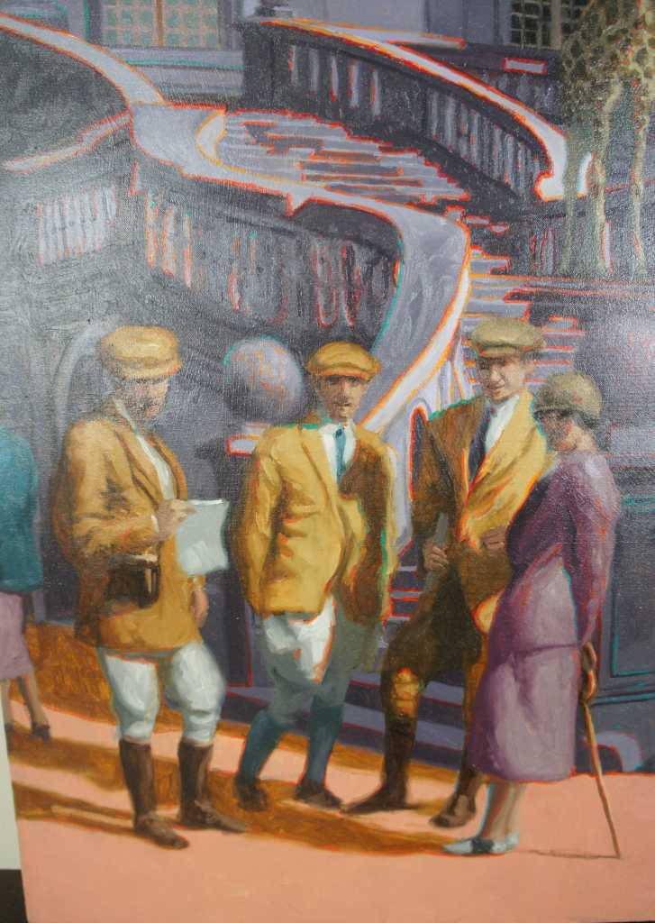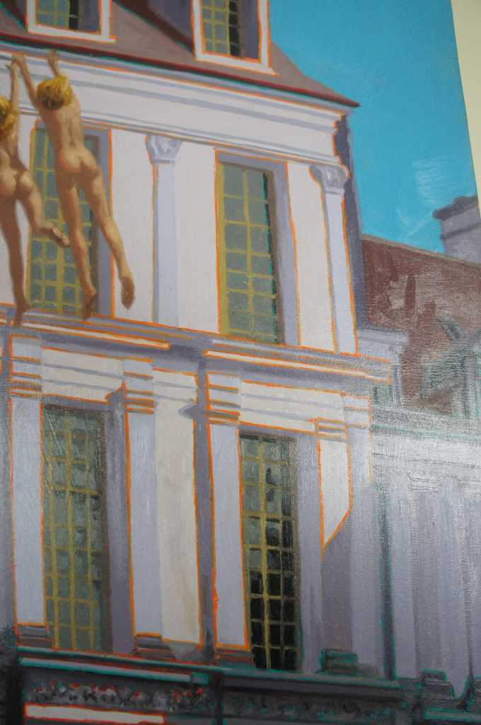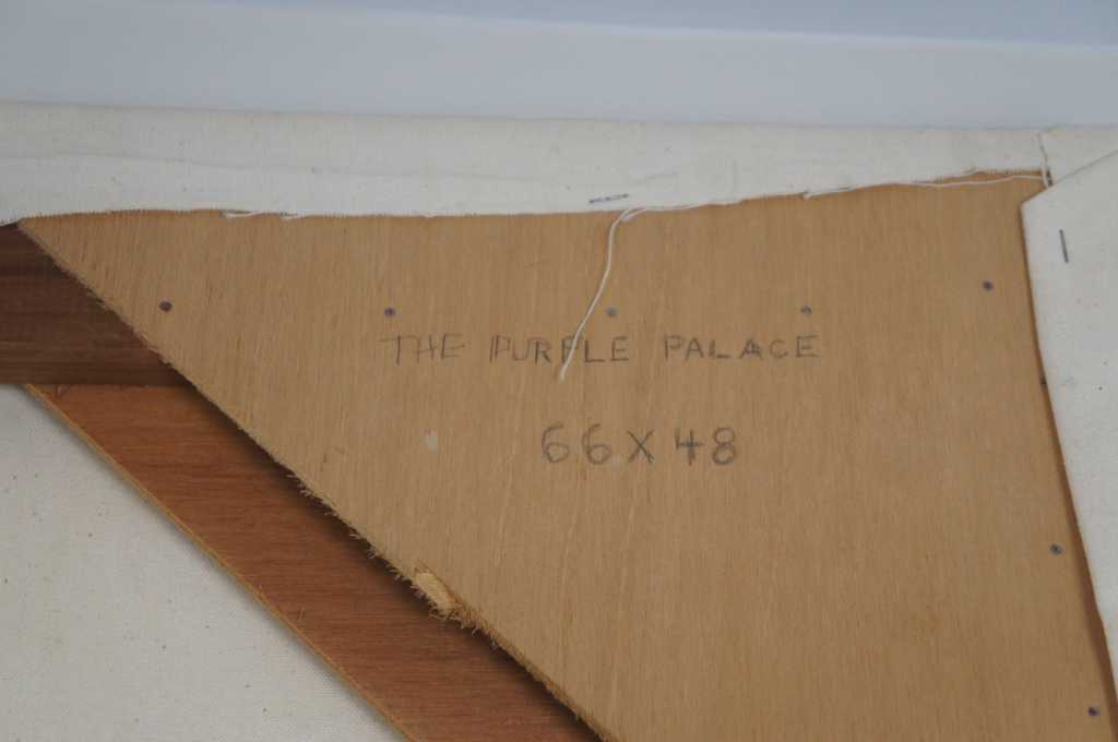 A whimsical oil painting featuring a circus of sorts outside of a grand purple Victorian home. Several nude women can be seen floating and walking about amongst a giraffe, rhinoceros and formal dressed group. Signed lower right, R George