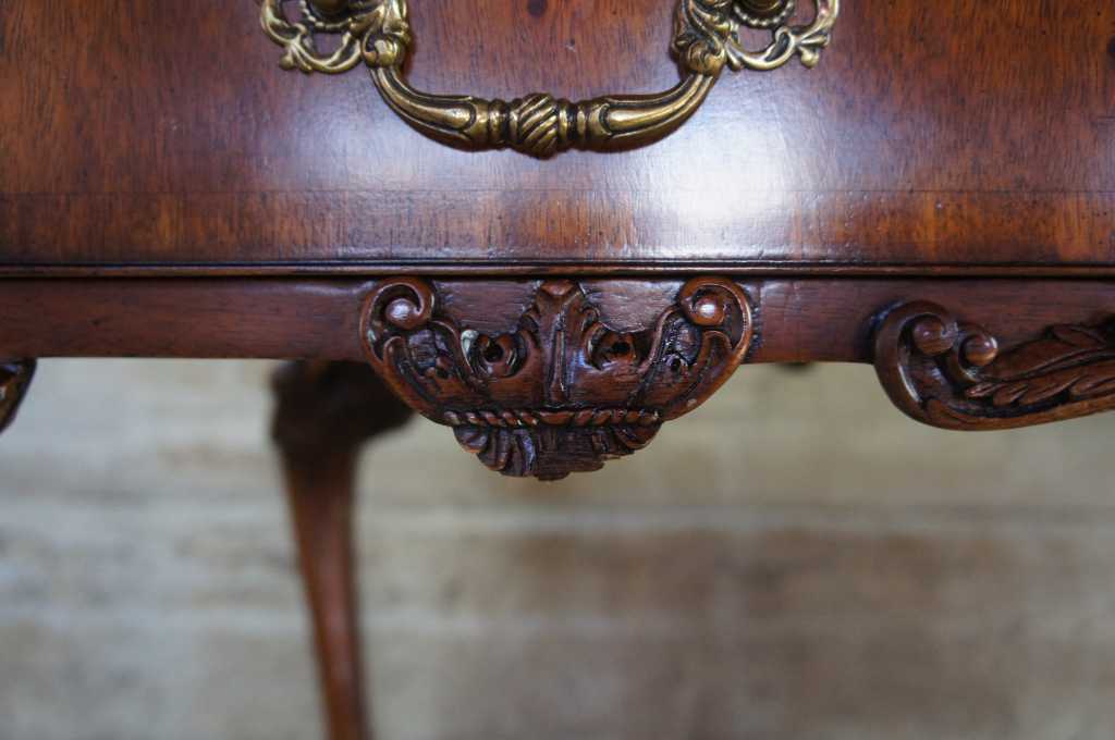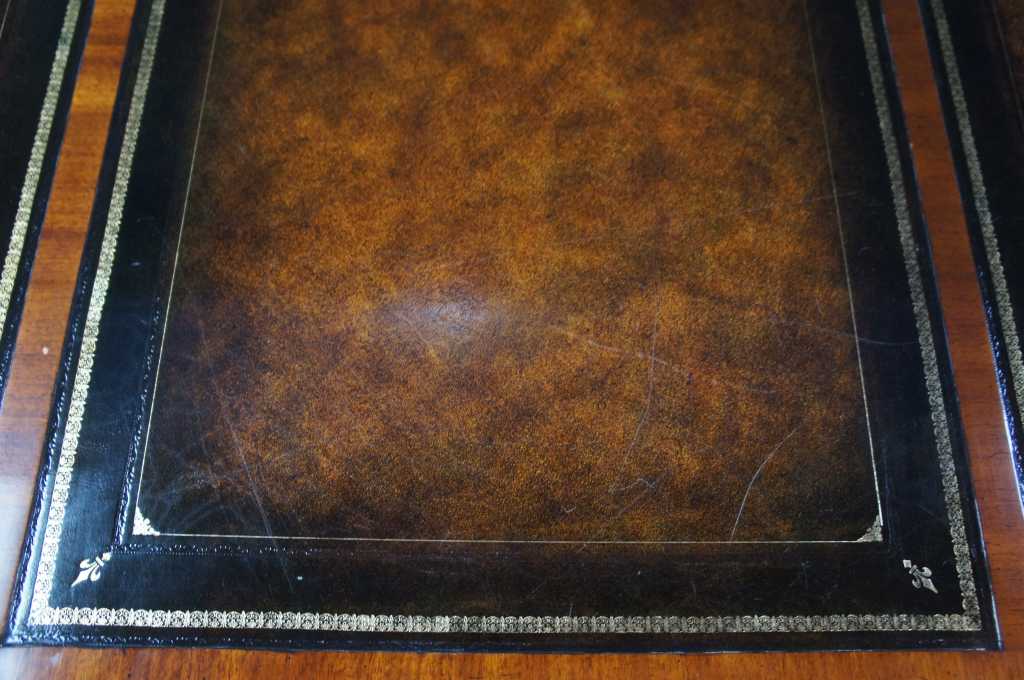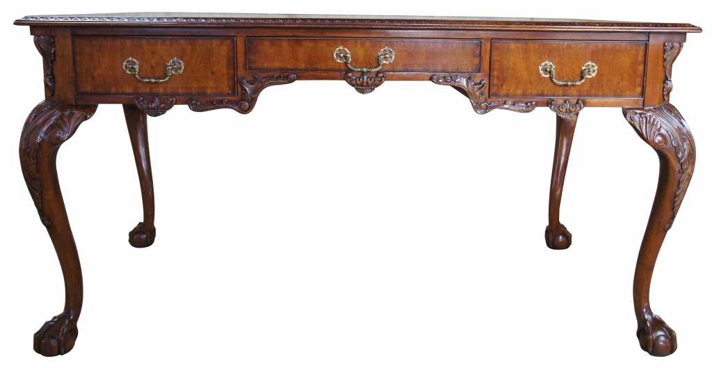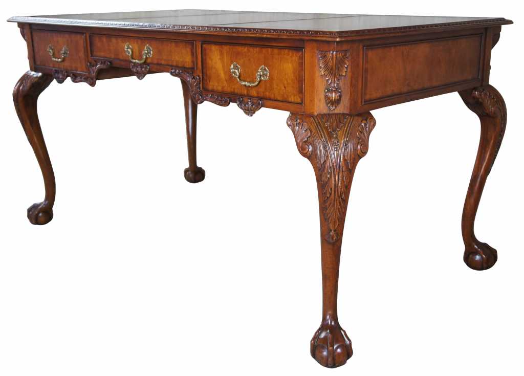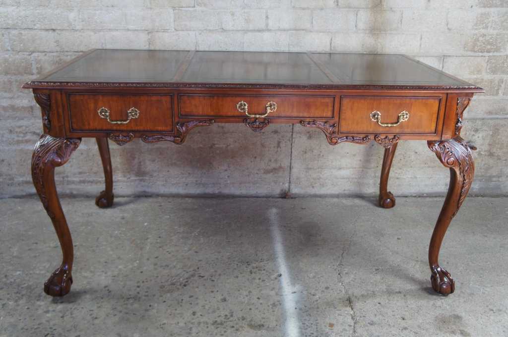 Chippendale style library or office desk by Maitland Smith. Made from mahogany with intricatley carved details including high relief acanthus legs leading to ball and claw feet. Features a three panel brown and gold tooled leather top with carved scalloped apron and three long drawers. Drawers are banded with brass pulls and neatly framed by ornate trim. Finished on both sides like a partners desk, but with false drawers on front, leaving full length drawers for use.