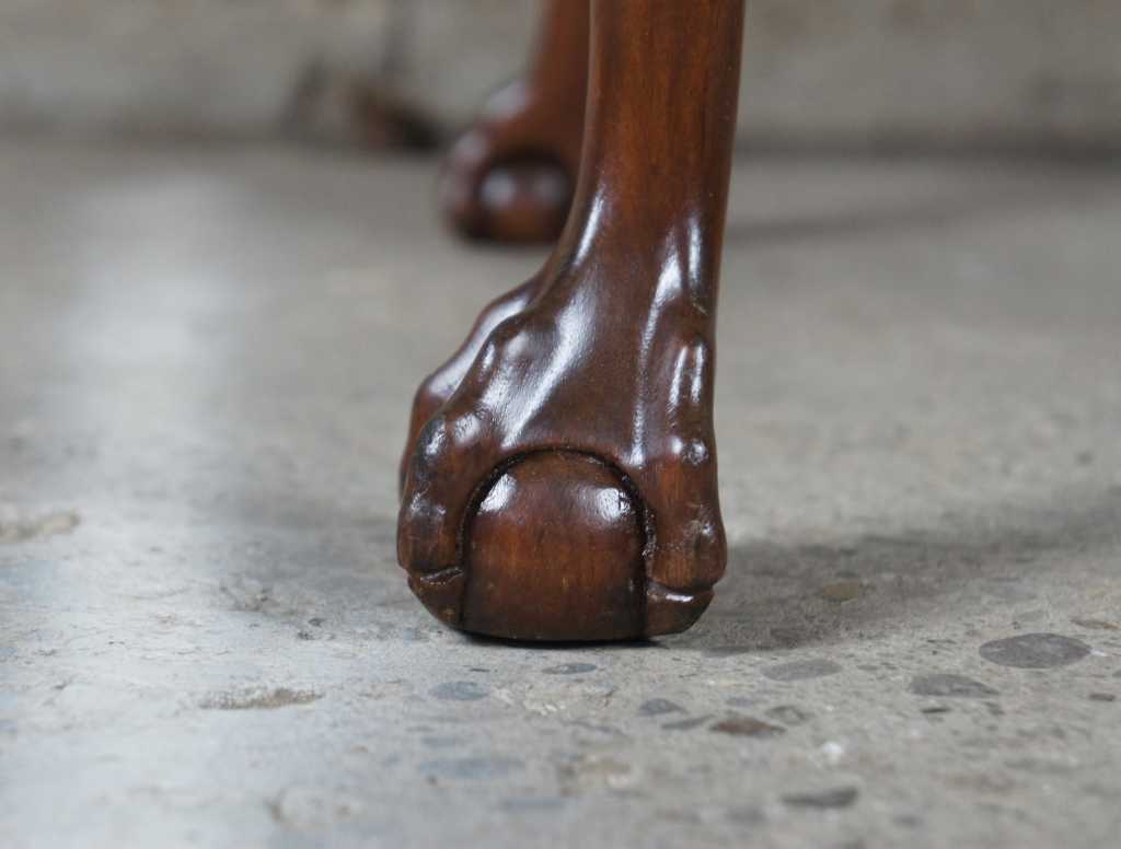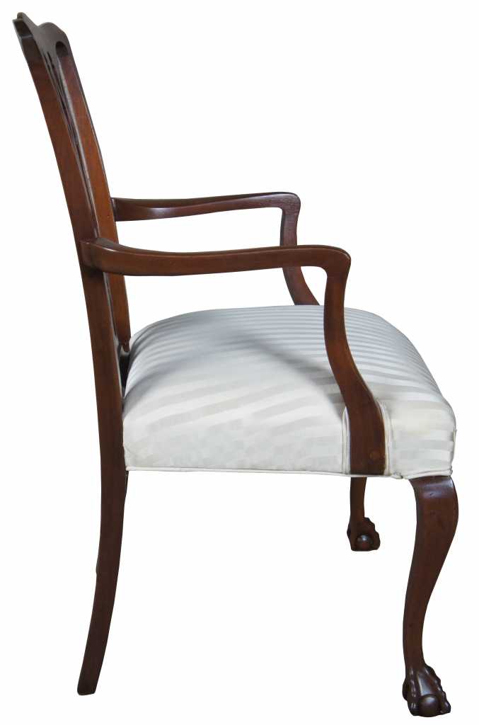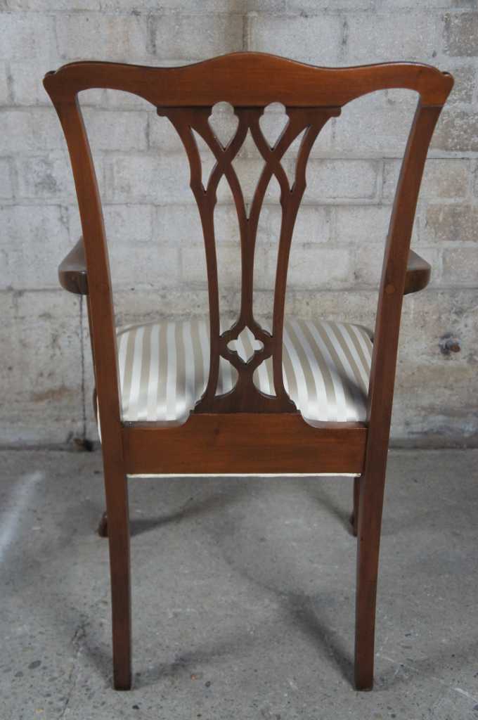 Beautiful antique chippendale style mahogany arm chair. Features dark wood and striped cushion.