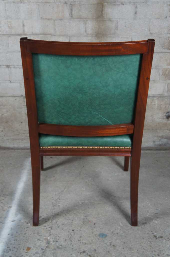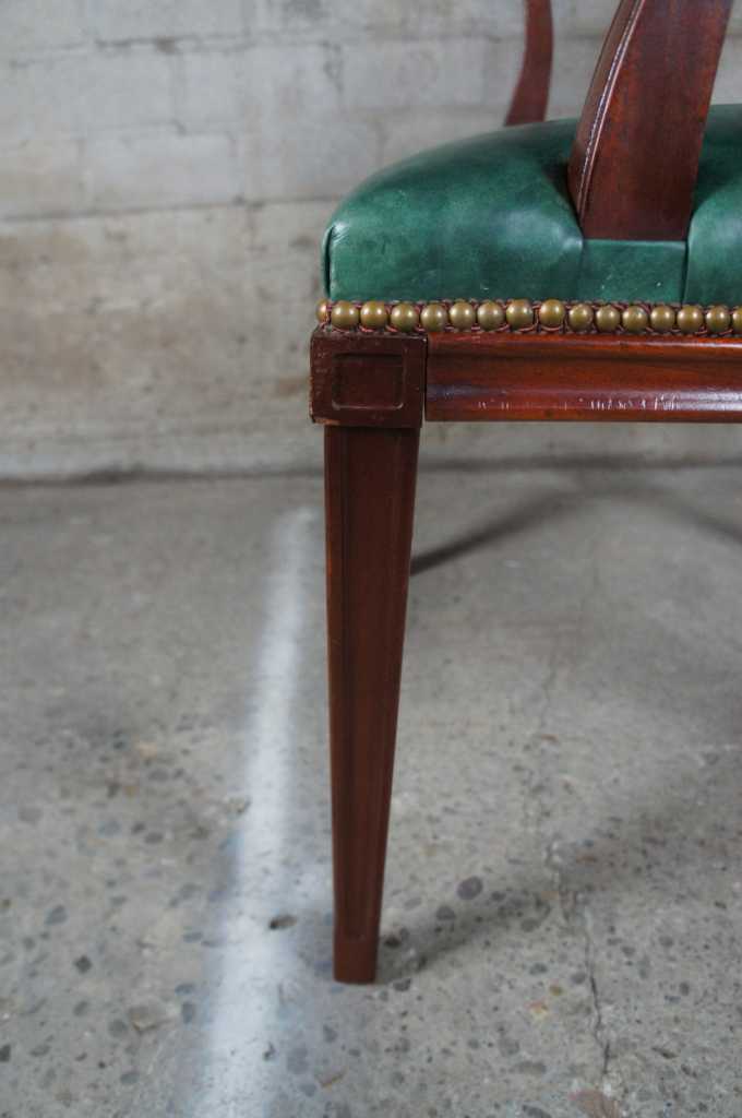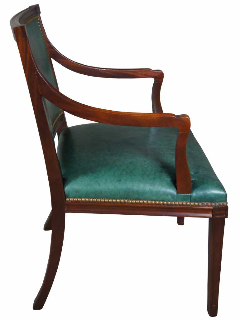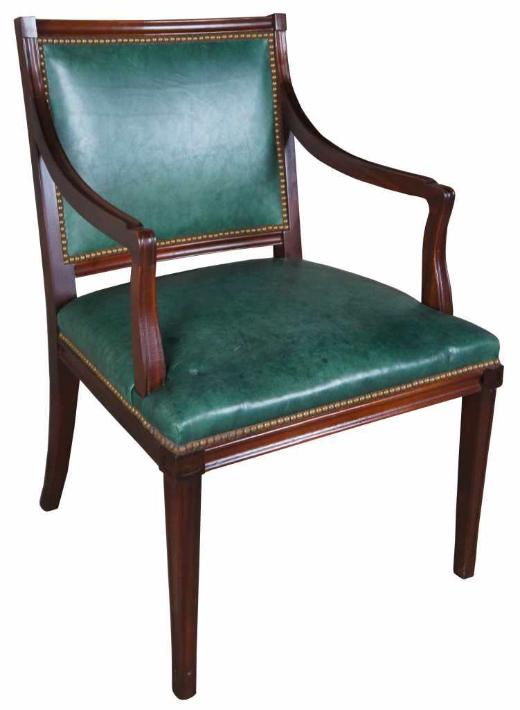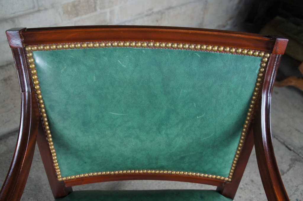 Vintage mid century arm chair bu Hickory Chair Company. Features the finest green leather with nailhead trim on solid mahogany frame.