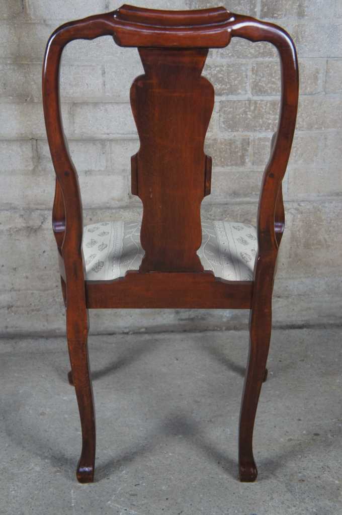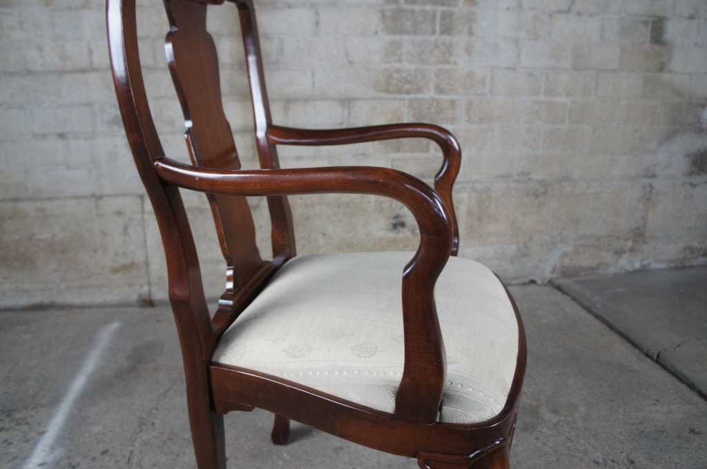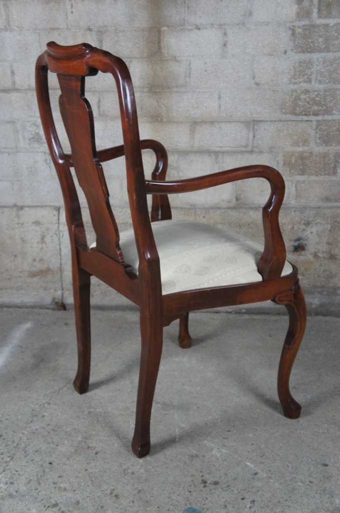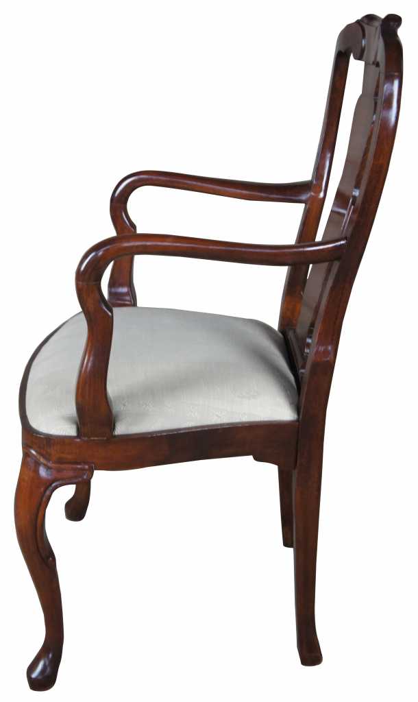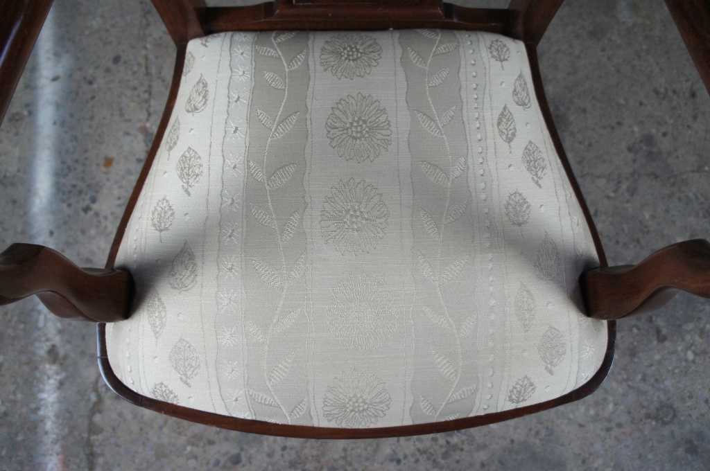 20th century mahogany queen anne style arm chair. Features high arms and slipper feet with a white floral motif fabric showing leaves, vines and flowers.