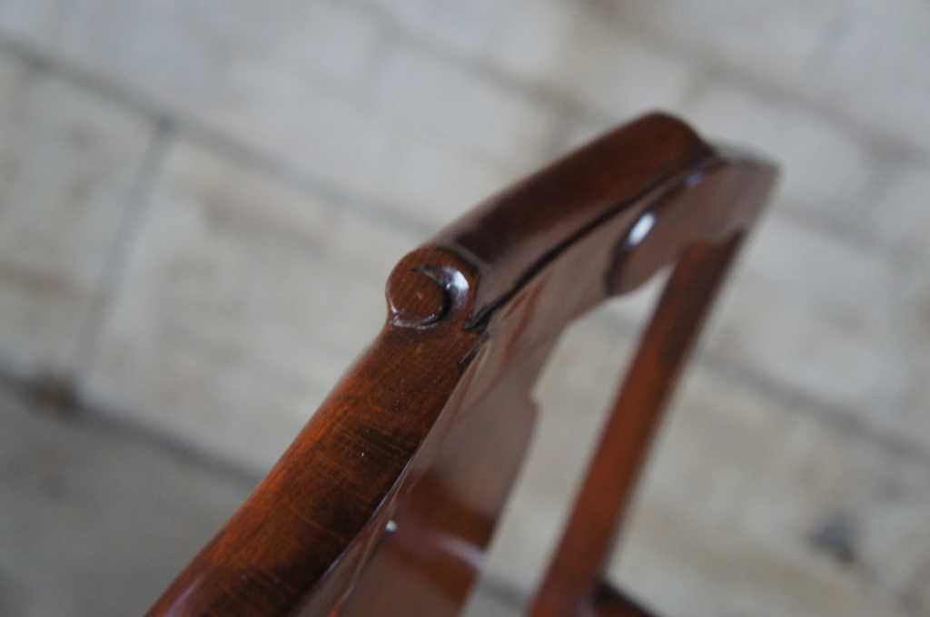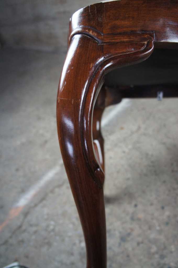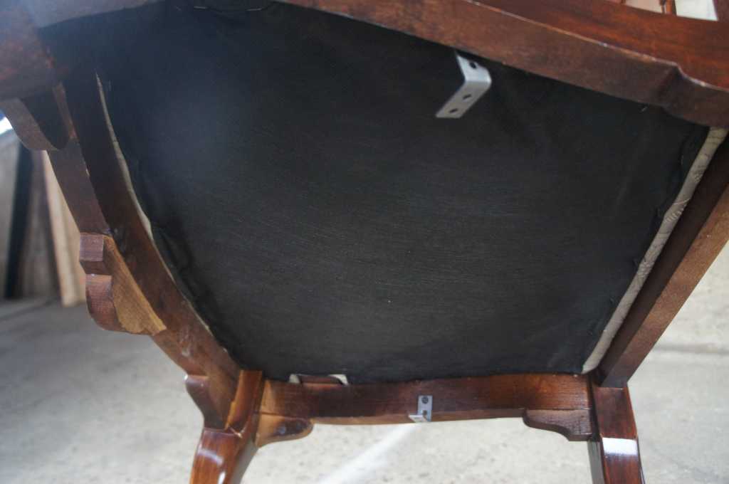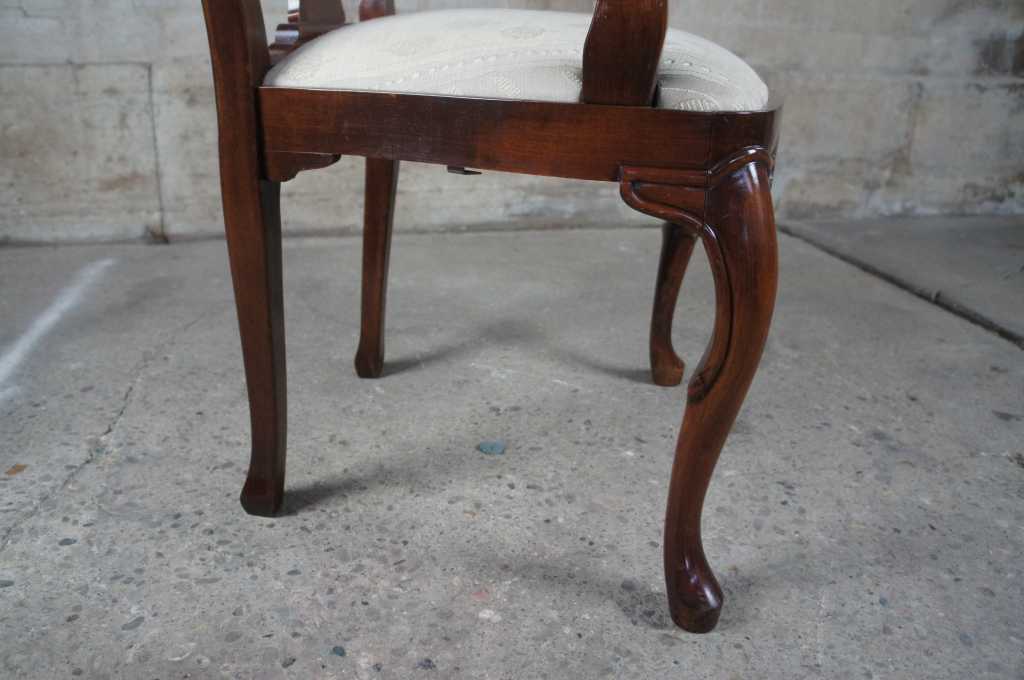 20th century mahogany queen anne style arm chair. Features high arms and slipper feet with a white floral motif fabric showing leaves, vines and flowers.